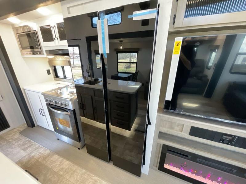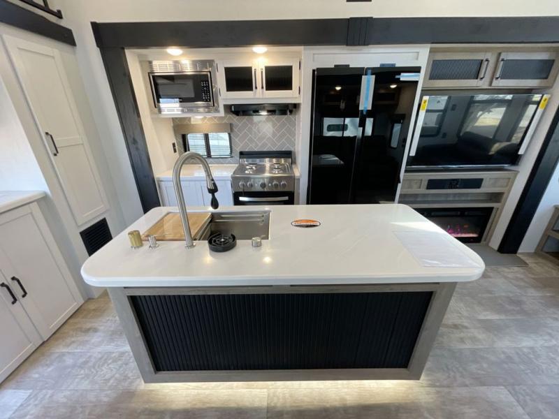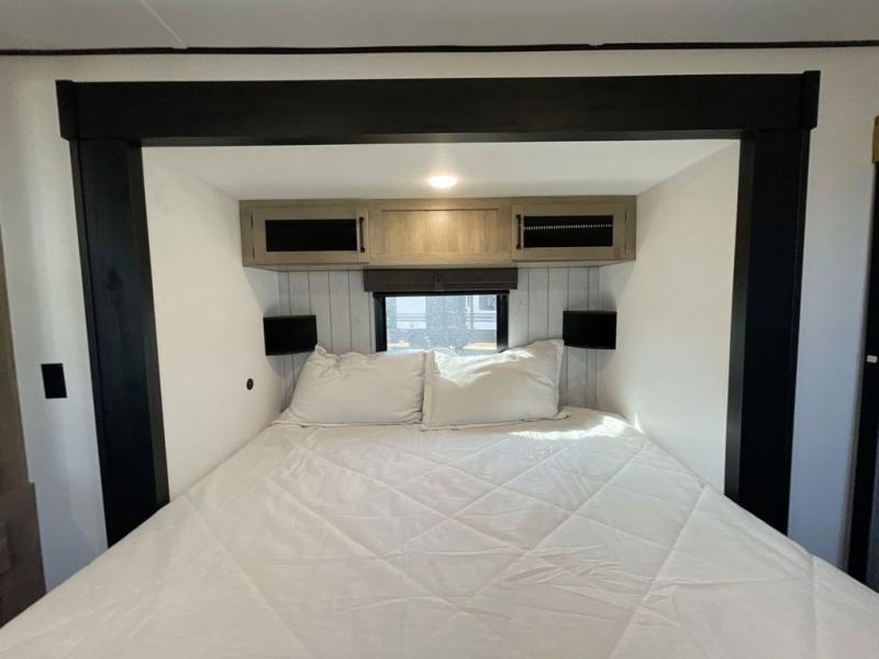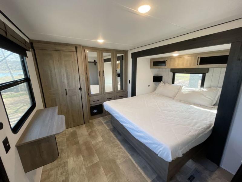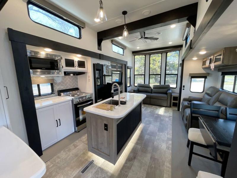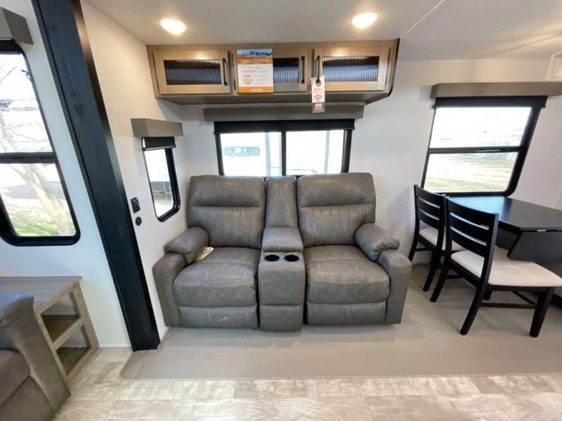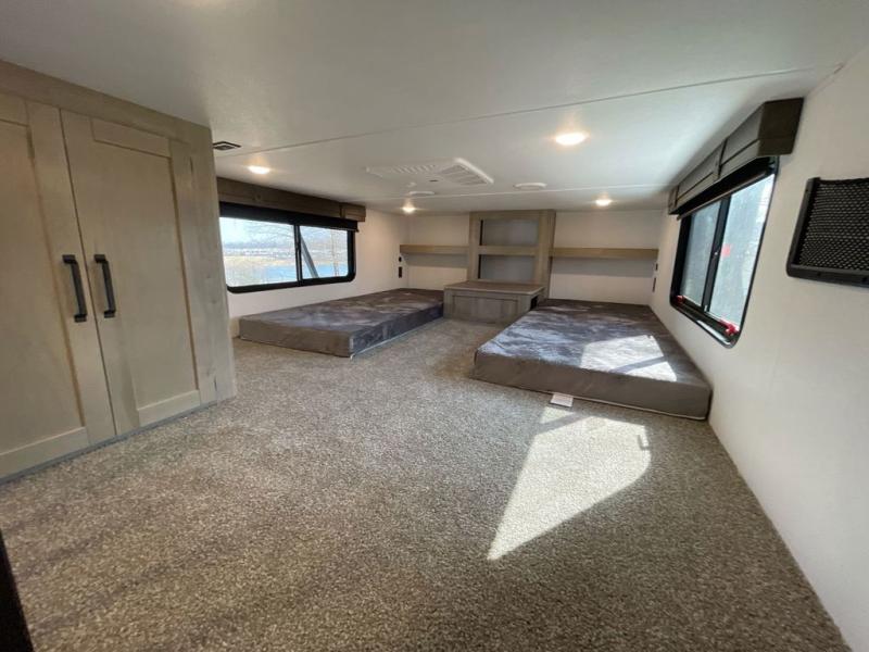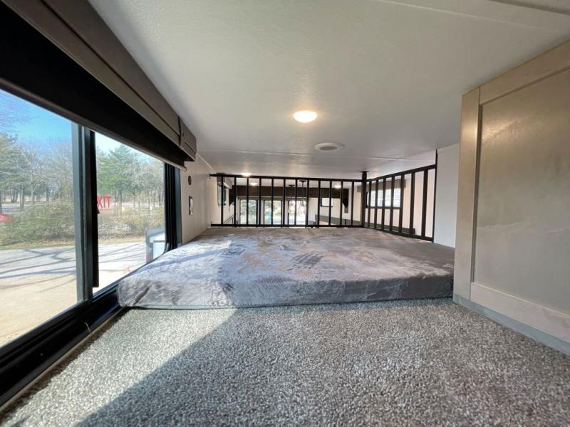 Wherever your destination may be, you can be sure to enjoy it to the fullest with this trailer in tow! With two entry doors, you can enter in through the rear private bedroom or the main living area. The bedroom includes a king bed slide out, a wardrobe/closet to keep your clothes organized, plus a closet with the option to add washer and dryer prep. Just outside this room are steps that lead to the large loft area with a 58" x 58" bunk mat and a cabinet on one side, plus two 32" x 69" bunk mats on the other. There is also a cabinet and a wardrobe/closet for plenty of storage space. Once you've headed back downstairs, you can relax on the dual recliners, front sofa, or free-standing table with a bench and two seats. And the chef of your group will love the kitchen with its residential style refrigerator and pantry, kitchen island, and four burner cooktop!