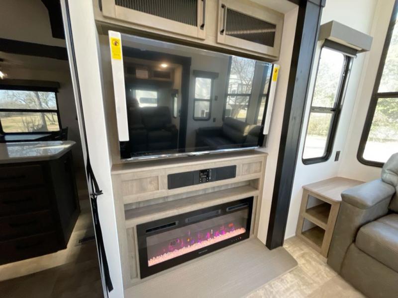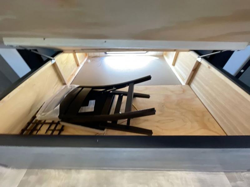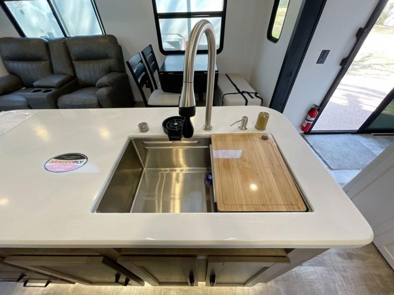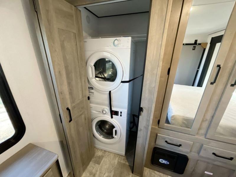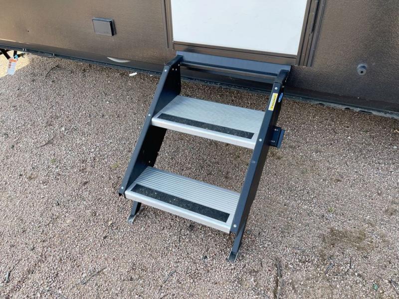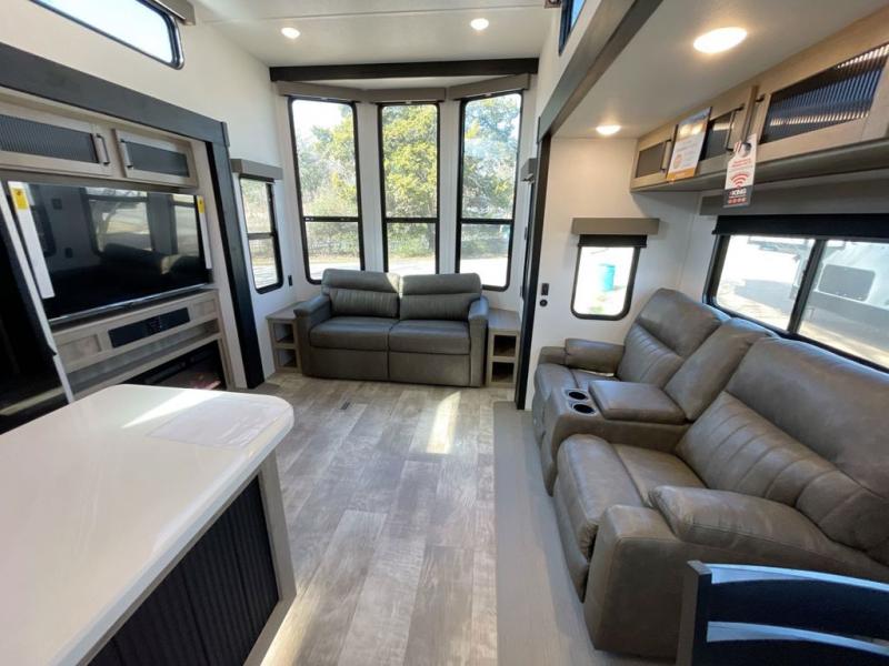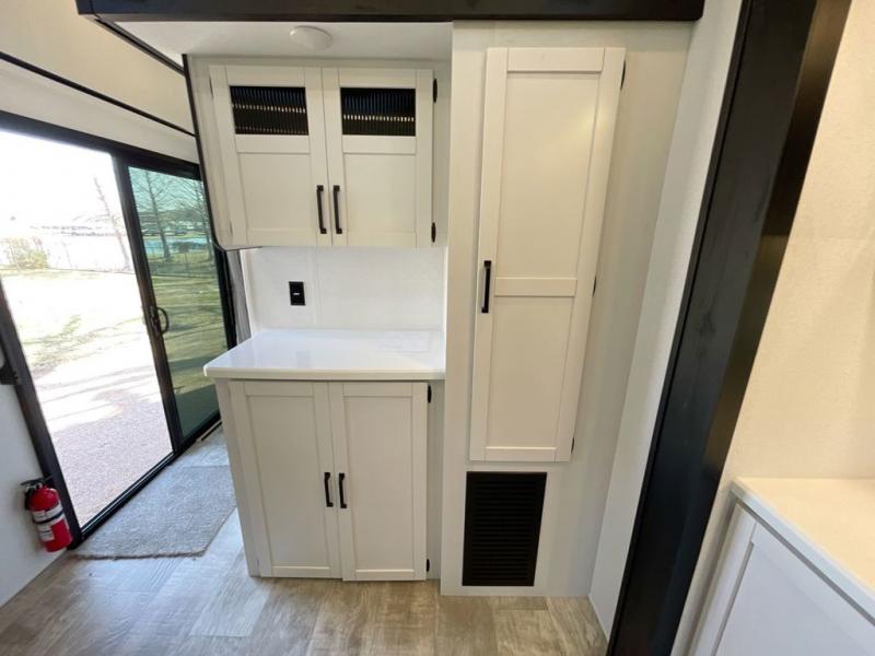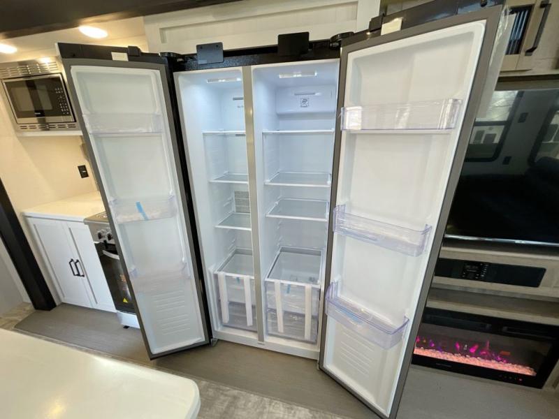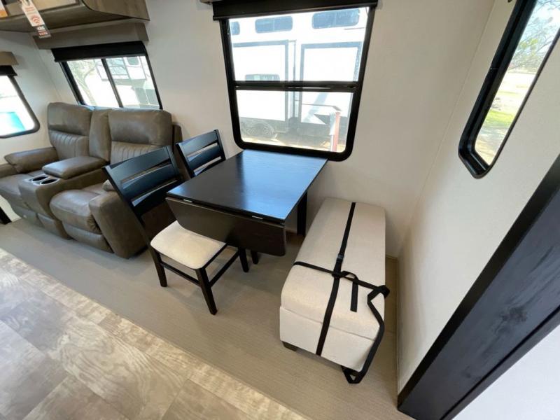 Wherever your destination may be, you can be sure to enjoy it to the fullest with this trailer in tow! With two entry doors, you can enter in through the rear private bedroom or the main living area. The bedroom includes a king bed slide out, a wardrobe/closet to keep your clothes organized, plus a closet with the option to add washer and dryer prep. Just outside this room are steps that lead to the large loft area with a 58" x 58" bunk mat and a cabinet on one side, plus two 32" x 69" bunk mats on the other. There is also a cabinet and a wardrobe/closet for plenty of storage space. Once you've headed back downstairs, you can relax on the dual recliners, front sofa, or free-standing table with a bench and two seats. And the chef of your group will love the kitchen with its residential style refrigerator and pantry, kitchen island, and four burner cooktop!