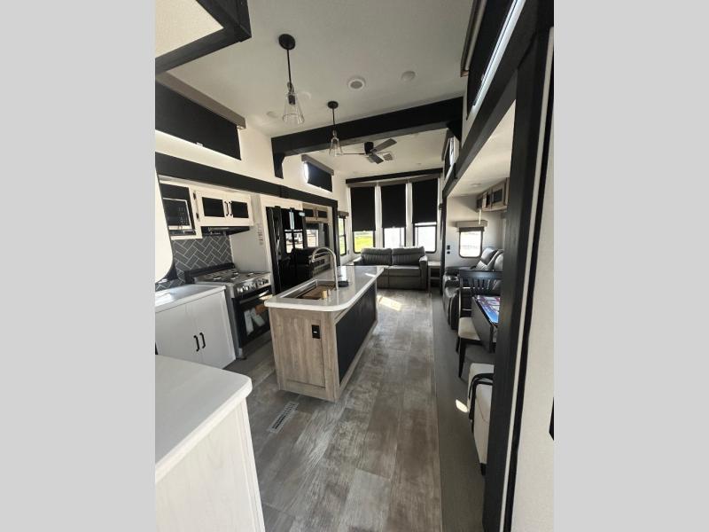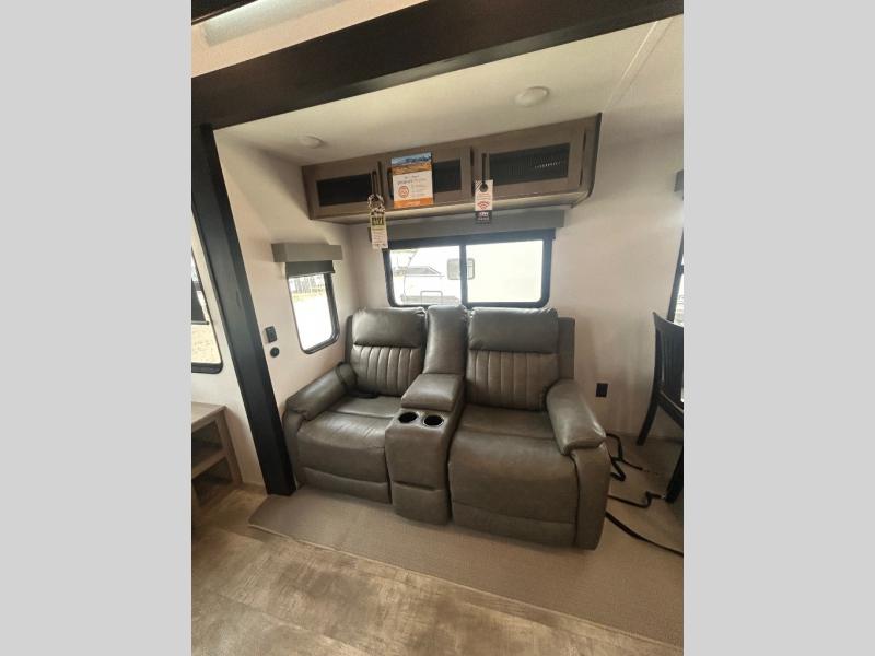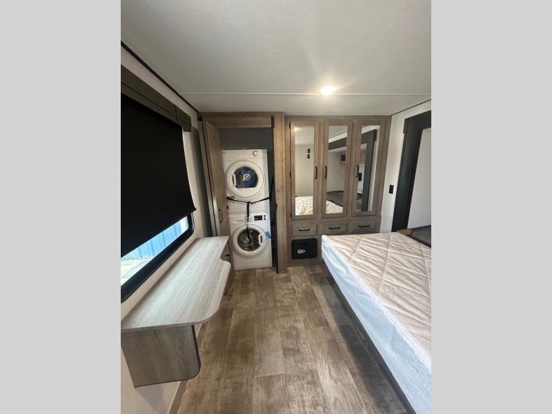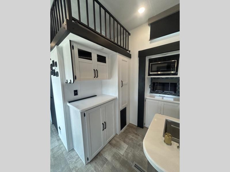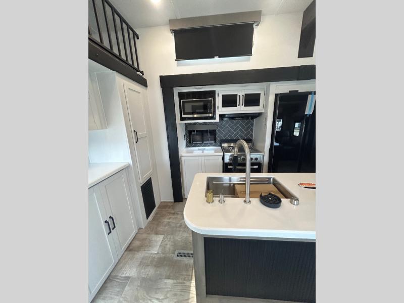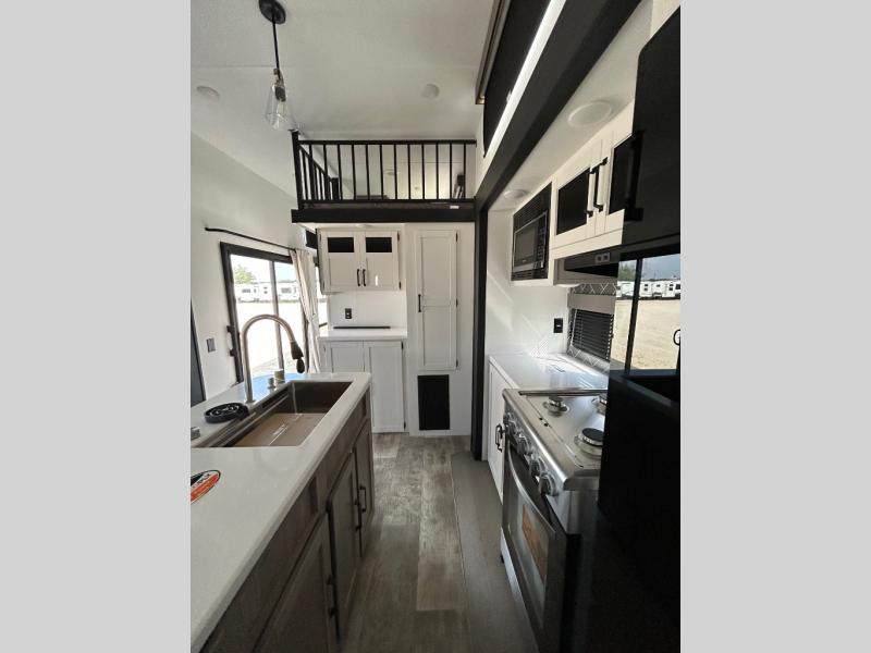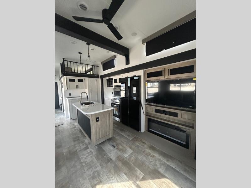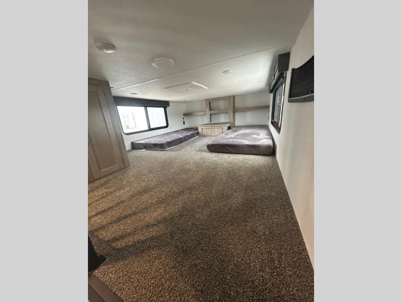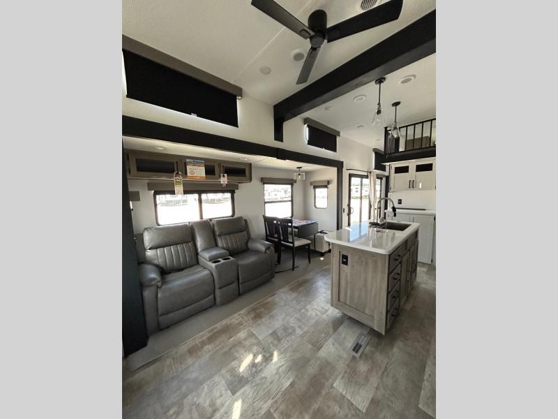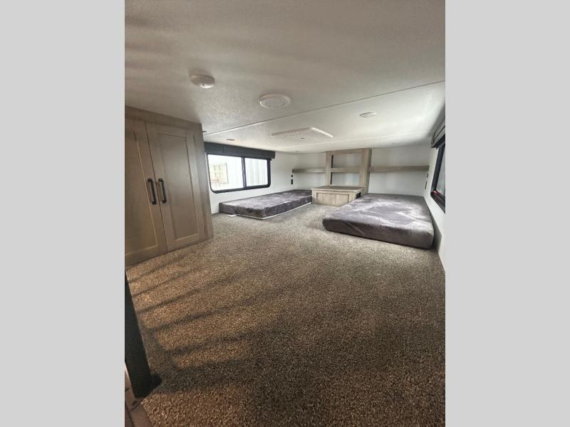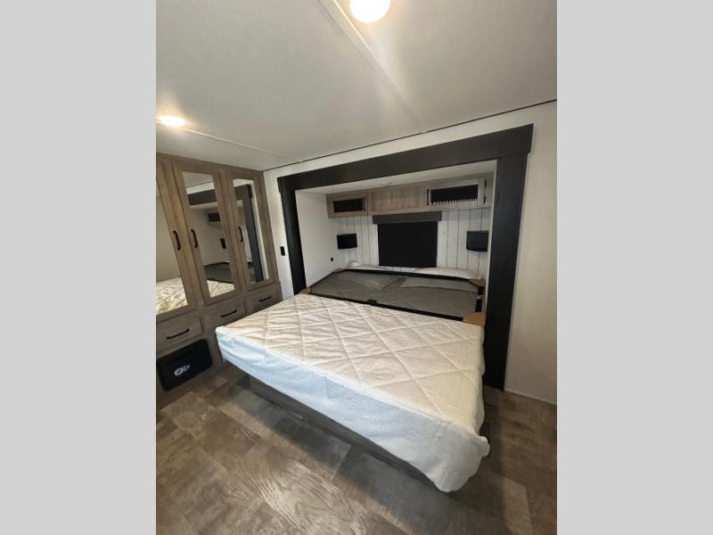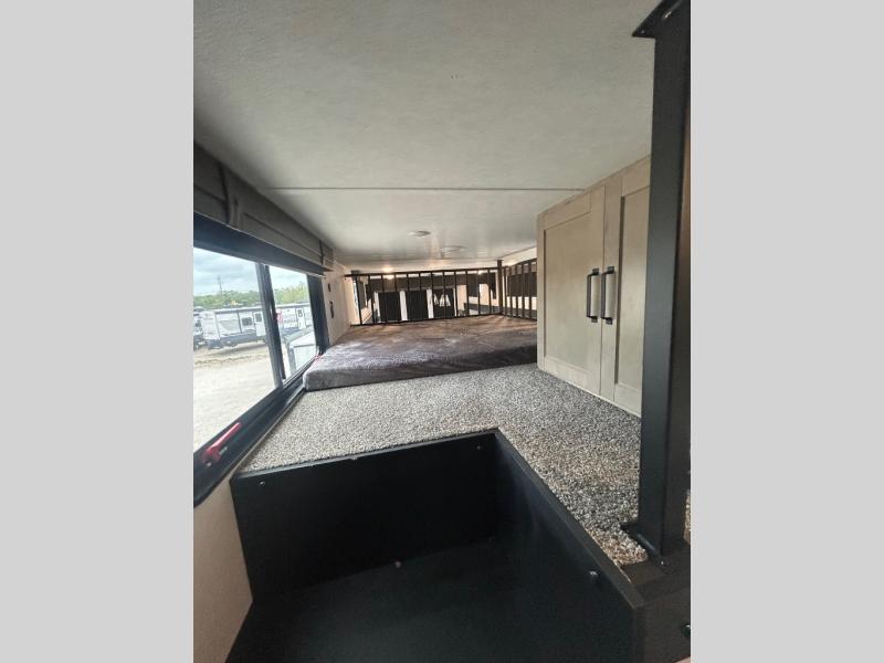 Wherever your destination may be, you can be sure to enjoy it to the fullest with this trailer in tow! With two entry doors, you can enter in through the rear private bedroom or the main living area. The bedroom includes a king bed slide out, a wardrobe/closet to keep your clothes organized, plus a closet with the option to add washer and dryer prep. Just outside this room are steps that lead to the large loft area with a 58" x 58" bunk mat and a cabinet on one side, plus two 32" x 69" bunk mats on the other. There is also a cabinet and a wardrobe/closet for plenty of storage space. Once you've headed back downstairs, you can relax on the dual recliners, front sofa, or free-standing table with a bench and two seats. And the chef of your group will love the kitchen with its residential style refrigerator and pantry, kitchen island, and four burner cooktop!