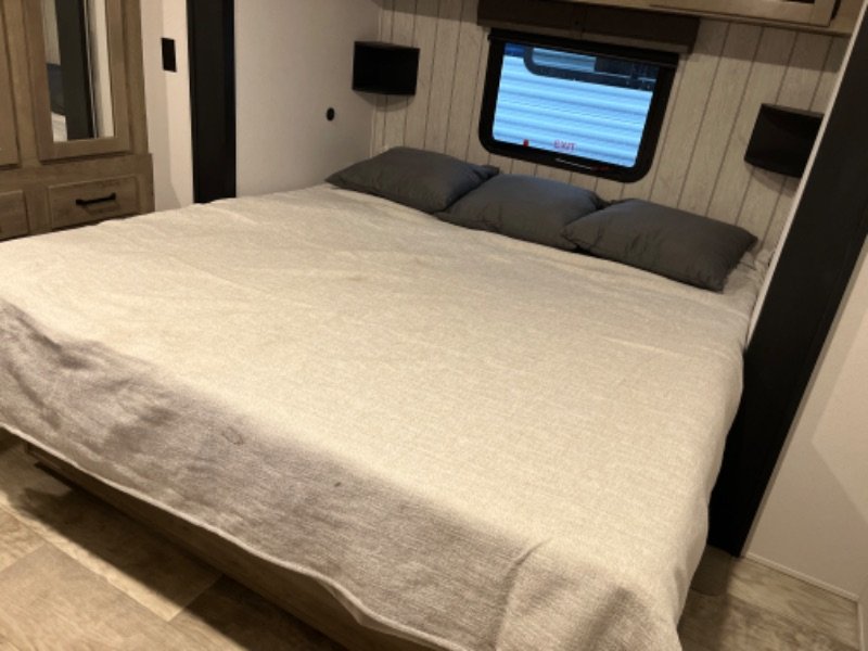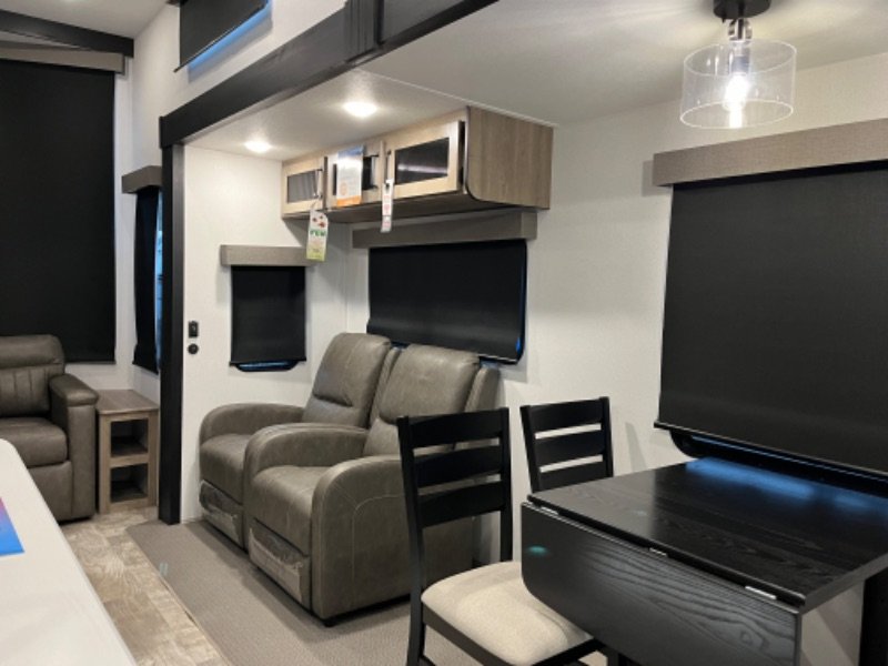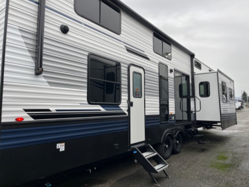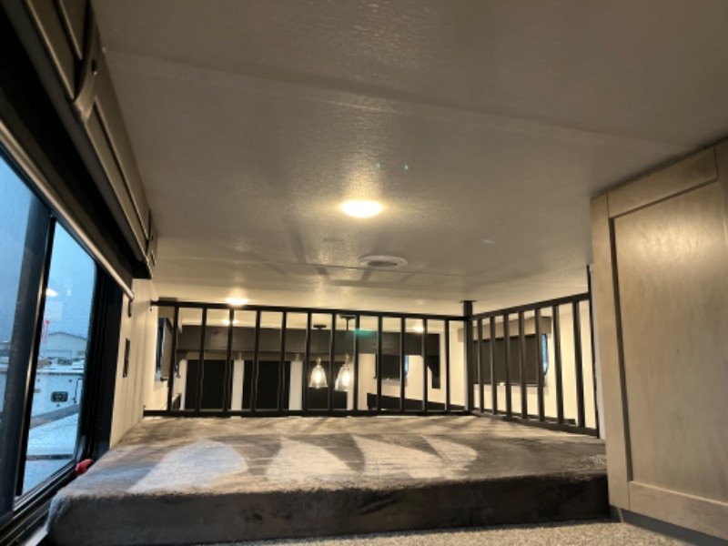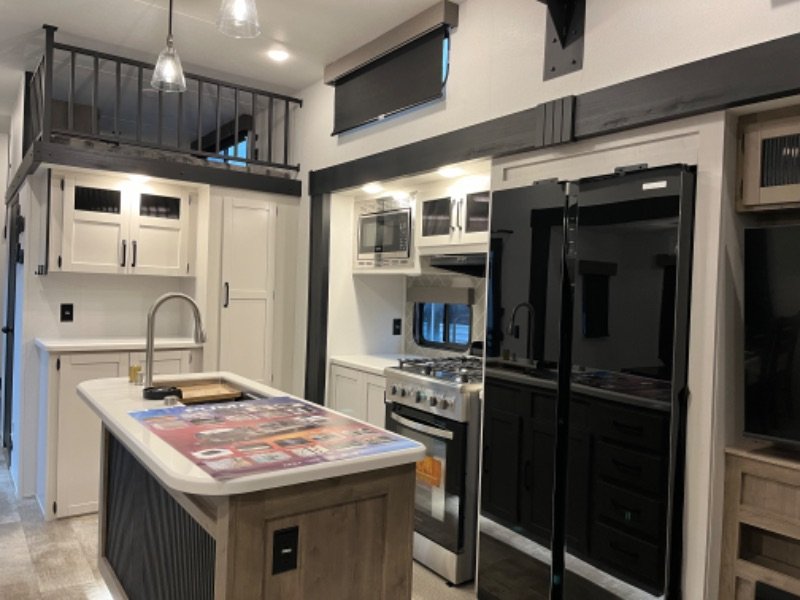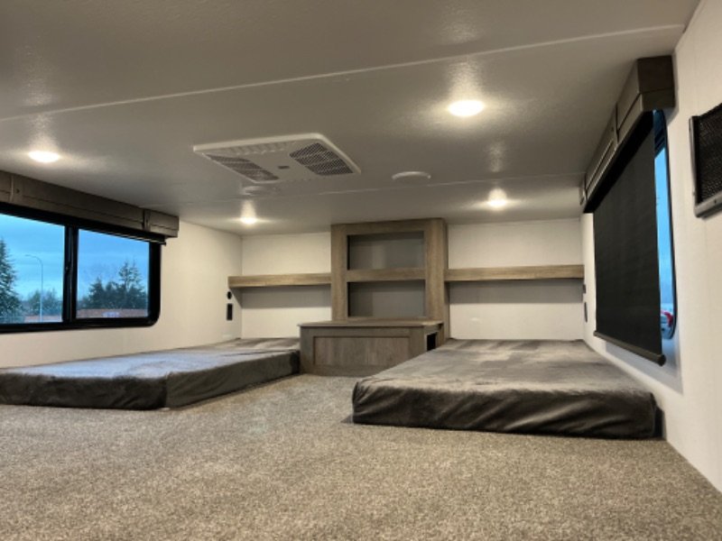Wherever your destination may be, you can be sure to enjoy it to the fullest with this trailer in tow! With two entry doors, you can enter in through the rear private bedroom or the main living area. The bedroom includes a king bed slide out, a wardrobe/closet to keep your clothes organized, plus a closet with the option to add washer and dryer prep. Just outside this room are steps that lead to the large loft area with a 58" x 58" bunk mat and a cabinet on one side, plus two 32" x 69" bunk mats on the other. There is also a cabinet and a wardrobe/closet for plenty of storage space. Once you've headed back downstairs, you can relax on the dual recliners, front sofa, or free-standing table with a bench and two seats. And the chef of your group will love the kitchen with its residential style refrigerator and pantry, kitchen island, and four burner cooktop!