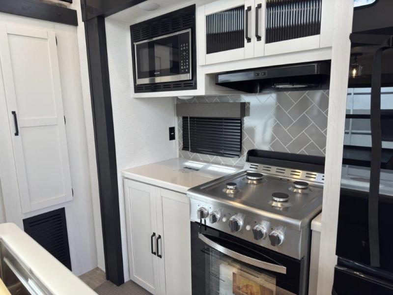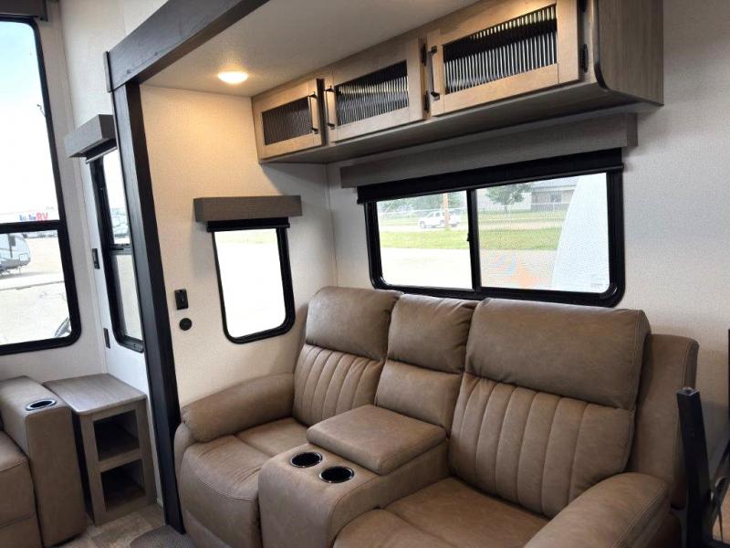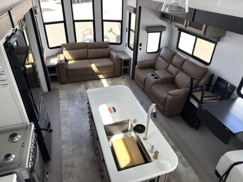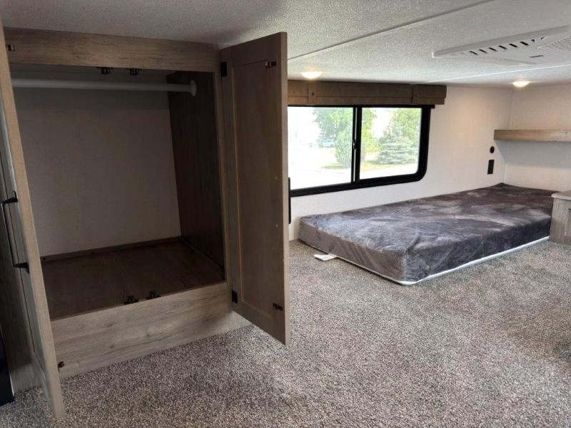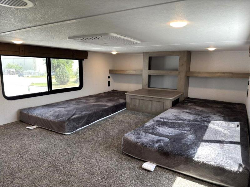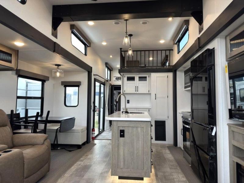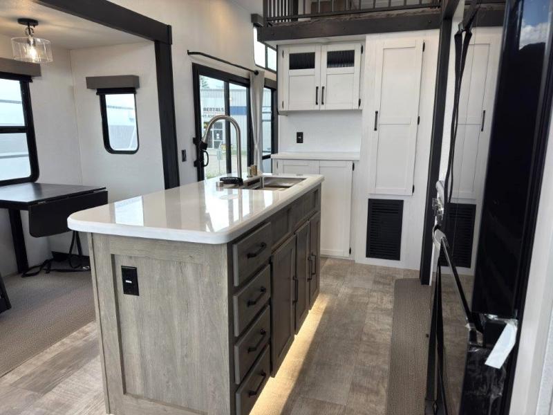 Wherever your destination may be, you can be sure to enjoy it to the fullest with this trailer in tow! With two entry doors, you can enter in through the rear private bedroom or the main living area. The bedroom includes a king bed slide out, a wardrobe/closet to keep your clothes organized, plus a closet with the option to add washer and dryer prep. Just outside this room are steps that lead to the large loft area with a 58" x 58" bunk mat and a cabinet on one side, plus two 32" x 69" bunk mats on the other. There is also a cabinet and a wardrobe/closet for plenty of storage space. Once you've headed back downstairs, you can relax on the dual recliners, front sofa, or free-standing table with a bench and two seats. And the chef of your group will love the kitchen with its residential style refrigerator and pantry, kitchen island, and four burner cooktop!