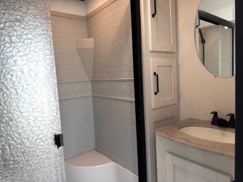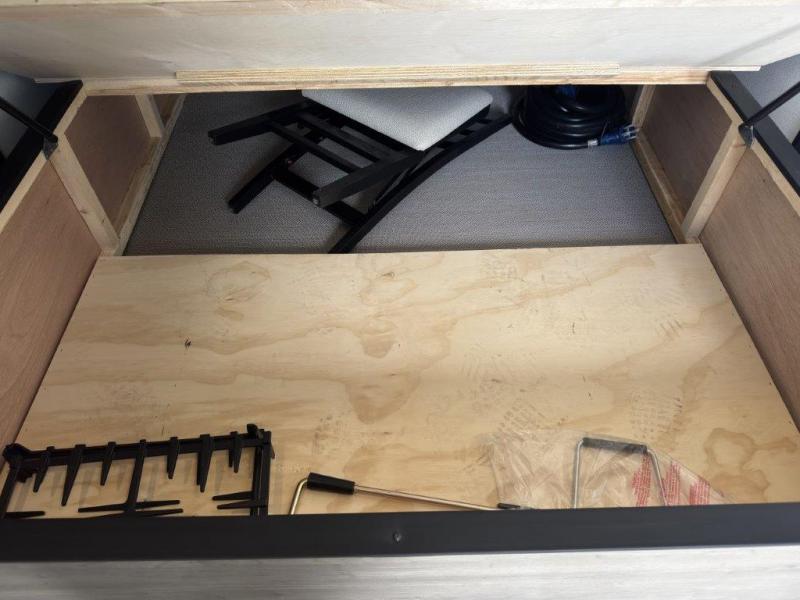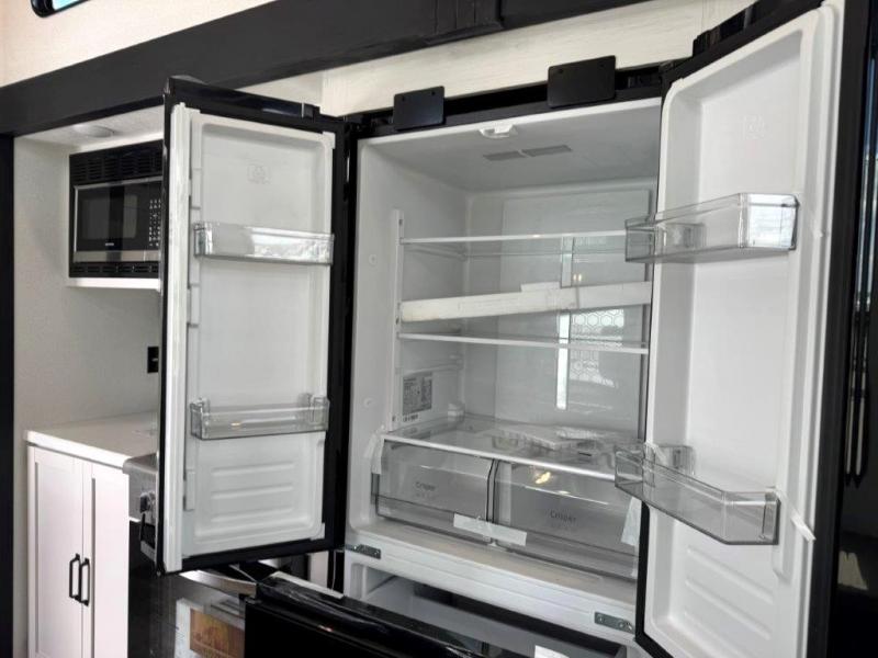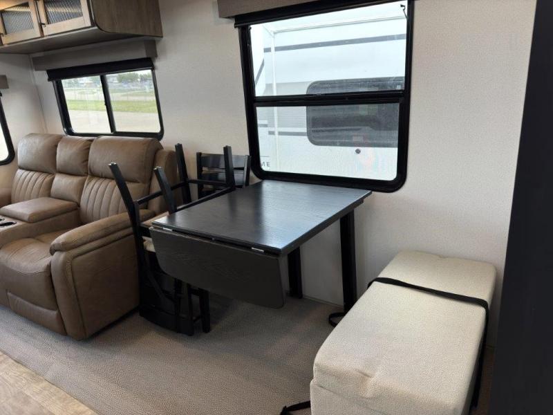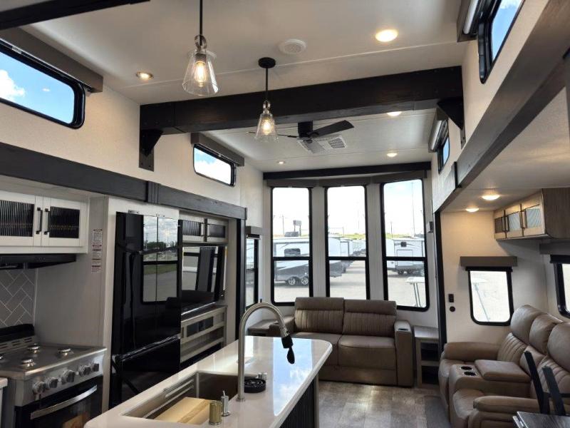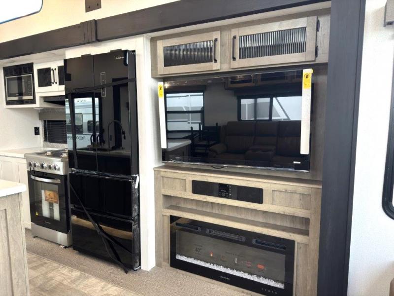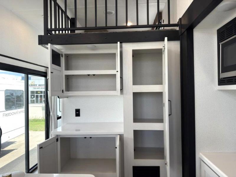 Wherever your destination may be, you can be sure to enjoy it to the fullest with this trailer in tow! With two entry doors, you can enter in through the rear private bedroom or the main living area. The bedroom includes a king bed slide out, a wardrobe/closet to keep your clothes organized, plus a closet with the option to add washer and dryer prep. Just outside this room are steps that lead to the large loft area with a 58" x 58" bunk mat and a cabinet on one side, plus two 32" x 69" bunk mats on the other. There is also a cabinet and a wardrobe/closet for plenty of storage space. Once you've headed back downstairs, you can relax on the dual recliners, front sofa, or free-standing table with a bench and two seats. And the chef of your group will love the kitchen with its residential style refrigerator and pantry, kitchen island, and four burner cooktop!