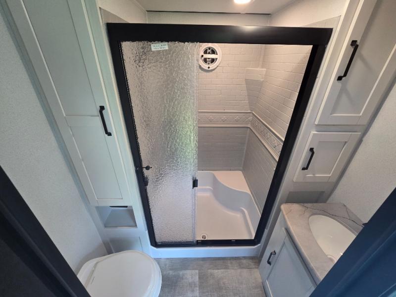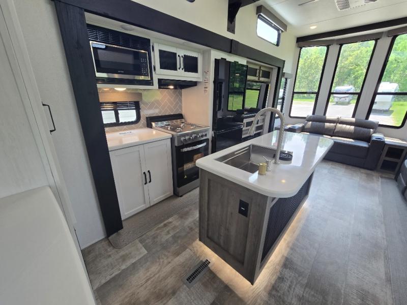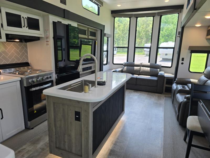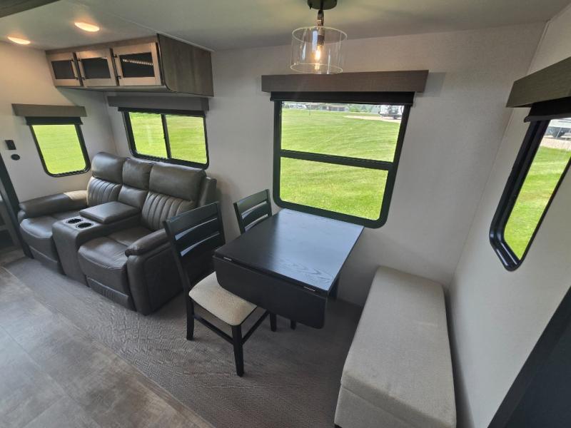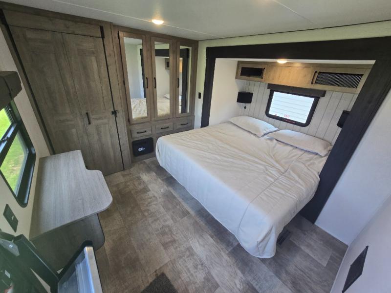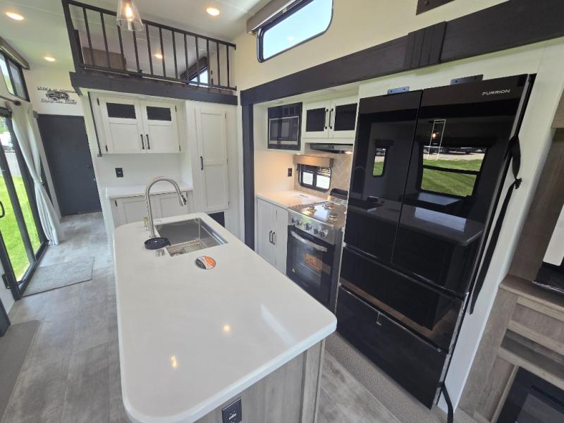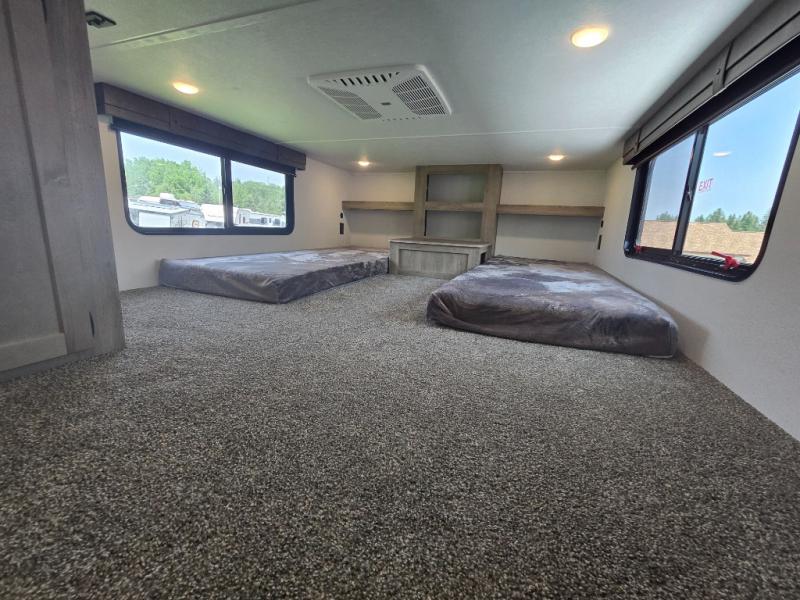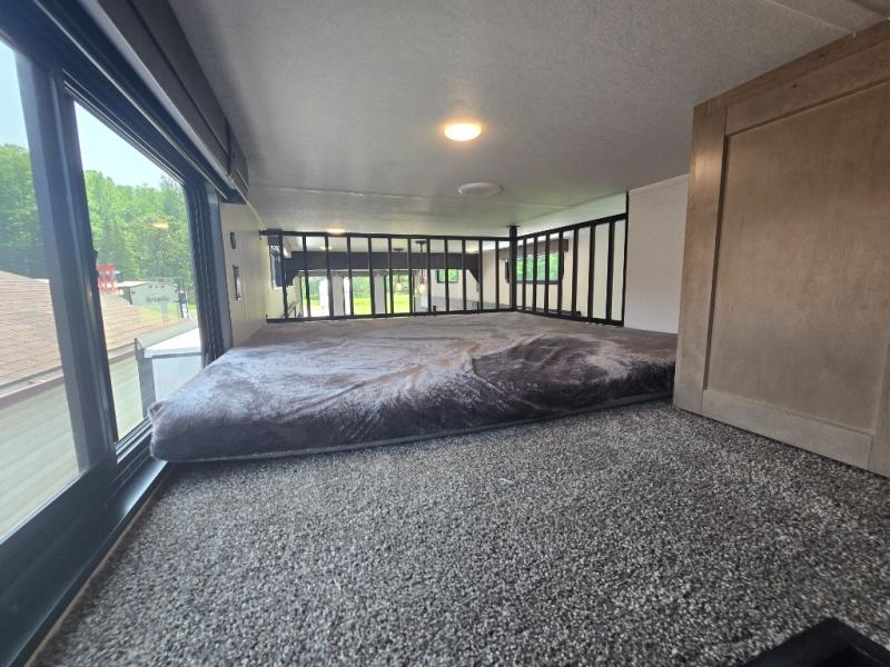 Wherever your destination may be, you can be sure to enjoy it to the fullest with this trailer in tow! With two entry doors, you can enter in through the rear private bedroom or the main living area. The bedroom includes a king bed slide out, a wardrobe/closet to keep your clothes organized, plus a closet with the option to add washer and dryer prep. Just outside this room are steps that lead to the large loft area with a 58" x 58" bunk mat and a cabinet on one side, plus two 32" x 69" bunk mats on the other. There is also a cabinet and a wardrobe/closet for plenty of storage space. Once you've headed back downstairs, you can relax on the dual recliners, front sofa, or free-standing table with a bench and two seats. And the chef of your group will love the kitchen with its residential style refrigerator and pantry, kitchen island, and four burner cooktop!