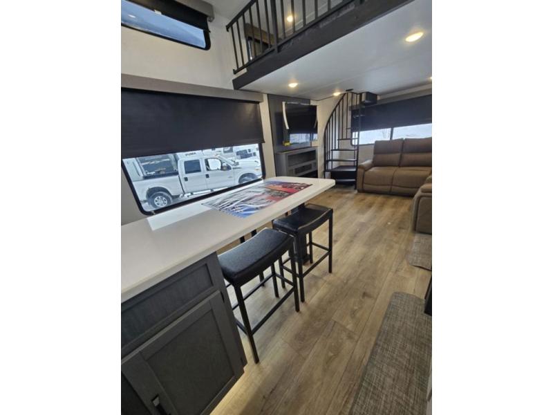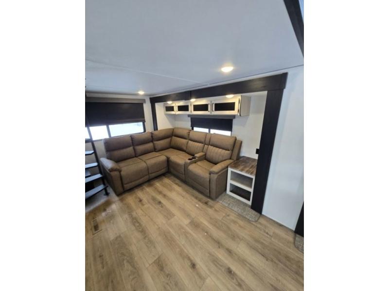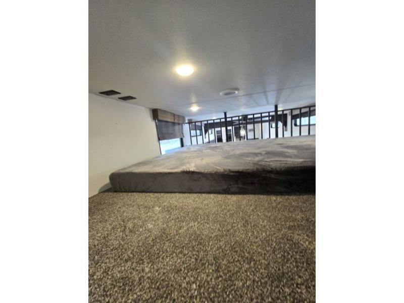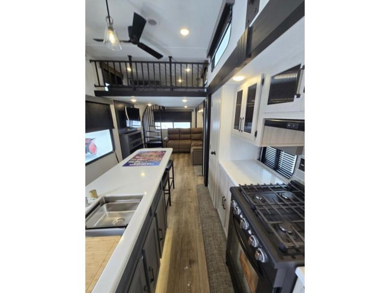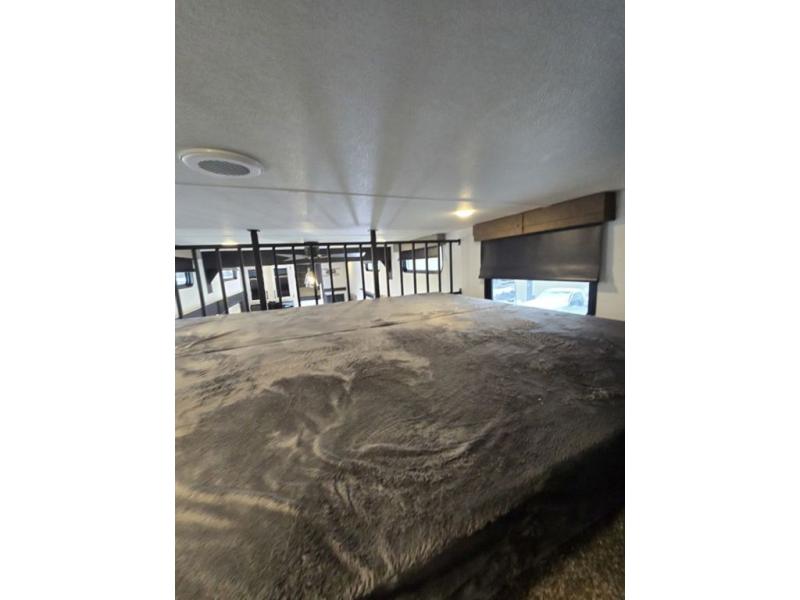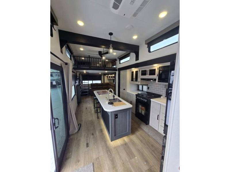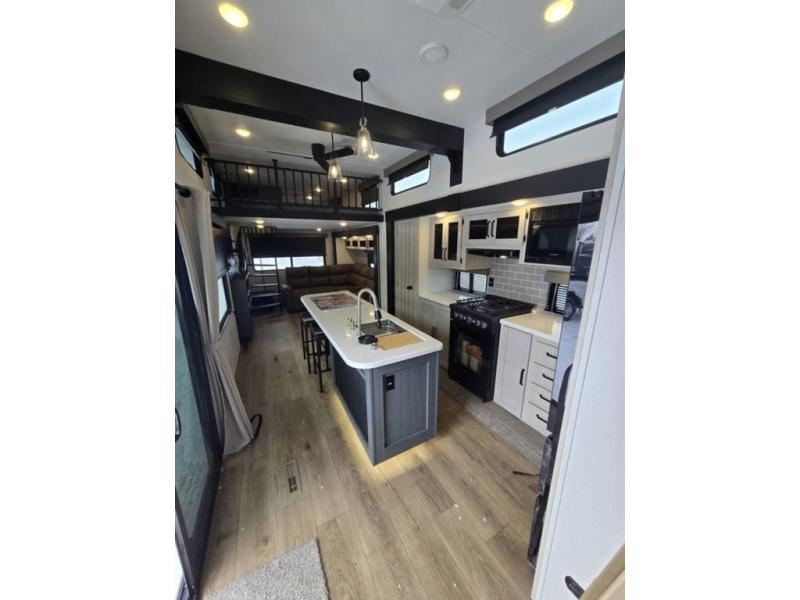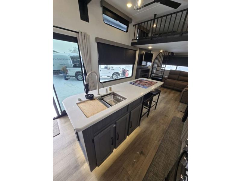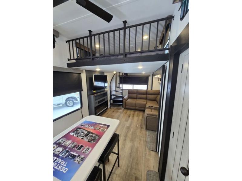 Wherever your destination may be, you can be sure to enjoy it to the fullest with this trailer in tow! With two entry doors, you can enter in through the rear private bedroom or the main living area. The bedroom includes a king bed slide out, a wardrobe/closet to keep your clothes organized, plus a closet with the option to add washer and dryer prep. Just outside this room are steps that lead to the large loft area with a 58" x 58" bunk mat and a cabinet on one side, plus two 32" x 69" bunk mats on the other. There is also a cabinet and a wardrobe/closet for plenty of storage space. Once you've headed back downstairs, you can relax on the dual recliners, front sofa, or free-standing table with a bench and two seats. And the chef of your group will love the kitchen with its residential style refrigerator and pantry, kitchen island, and four burner cooktop!