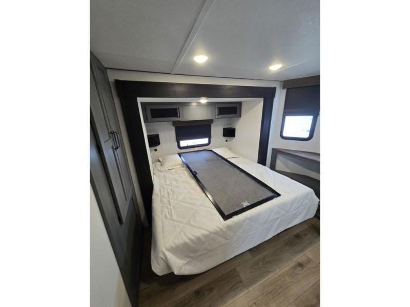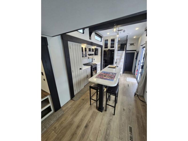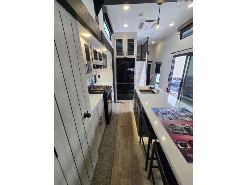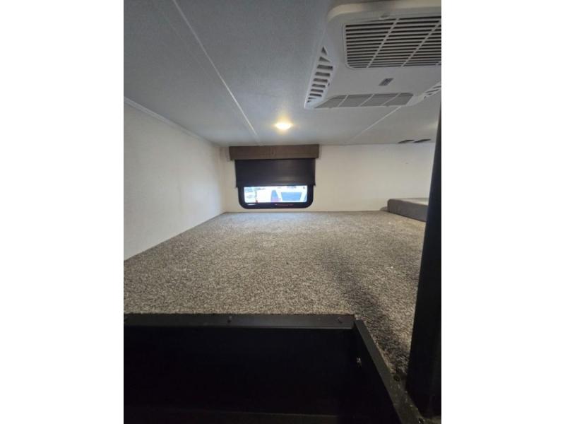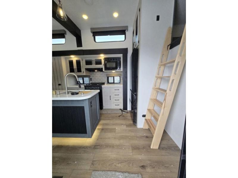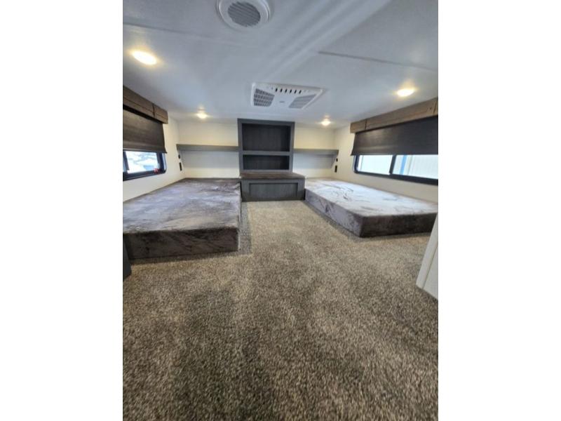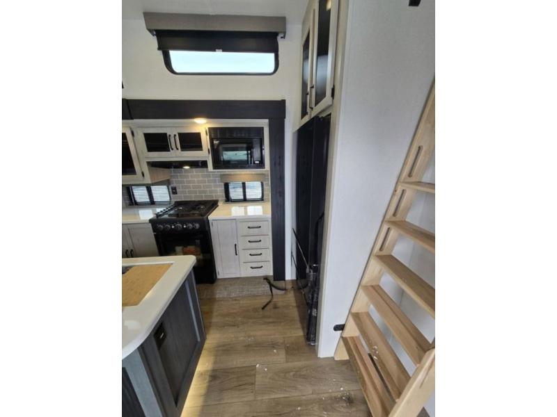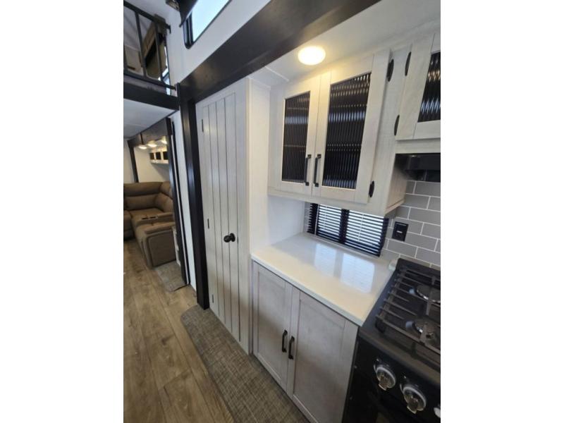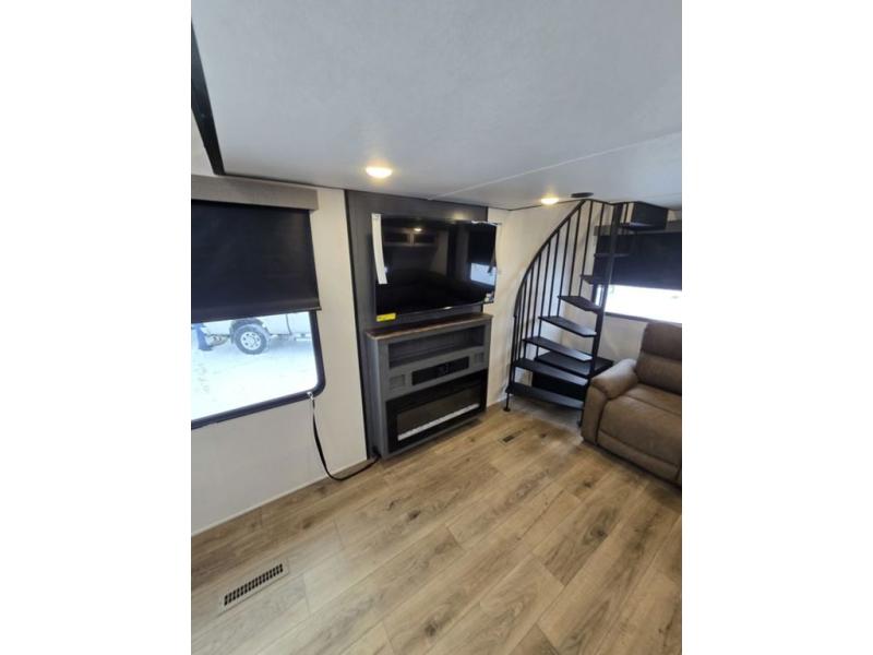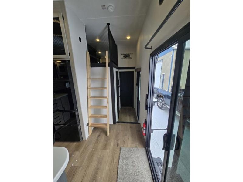 Wherever your destination may be, you can be sure to enjoy it to the fullest with this trailer in tow! With two entry doors, you can enter in through the rear private bedroom or the main living area. The bedroom includes a king bed slide out, a wardrobe/closet to keep your clothes organized, plus a closet with the option to add washer and dryer prep. Just outside this room are steps that lead to the large loft area with a 58" x 58" bunk mat and a cabinet on one side, plus two 32" x 69" bunk mats on the other. There is also a cabinet and a wardrobe/closet for plenty of storage space. Once you've headed back downstairs, you can relax on the dual recliners, front sofa, or free-standing table with a bench and two seats. And the chef of your group will love the kitchen with its residential style refrigerator and pantry, kitchen island, and four burner cooktop!