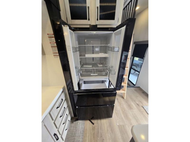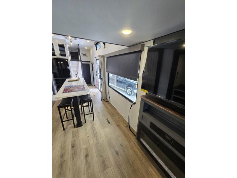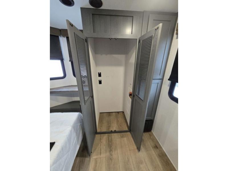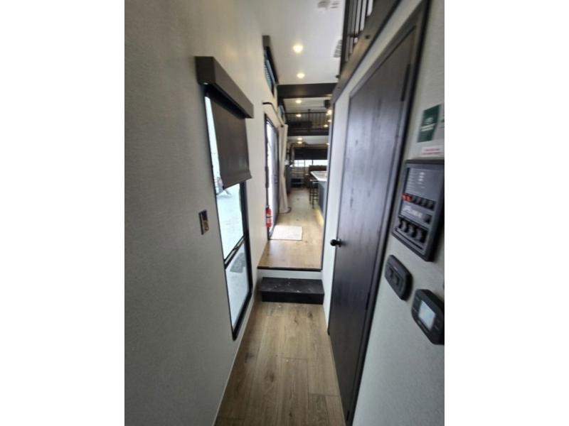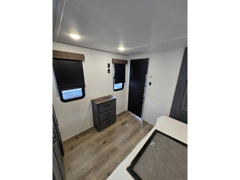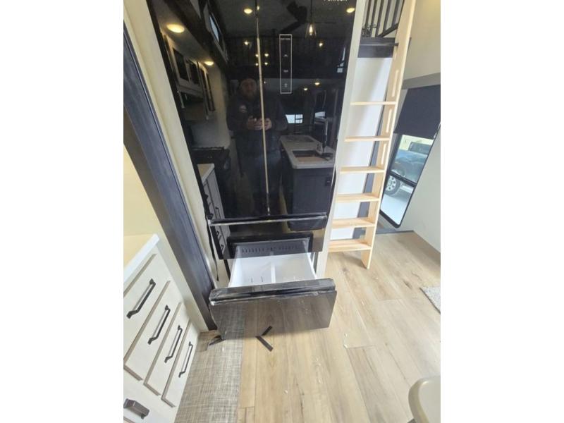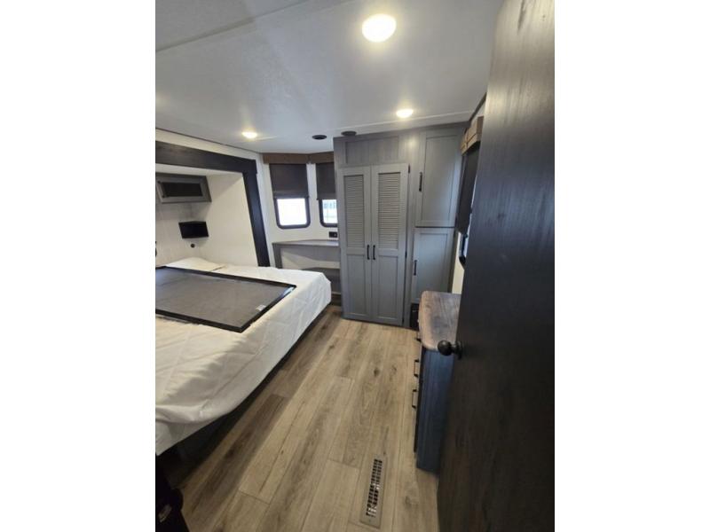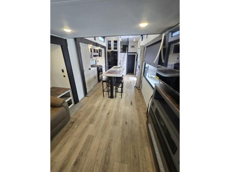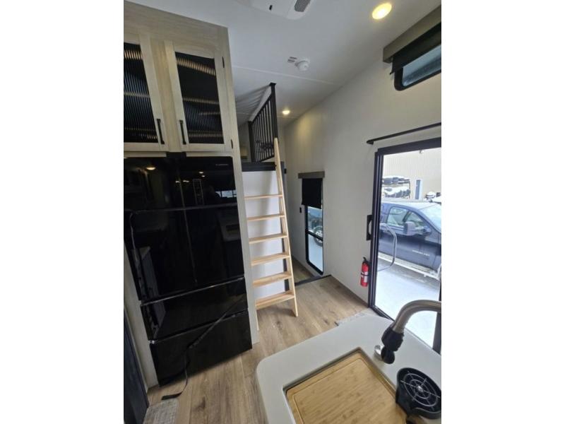 Wherever your destination may be, you can be sure to enjoy it to the fullest with this trailer in tow! With two entry doors, you can enter in through the rear private bedroom or the main living area. The bedroom includes a king bed slide out, a wardrobe/closet to keep your clothes organized, plus a closet with the option to add washer and dryer prep. Just outside this room are steps that lead to the large loft area with a 58" x 58" bunk mat and a cabinet on one side, plus two 32" x 69" bunk mats on the other. There is also a cabinet and a wardrobe/closet for plenty of storage space. Once you've headed back downstairs, you can relax on the dual recliners, front sofa, or free-standing table with a bench and two seats. And the chef of your group will love the kitchen with its residential style refrigerator and pantry, kitchen island, and four burner cooktop!