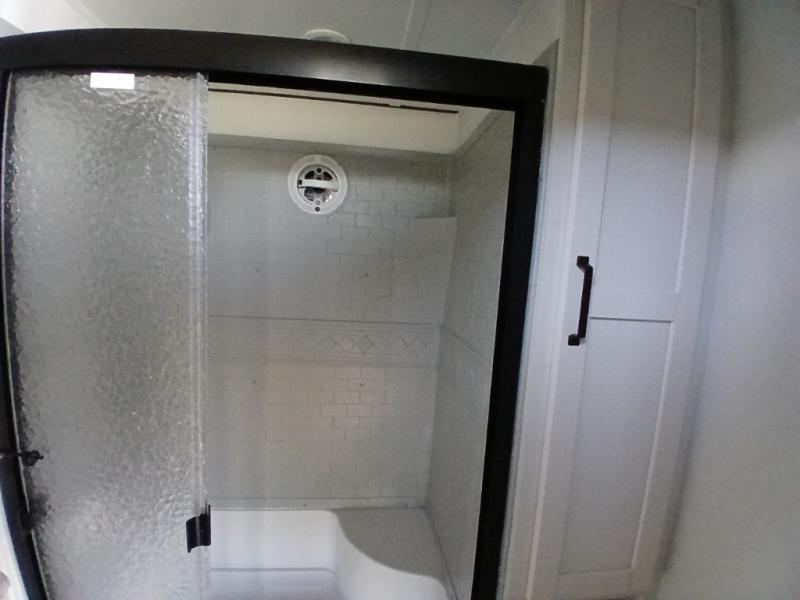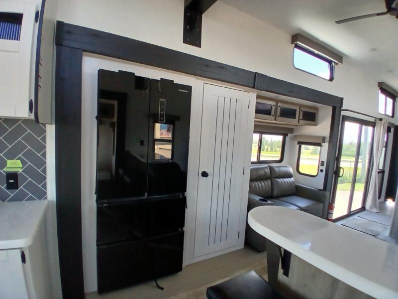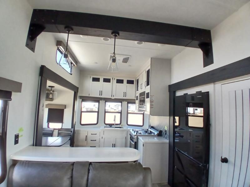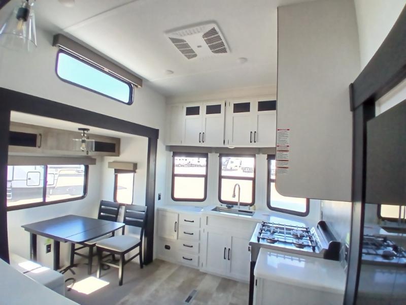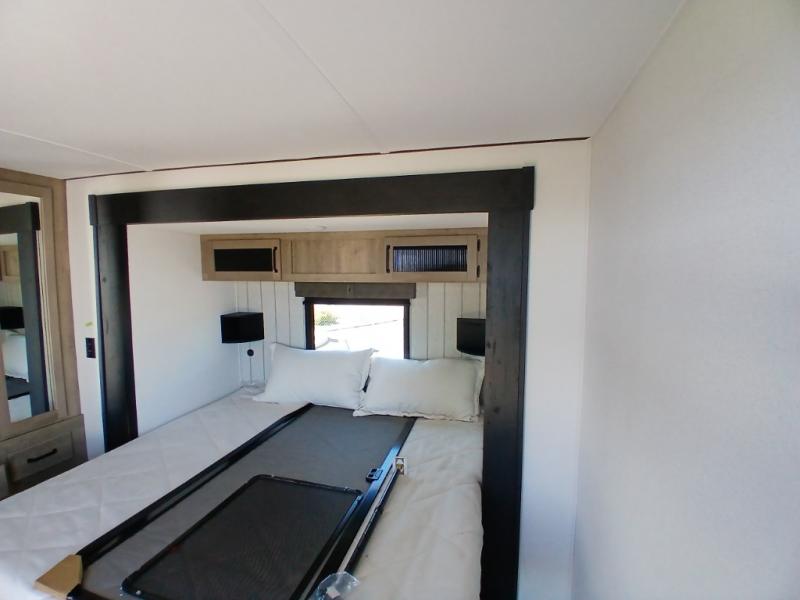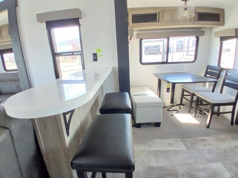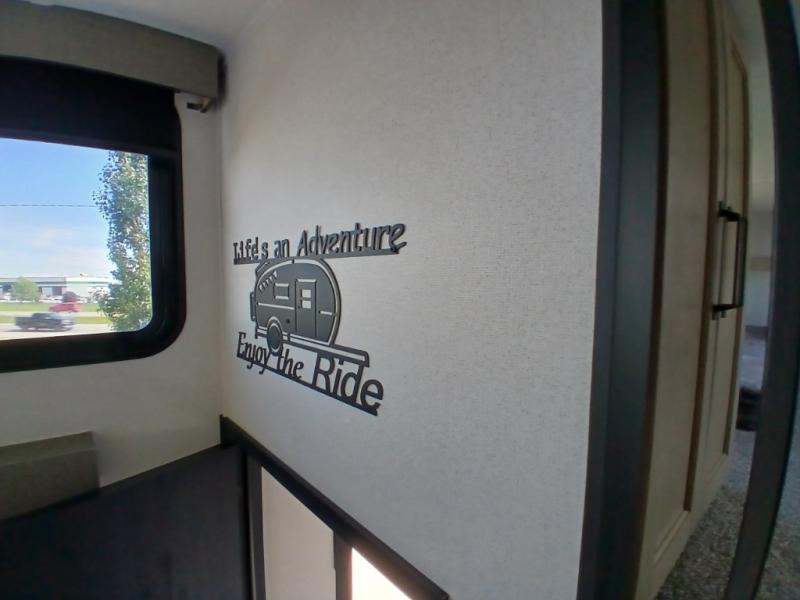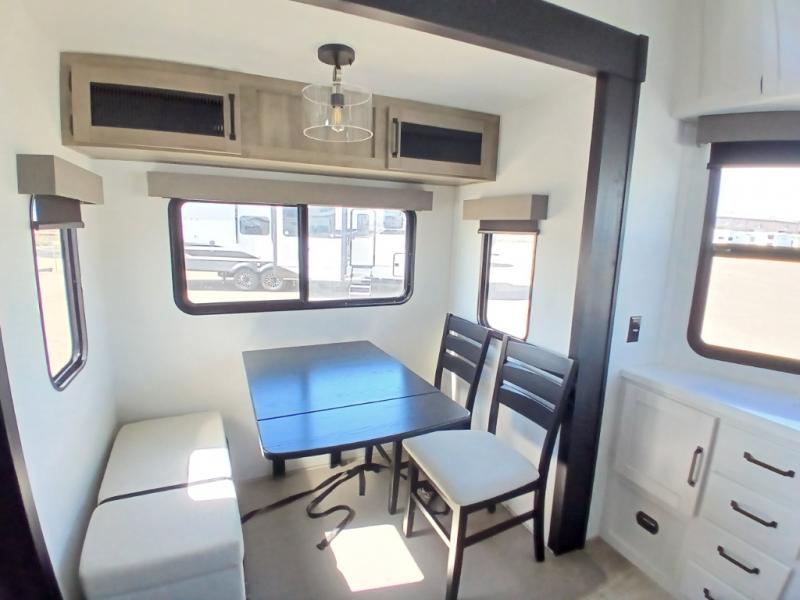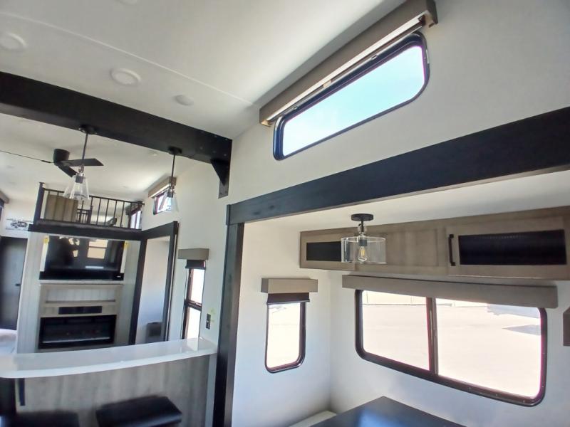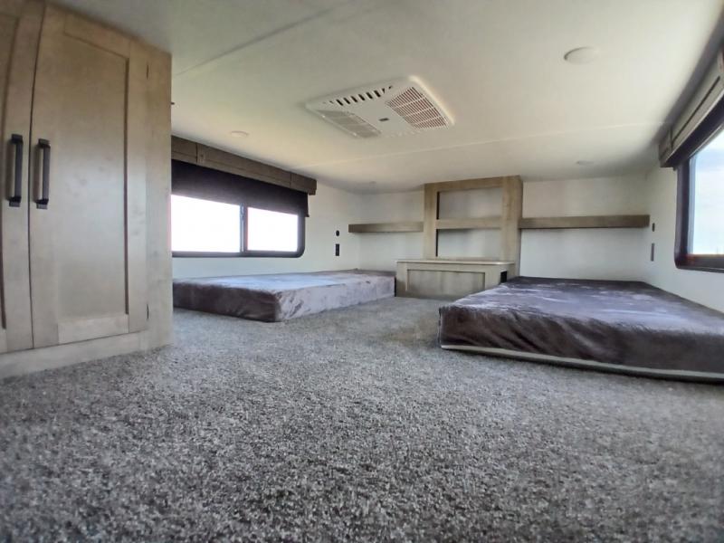 This is the perfect destination trailer for a larger group since it can sleep up to nine campers each night. The little ones will love the double loft areas with three bunk mats and storage space for their things, while you take the rear private bedroom. There is a king bed slide out here, along with a wardrobe/closet for your clothes, plus a second closet with the option to add washer and dryer prep. Everyone can meet in the middle living room to relax on the dual sofas or recliners across from the fireplace and entertainment center. Head to the front of the unit where you'll find the kitchen that includes ample counter space to prep meals, a residential style refrigerator and pantry for food storage, and a free-standing table to dine at. There is also a breakfast nook that overlooks the living area so you can visit with the cook and watch a movie at the same time!
