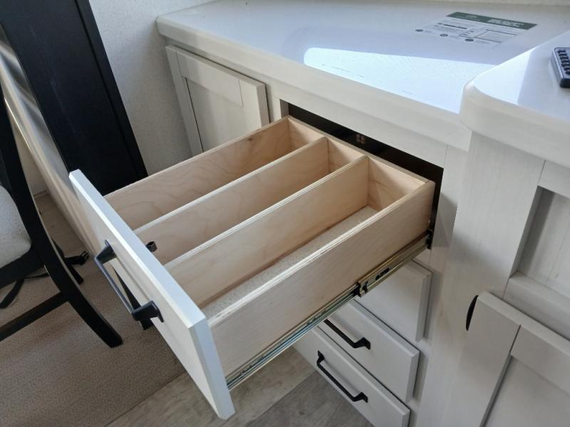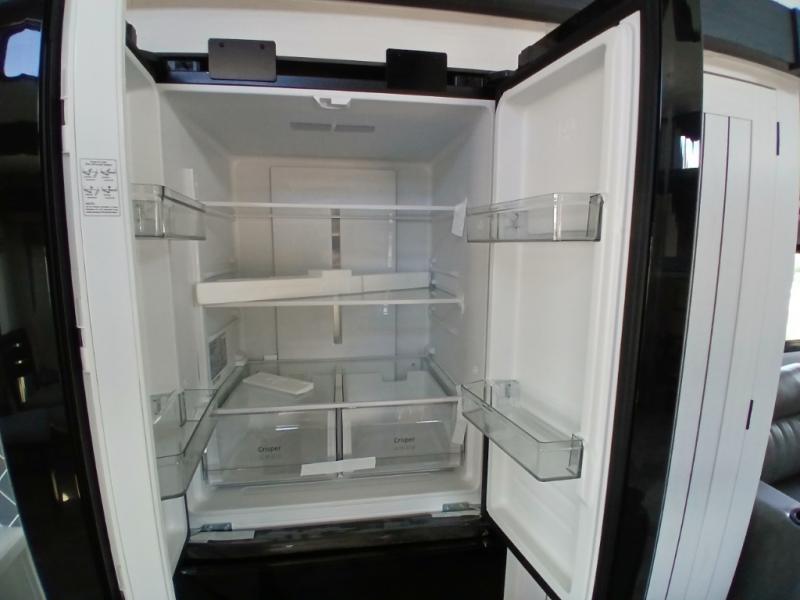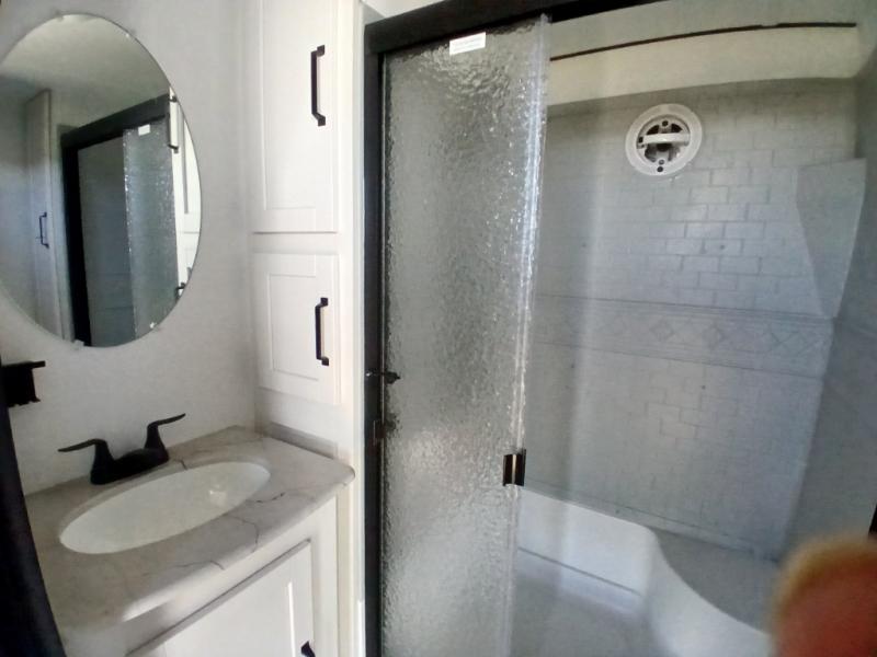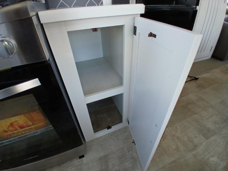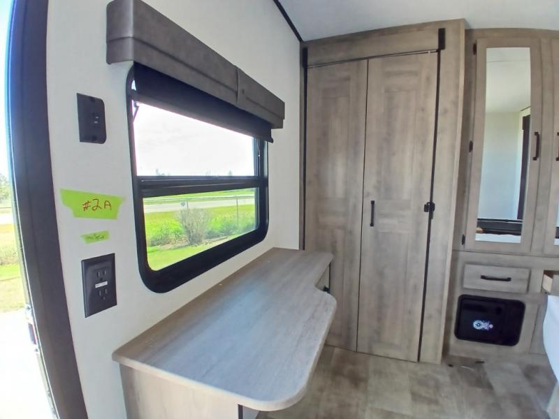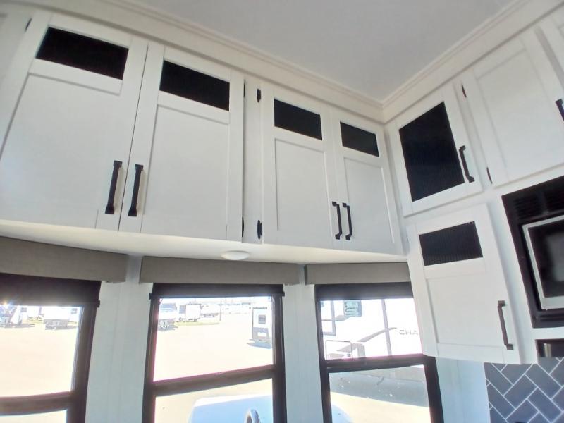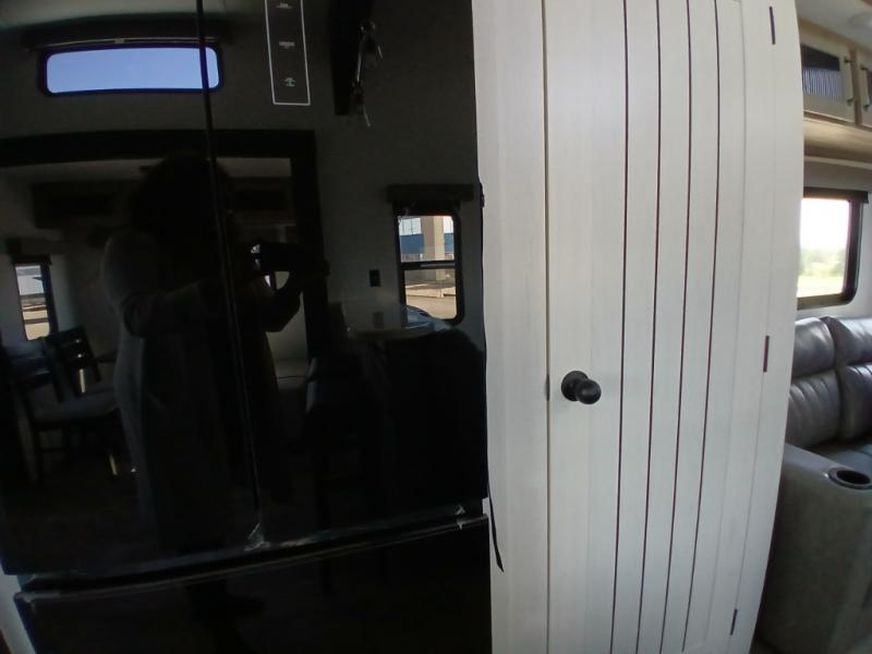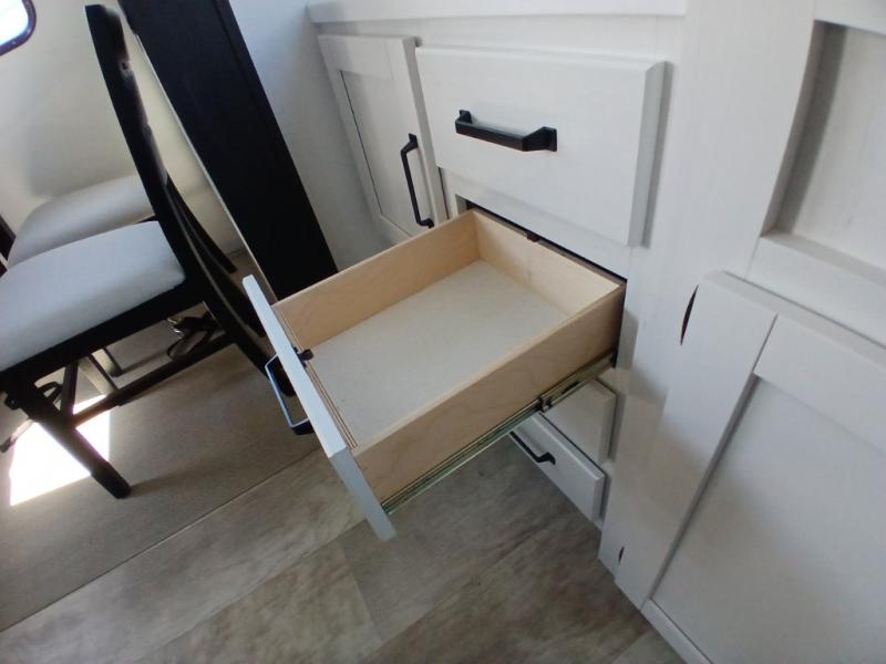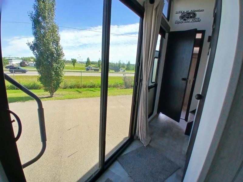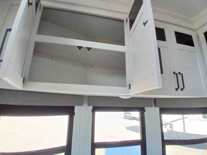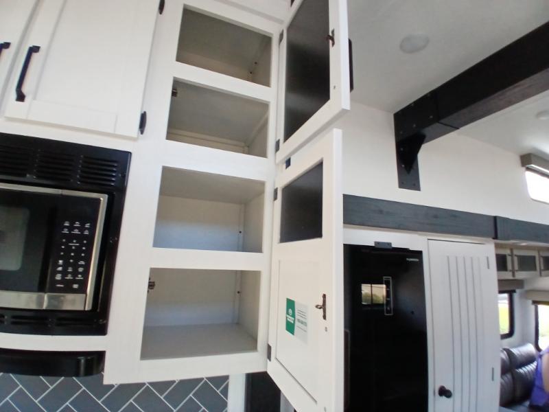 This is the perfect destination trailer for a larger group since it can sleep up to nine campers each night. The little ones will love the double loft areas with three bunk mats and storage space for their things, while you take the rear private bedroom. There is a king bed slide out here, along with a wardrobe/closet for your clothes, plus a second closet with the option to add washer and dryer prep. Everyone can meet in the middle living room to relax on the dual sofas or recliners across from the fireplace and entertainment center. Head to the front of the unit where you'll find the kitchen that includes ample counter space to prep meals, a residential style refrigerator and pantry for food storage, and a free-standing table to dine at. There is also a breakfast nook that overlooks the living area so you can visit with the cook and watch a movie at the same time!