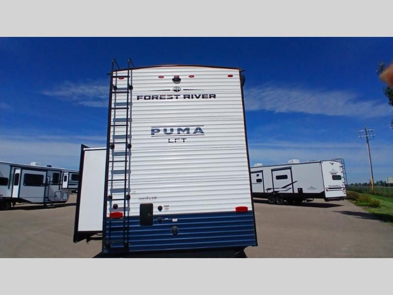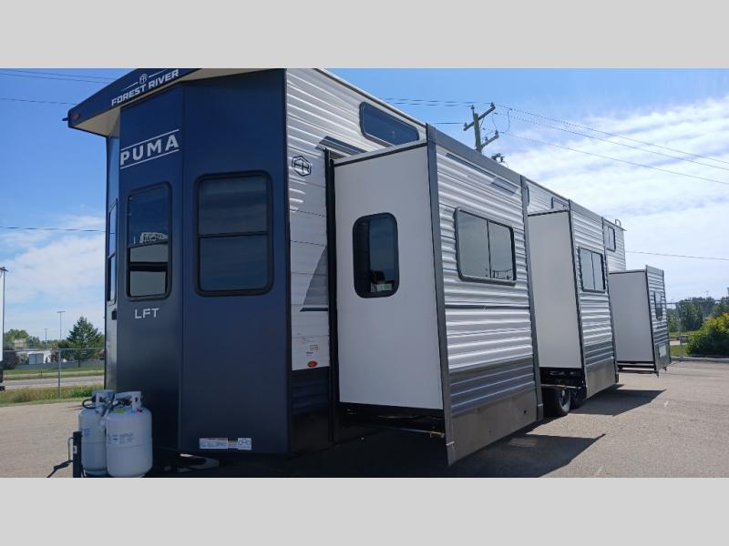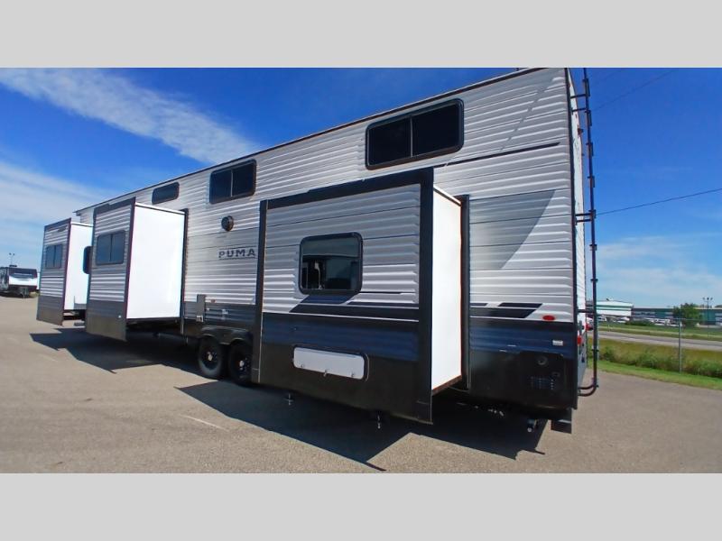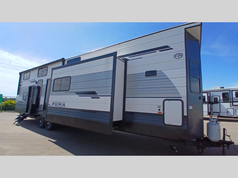 Each Puma Destination trailer by Palomino is designed to give you unforgettable getaways to the destination of your choice! The required Value Shopper Loft Package includes Congoleum designer linoleum, night roller shades, LED lighting, and a 24" stainless steel oven with a four burner stove so you can make meals just like you would at home. The tankless water heater is another feature you won't want to camp without, and there is WiFi prep, solar prep, plus optional washer and dryer prep for the option to further customize your trailer. An outside shower is included with the required Loft Package, along with two exterior speakers, solid surface countertops, four stabilizer jacks, and more!