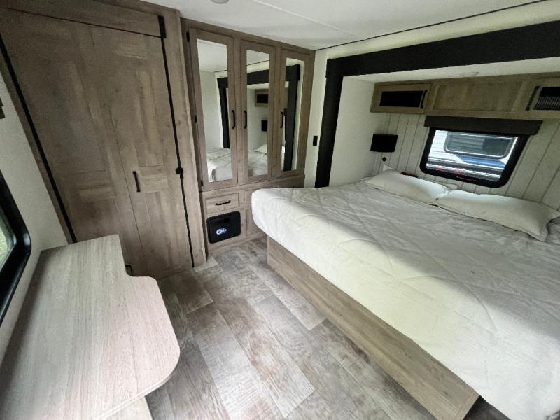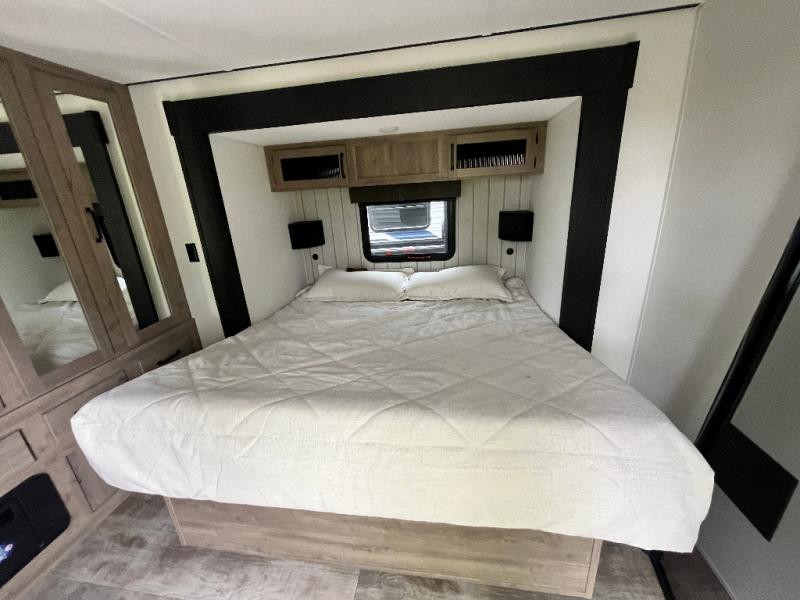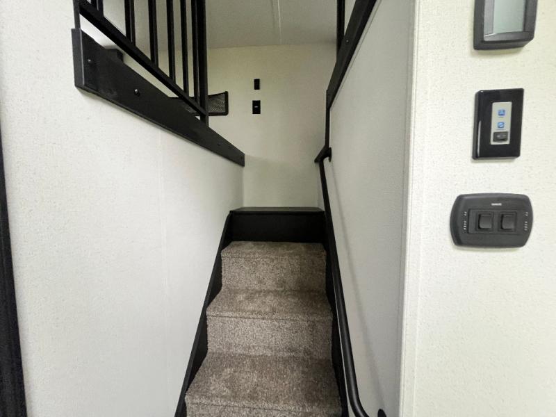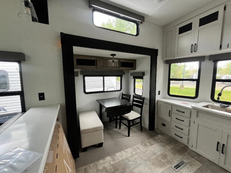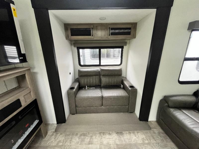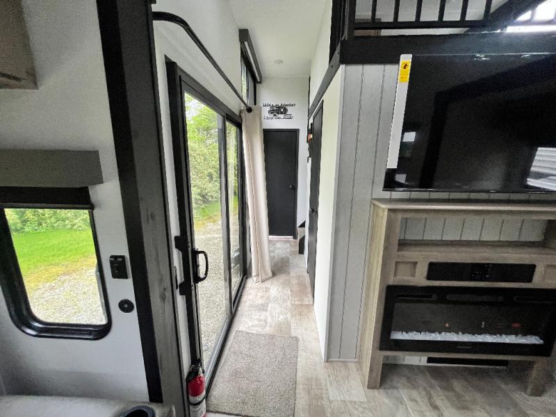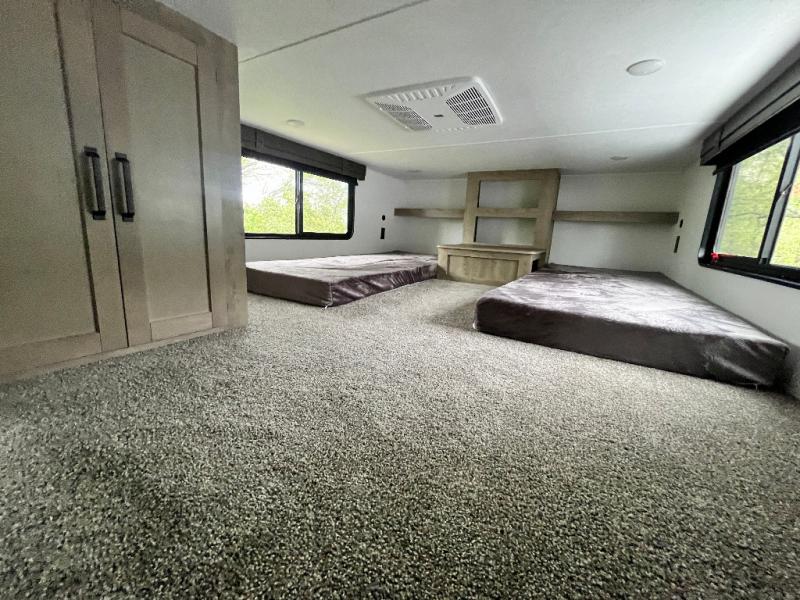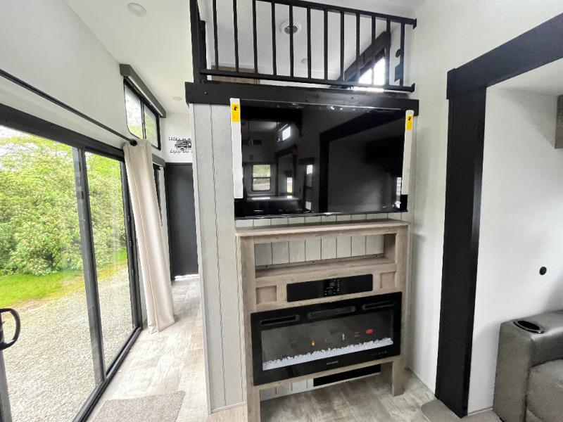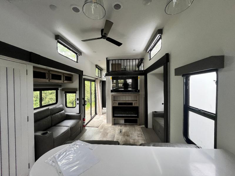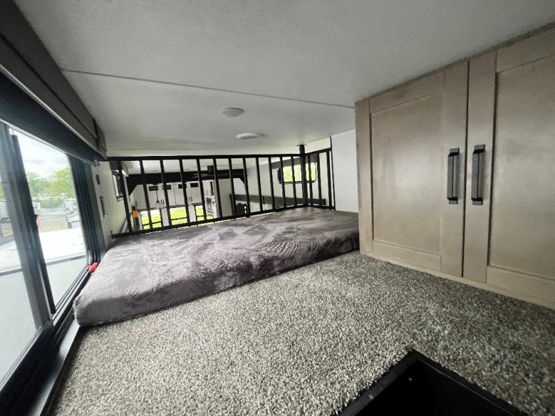 This is the perfect destination trailer for a larger group since it can sleep up to nine campers each night. The little ones will love the double loft areas with three bunk mats and storage space for their things, while you take the rear private bedroom. There is a king bed slide out here, along with a wardrobe/closet for your clothes, plus a second closet with the option to add washer and dryer prep. Everyone can meet in the middle living room to relax on the dual sofas or recliners across from the fireplace and entertainment center. Head to the front of the unit where you'll find the kitchen that includes ample counter space to prep meals, a residential style refrigerator and pantry for food storage, and a free-standing table to dine at. There is also a breakfast nook that overlooks the living area so you can visit with the cook and watch a movie at the same time!