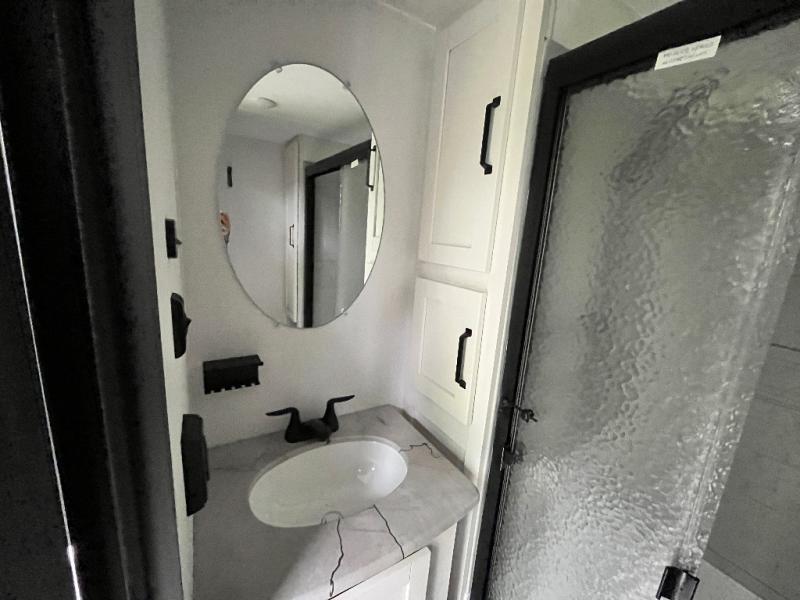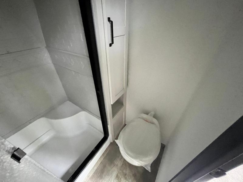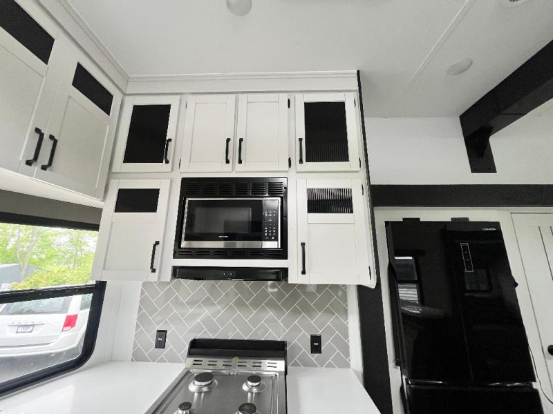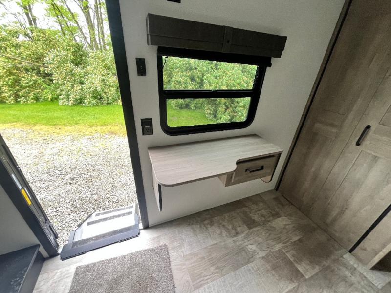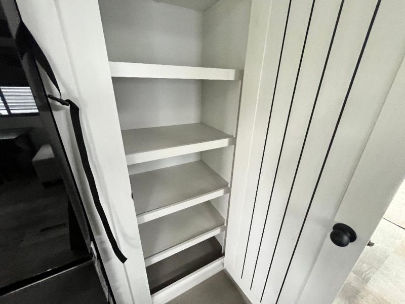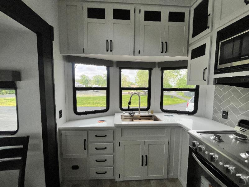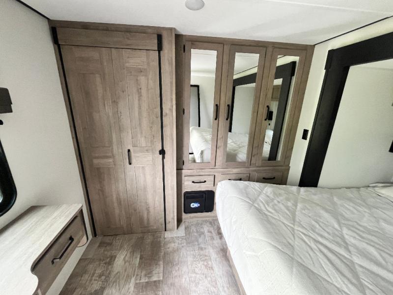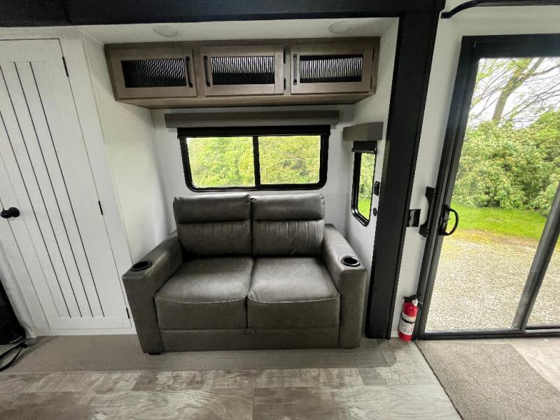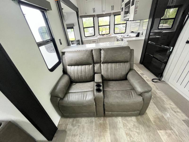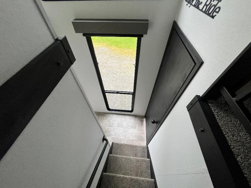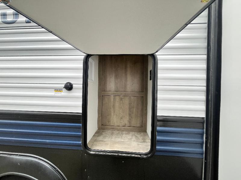 This is the perfect destination trailer for a larger group since it can sleep up to nine campers each night. The little ones will love the double loft areas with three bunk mats and storage space for their things, while you take the rear private bedroom. There is a king bed slide out here, along with a wardrobe/closet for your clothes, plus a second closet with the option to add washer and dryer prep. Everyone can meet in the middle living room to relax on the dual sofas or recliners across from the fireplace and entertainment center. Head to the front of the unit where you'll find the kitchen that includes ample counter space to prep meals, a residential style refrigerator and pantry for food storage, and a free-standing table to dine at. There is also a breakfast nook that overlooks the living area so you can visit with the cook and watch a movie at the same time!