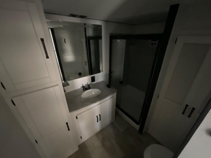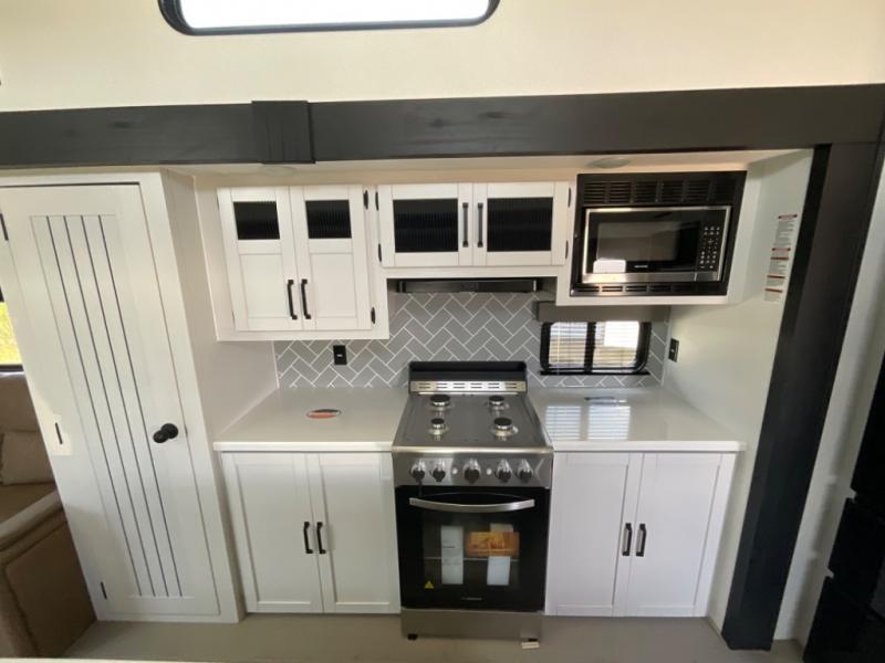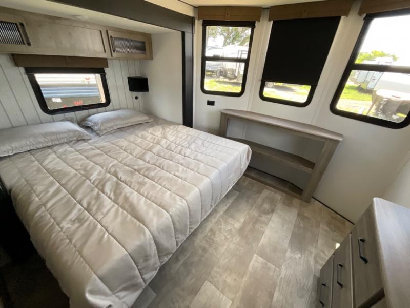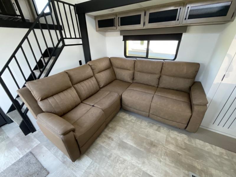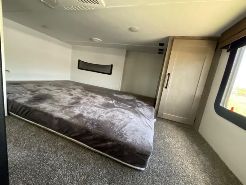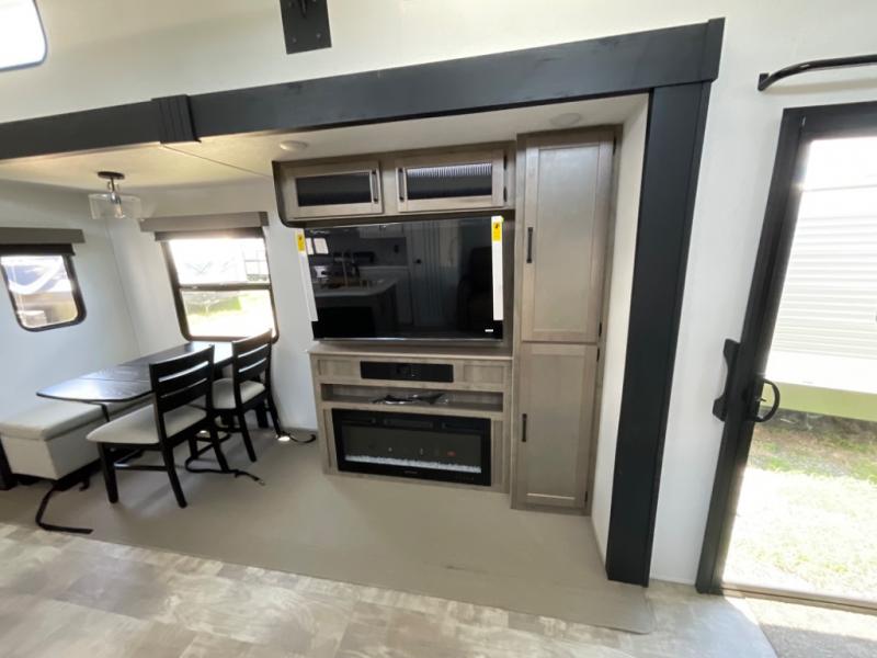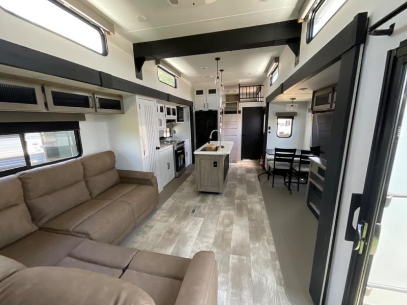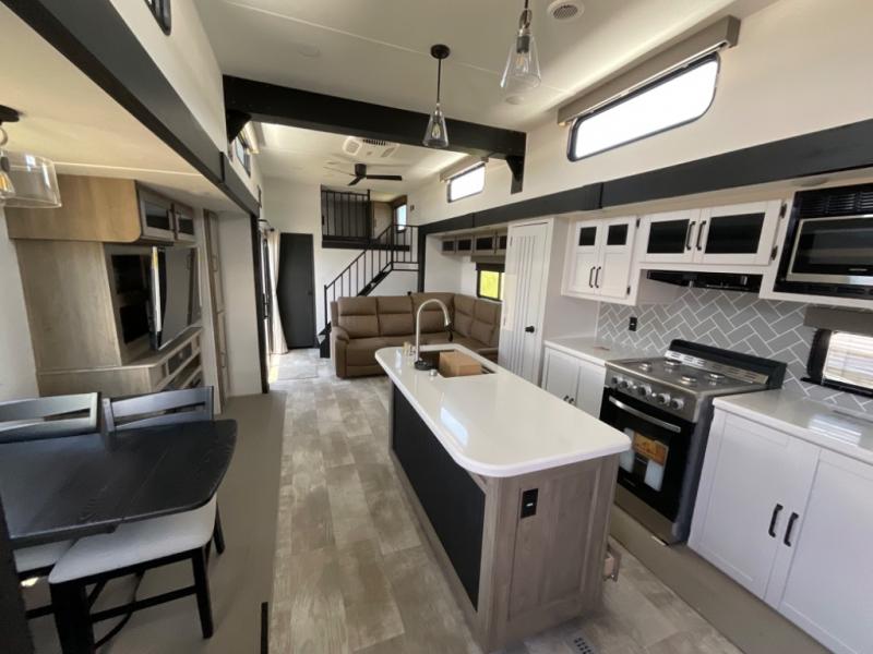 Head to your favorite spots with this destination trailer! With two entry doors, you can easily enter or exit the unit. The front private bedroom includes a king bed slide out, a wardrobe and dresser to keep your clothes organized, plus a countertop for your books or jewelry. Just outside this room is the ladder that leads to the large loft area with two 32" x 80" bunk mats, a cubby, a counter, a nightstand, and cabinets. Once you've headed back downstairs, you can relax on the L-shaped sofa across from the entertainment center with a fireplace and slide-out cabinet or the free-standing table with a bench and two seats. And the chef of your group will love the kitchen with its residential style refrigerator and pantry, kitchen island, and four burner cooktop. The full rear bathroom not only has a 32" x 40" shower with a seat to freshen up in and a closet prepped to add the optional washer and dryer, but is also below the second loft with a 32" x 80" bunk mat and closet for storage!