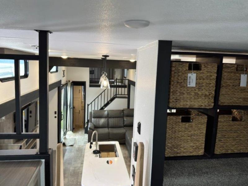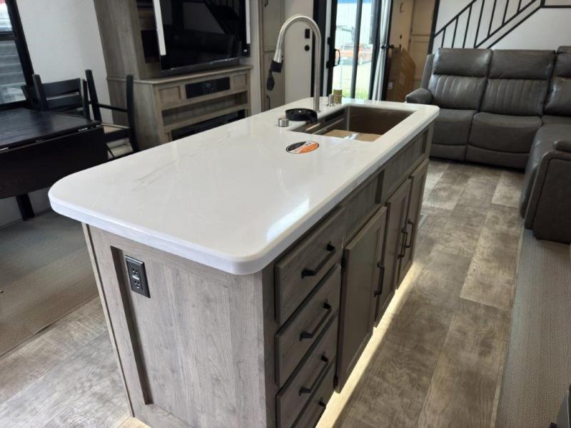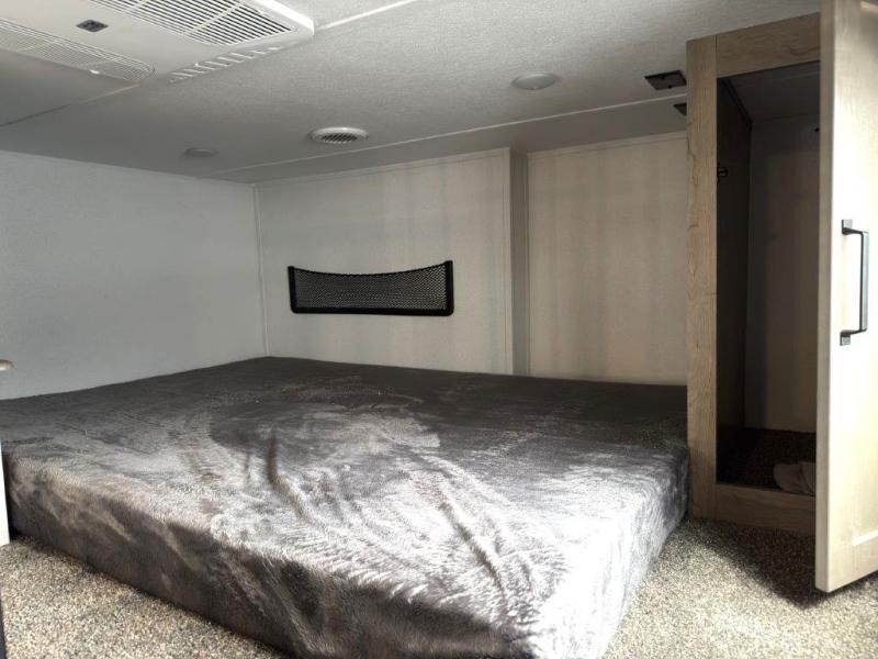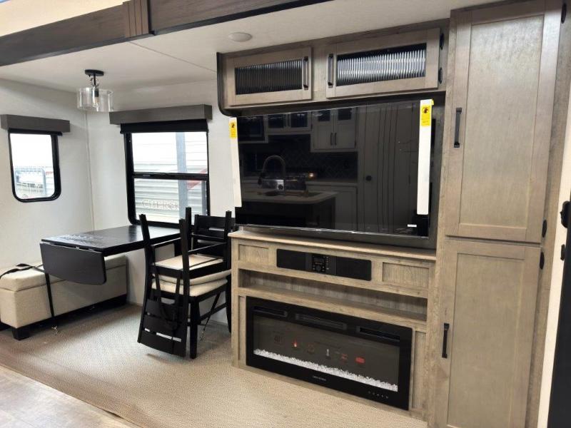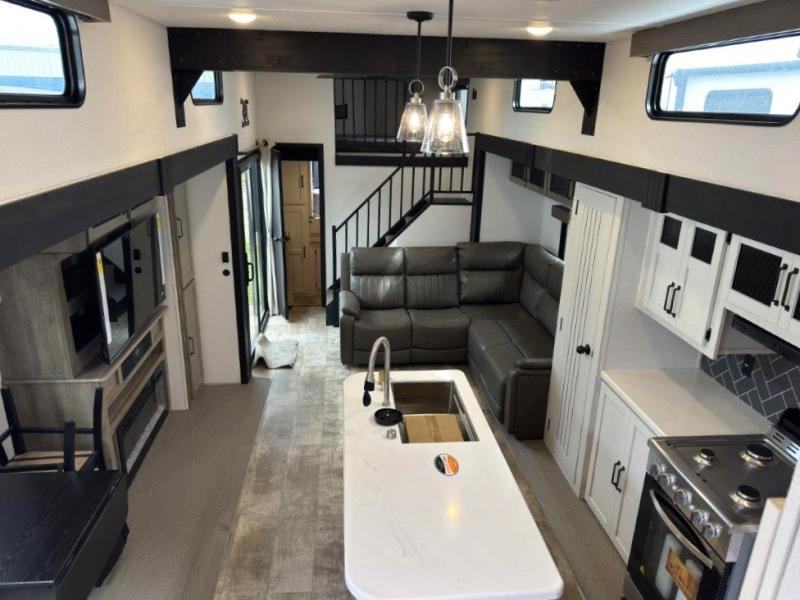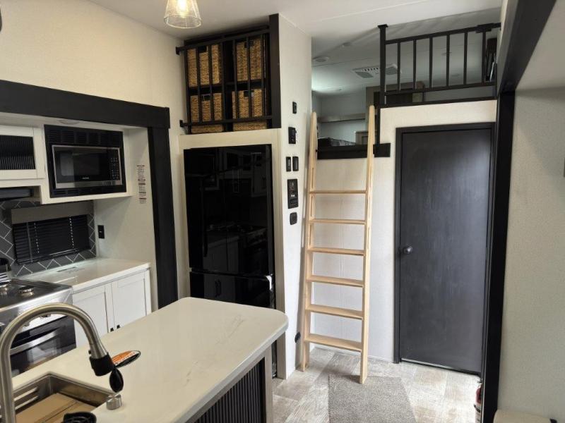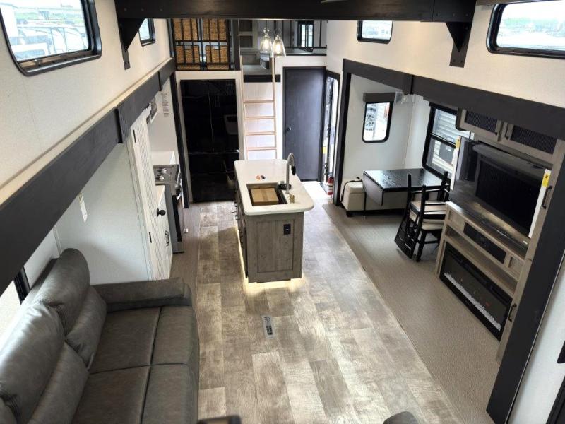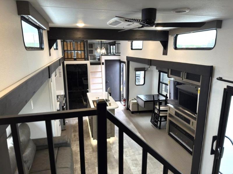 Head to your favorite spots with this destination trailer! With two entry doors, you can easily enter or exit the unit. The front private bedroom includes a king bed slide out, a wardrobe and dresser to keep your clothes organized, plus a countertop for your books or jewelry. Just outside this room is the ladder that leads to the large loft area with two 32" x 80" bunk mats, a cubby, a counter, a nightstand, and cabinets. Once you've headed back downstairs, you can relax on the L-shaped sofa across from the entertainment center with a fireplace and slide-out cabinet or the free-standing table with a bench and two seats. And the chef of your group will love the kitchen with its residential style refrigerator and pantry, kitchen island, and four burner cooktop. The full rear bathroom not only has a 32" x 40" shower with a seat to freshen up in and a closet prepped to add the optional washer and dryer, but is also below the second loft with a 32" x 80" bunk mat and closet for storage!