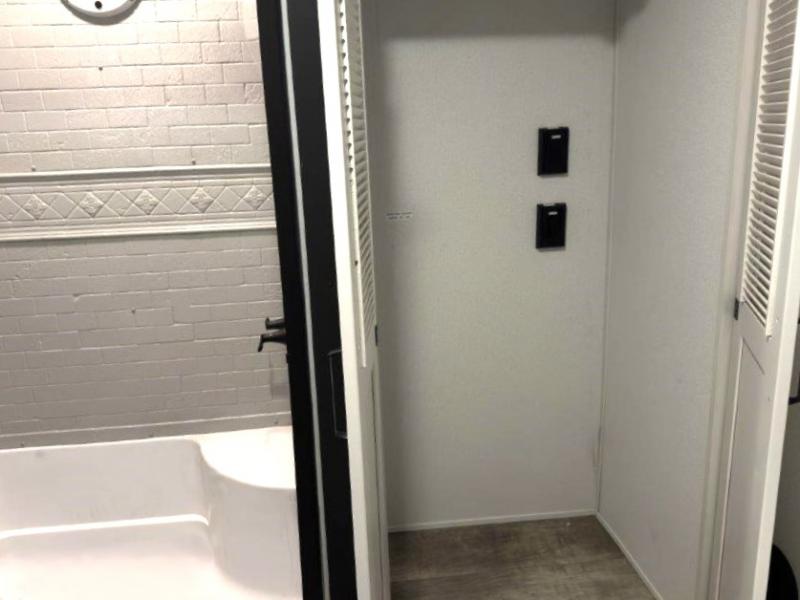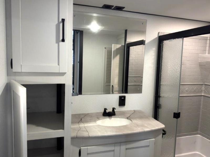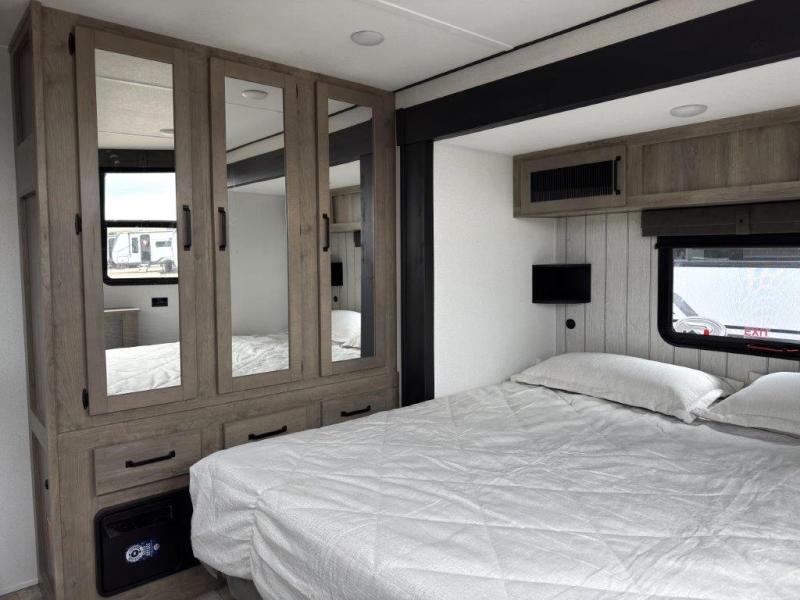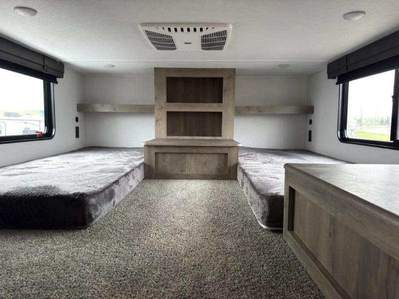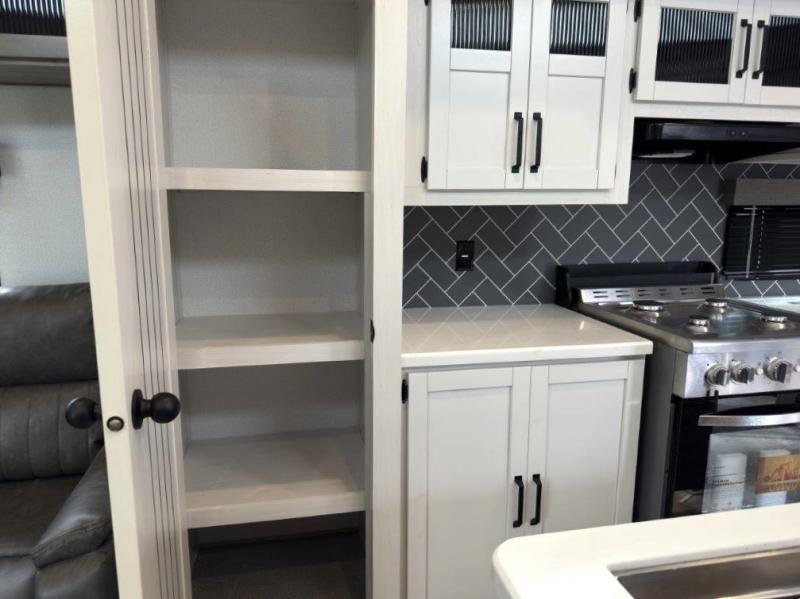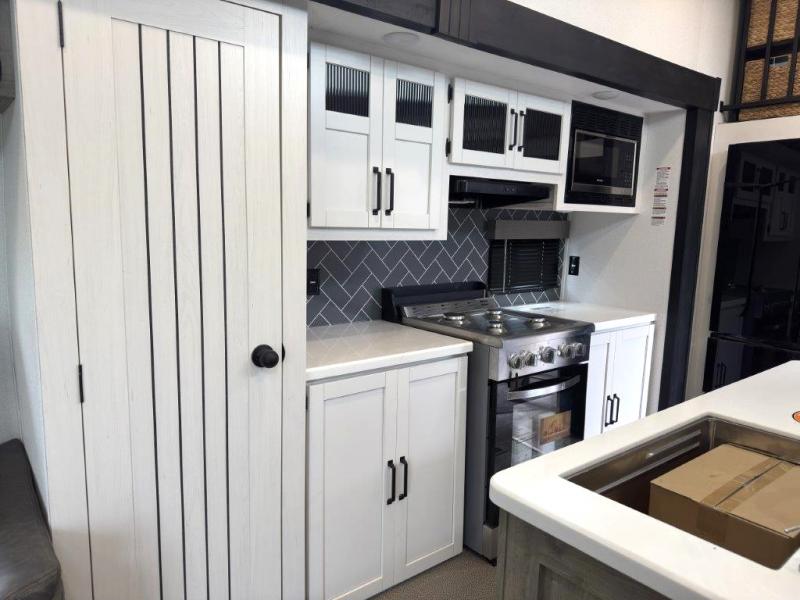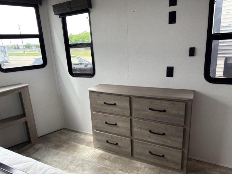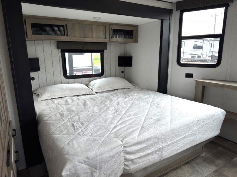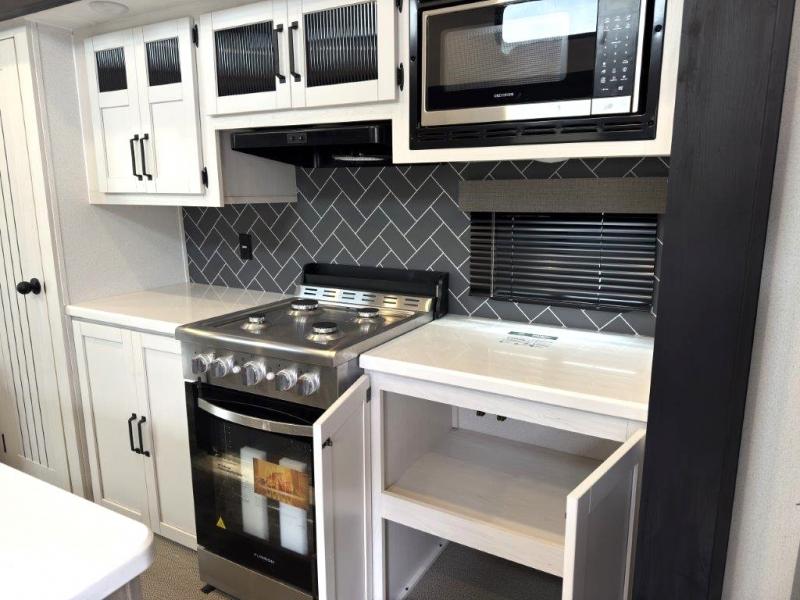 Head to your favorite spots with this destination trailer! With two entry doors, you can easily enter or exit the unit. The front private bedroom includes a king bed slide out, a wardrobe and dresser to keep your clothes organized, plus a countertop for your books or jewelry. Just outside this room is the ladder that leads to the large loft area with two 32" x 80" bunk mats, a cubby, a counter, a nightstand, and cabinets. Once you've headed back downstairs, you can relax on the L-shaped sofa across from the entertainment center with a fireplace and slide-out cabinet or the free-standing table with a bench and two seats. And the chef of your group will love the kitchen with its residential style refrigerator and pantry, kitchen island, and four burner cooktop. The full rear bathroom not only has a 32" x 40" shower with a seat to freshen up in and a closet prepped to add the optional washer and dryer, but is also below the second loft with a 32" x 80" bunk mat and closet for storage!