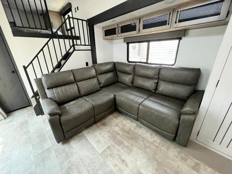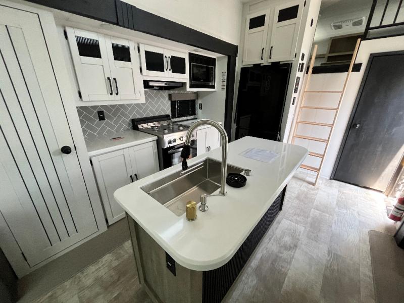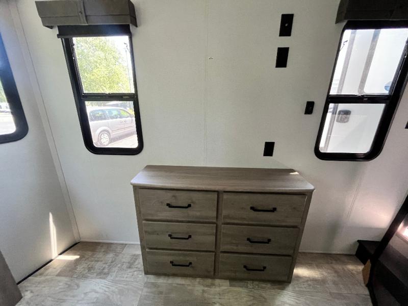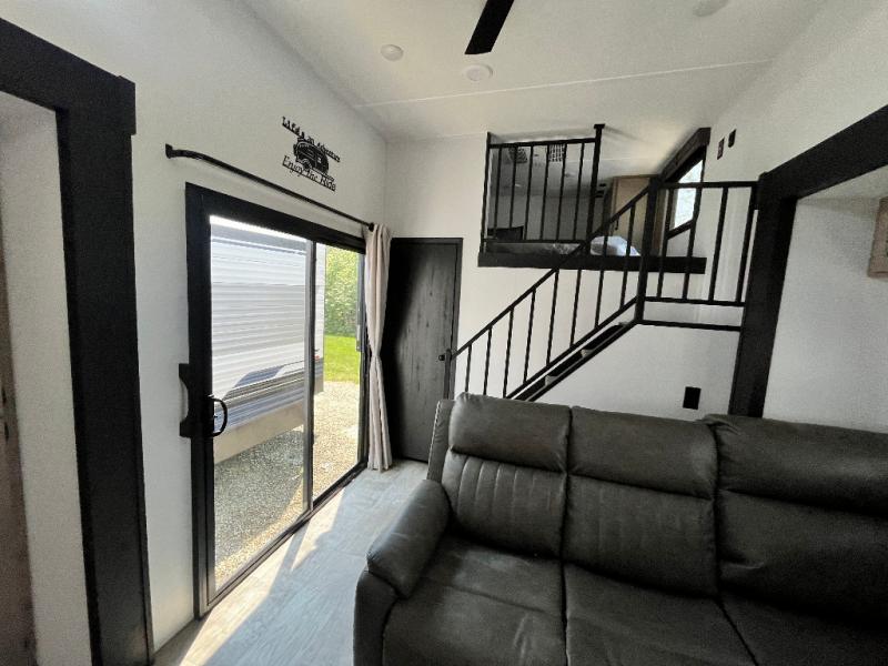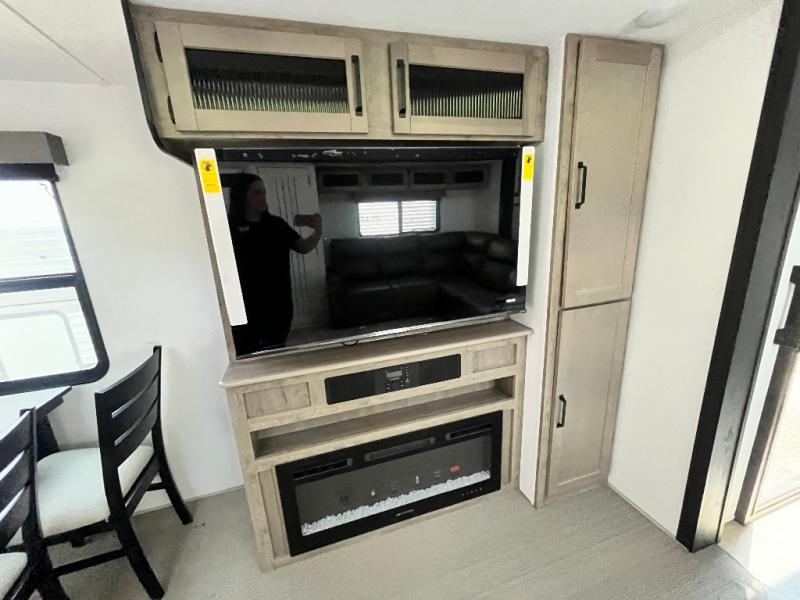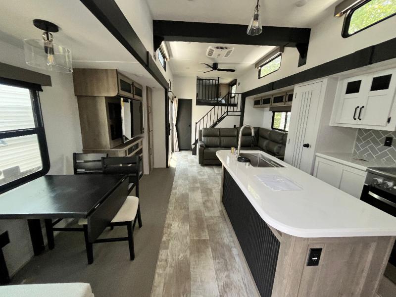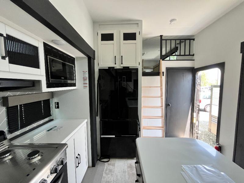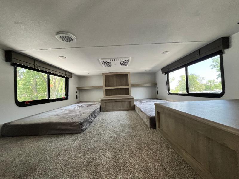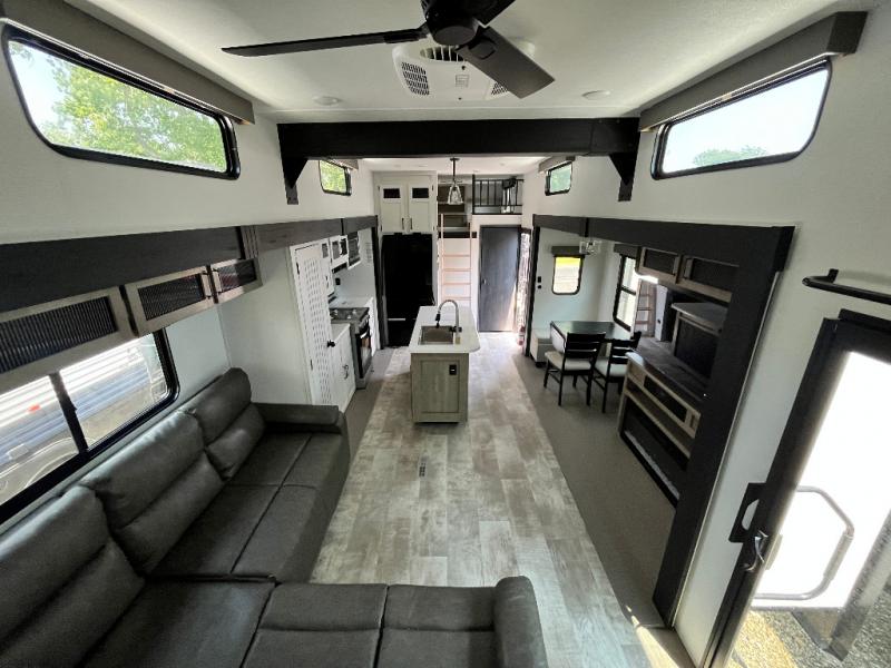 Head to your favorite spots with this destination trailer! With two entry doors, you can easily enter or exit the unit. The front private bedroom includes a king bed slide out, a wardrobe and dresser to keep your clothes organized, plus a countertop for your books or jewelry. Just outside this room is the ladder that leads to the large loft area with two 32" x 80" bunk mats, a cubby, a counter, a nightstand, and cabinets. Once you've headed back downstairs, you can relax on the L-shaped sofa across from the entertainment center with a fireplace and slide-out cabinet or the free-standing table with a bench and two seats. And the chef of your group will love the kitchen with its residential style refrigerator and pantry, kitchen island, and four burner cooktop. The full rear bathroom not only has a 32" x 40" shower with a seat to freshen up in and a closet prepped to add the optional washer and dryer, but is also below the second loft with a 32" x 80" bunk mat and closet for storage!