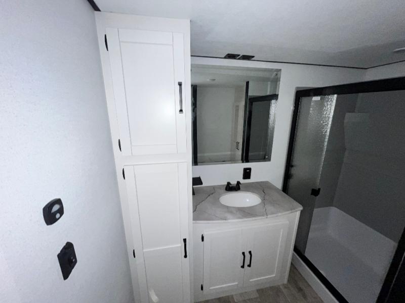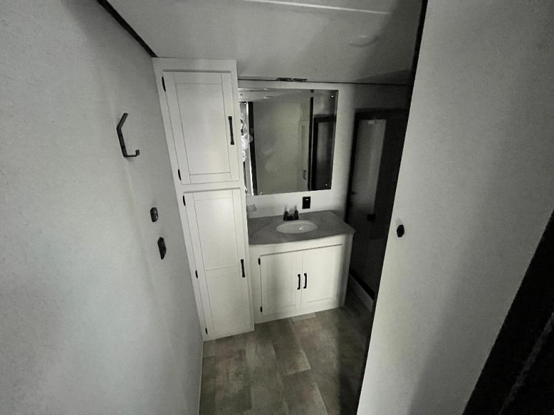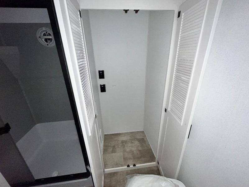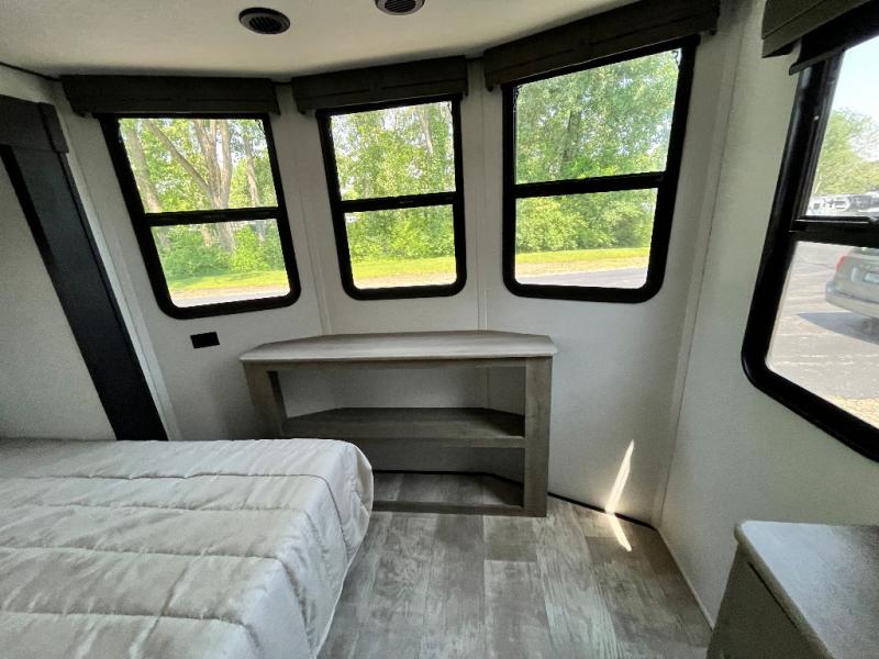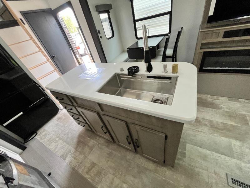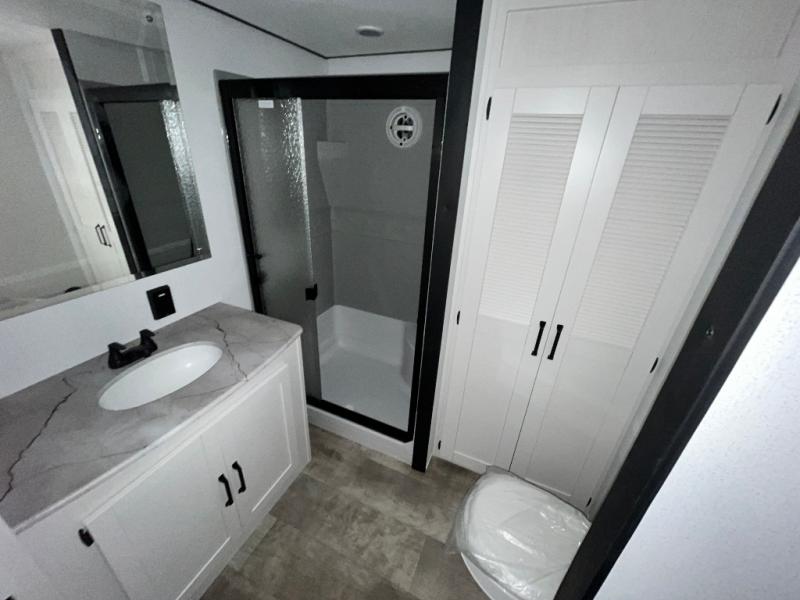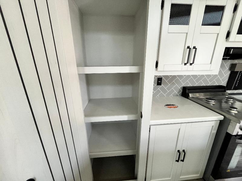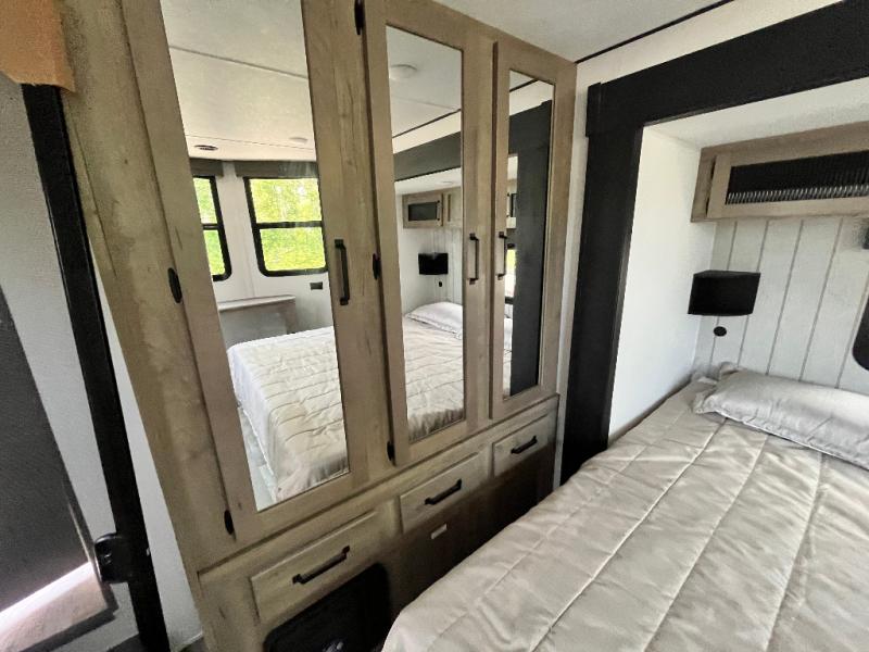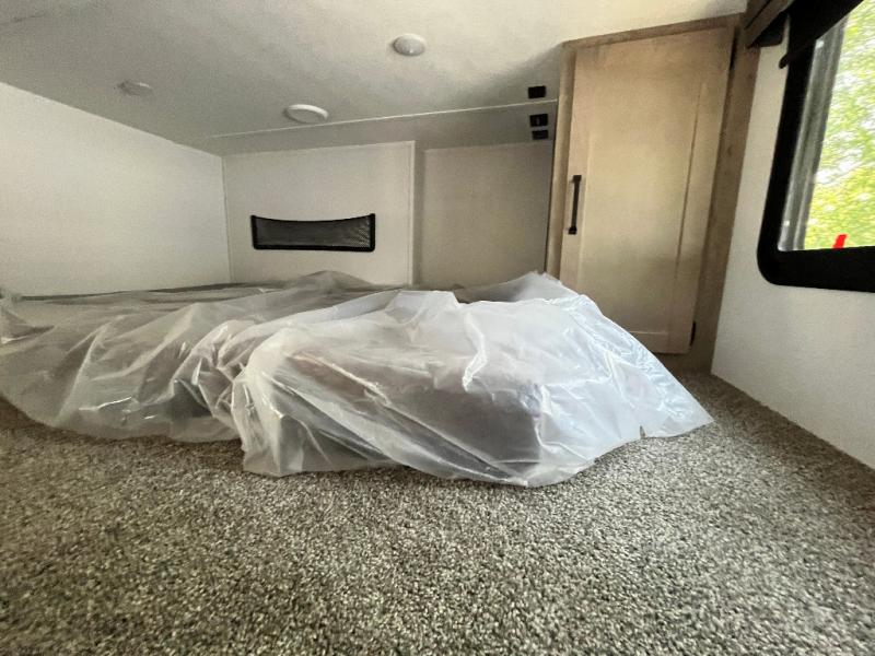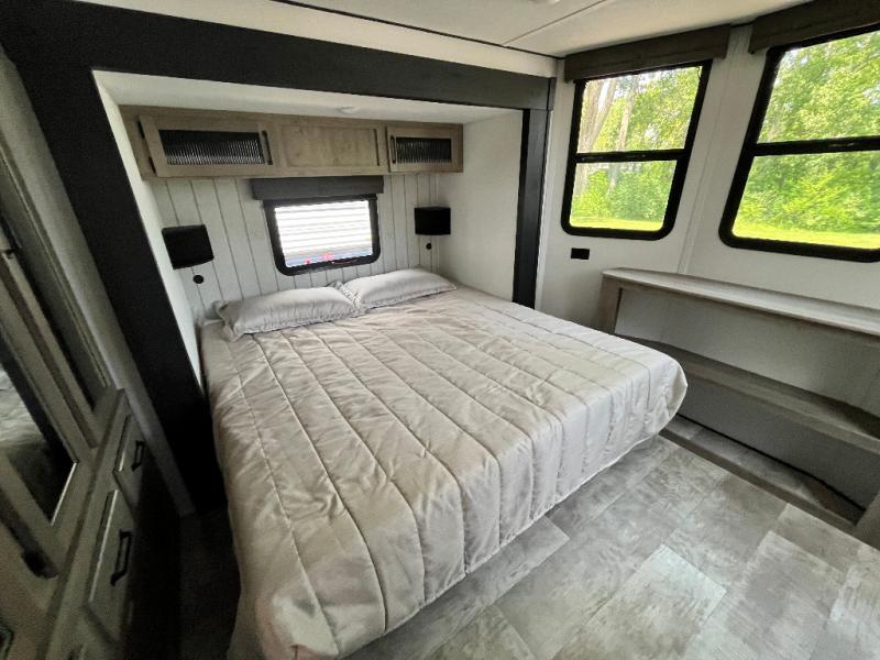 Head to your favorite spots with this destination trailer! With two entry doors, you can easily enter or exit the unit. The front private bedroom includes a king bed slide out, a wardrobe and dresser to keep your clothes organized, plus a countertop for your books or jewelry. Just outside this room is the ladder that leads to the large loft area with two 32" x 80" bunk mats, a cubby, a counter, a nightstand, and cabinets. Once you've headed back downstairs, you can relax on the L-shaped sofa across from the entertainment center with a fireplace and slide-out cabinet or the free-standing table with a bench and two seats. And the chef of your group will love the kitchen with its residential style refrigerator and pantry, kitchen island, and four burner cooktop. The full rear bathroom not only has a 32" x 40" shower with a seat to freshen up in and a closet prepped to add the optional washer and dryer, but is also below the second loft with a 32" x 80" bunk mat and closet for storage!