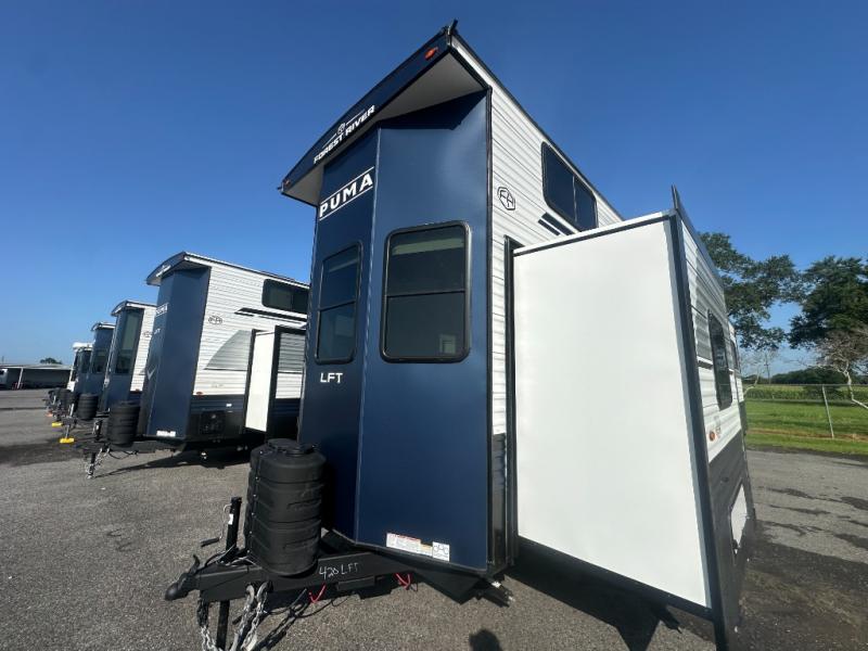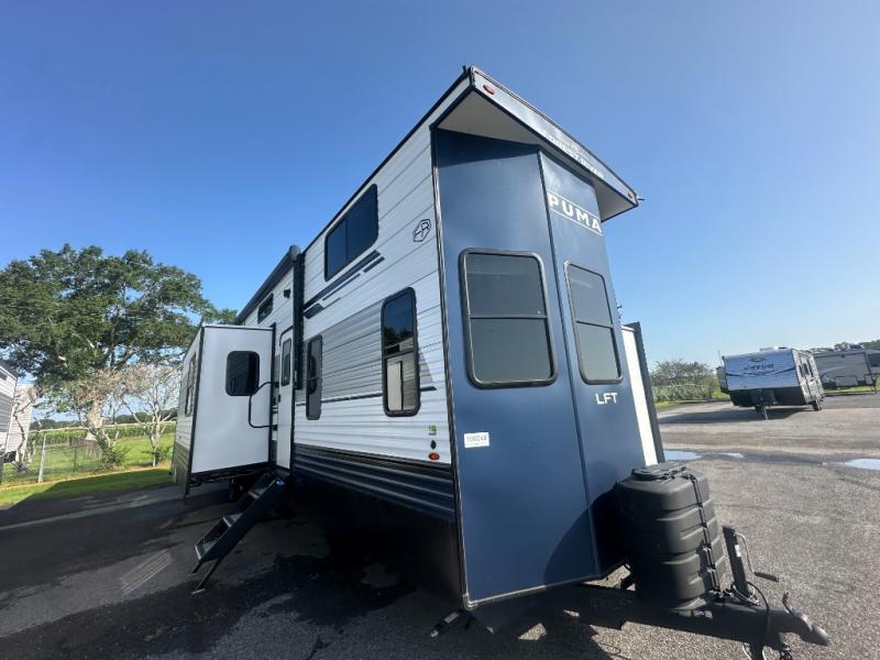 Each Puma Destination trailer by Palomino is designed to give you unforgettable getaways to the destination of your choice! The required Value Shopper Loft Package includes Congoleum designer linoleum, night roller shades, LED lighting, and a 24" stainless steel oven with a four burner stove so you can make meals just like you would at home. The tankless water heater is another feature you won't want to camp without, and there is WiFi prep, solar prep, plus optional washer and dryer prep for the option to further customize your trailer. An outside shower is included with the required Loft Package, along with two exterior speakers, solid surface countertops, four stabilizer jacks, and more!