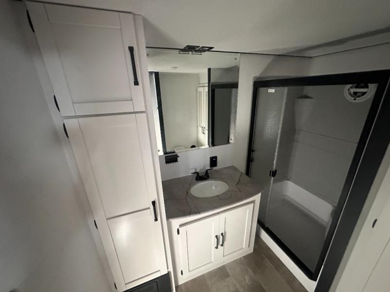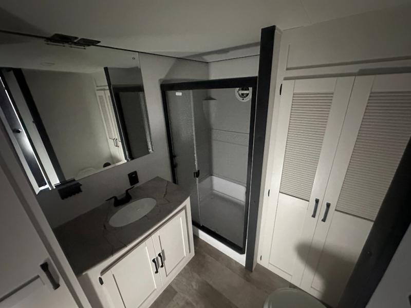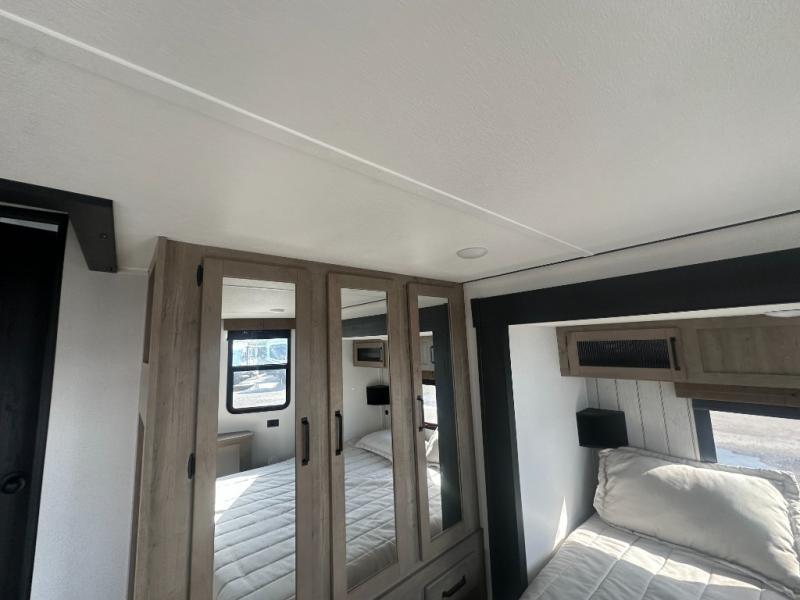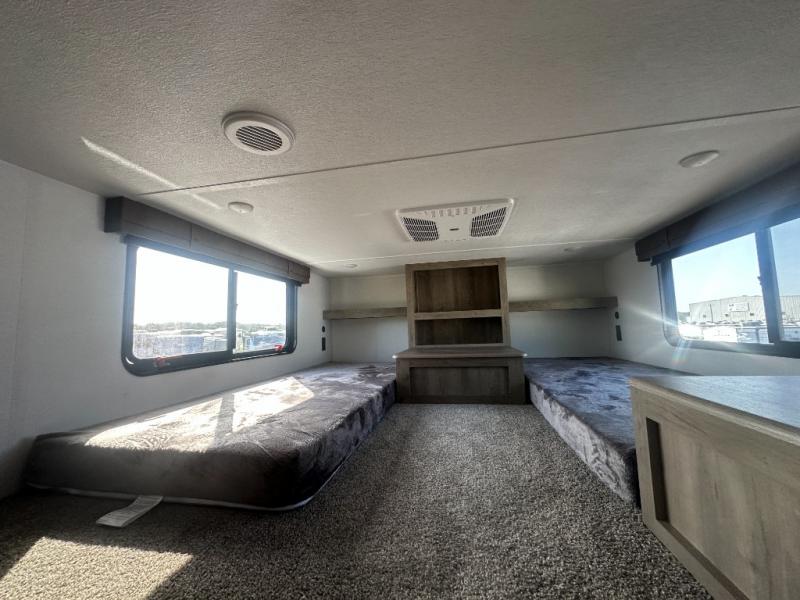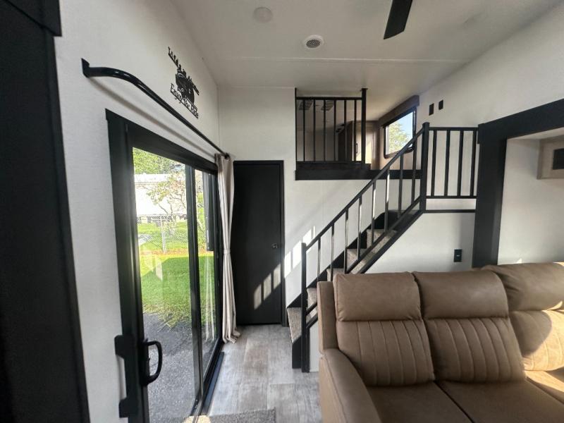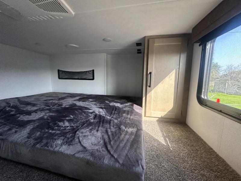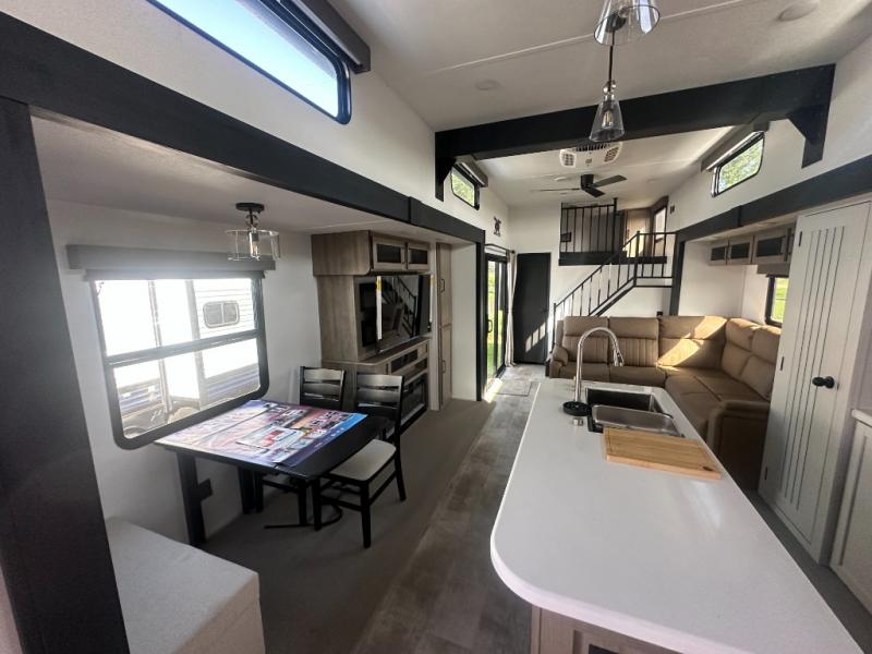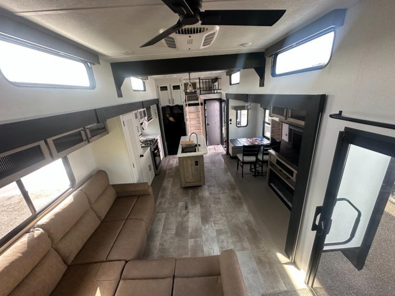 Head to your favorite spots with this destination trailer! With two entry doors, you can easily enter or exit the unit. The front private bedroom includes a king bed slide out, a wardrobe and dresser to keep your clothes organized, plus a countertop for your books or jewelry. Just outside this room is the ladder that leads to the large loft area with two 32" x 80" bunk mats, a cubby, a counter, a nightstand, and cabinets. Once you've headed back downstairs, you can relax on the L-shaped sofa across from the entertainment center with a fireplace and slide-out cabinet or the free-standing table with a bench and two seats. And the chef of your group will love the kitchen with its residential style refrigerator and pantry, kitchen island, and four burner cooktop. The full rear bathroom not only has a 32" x 40" shower with a seat to freshen up in and a closet prepped to add the optional washer and dryer, but is also below the second loft with a 32" x 80" bunk mat and closet for storage!