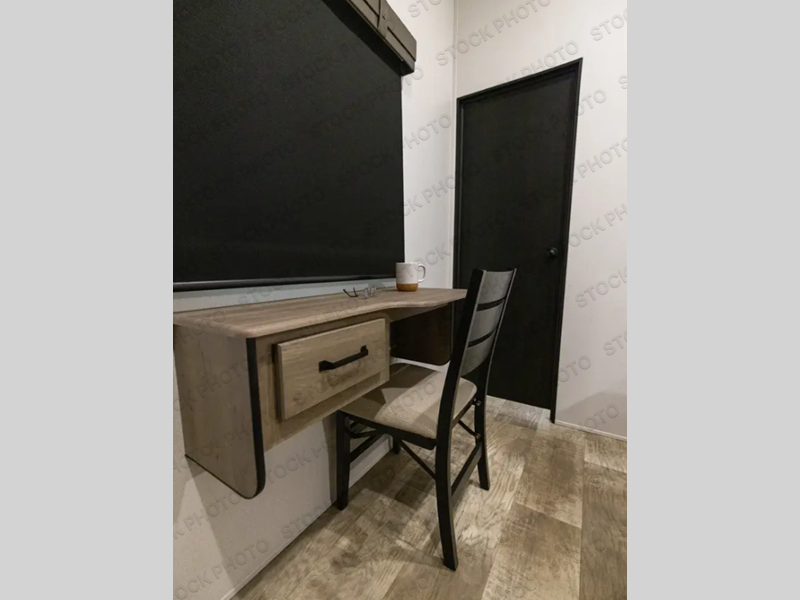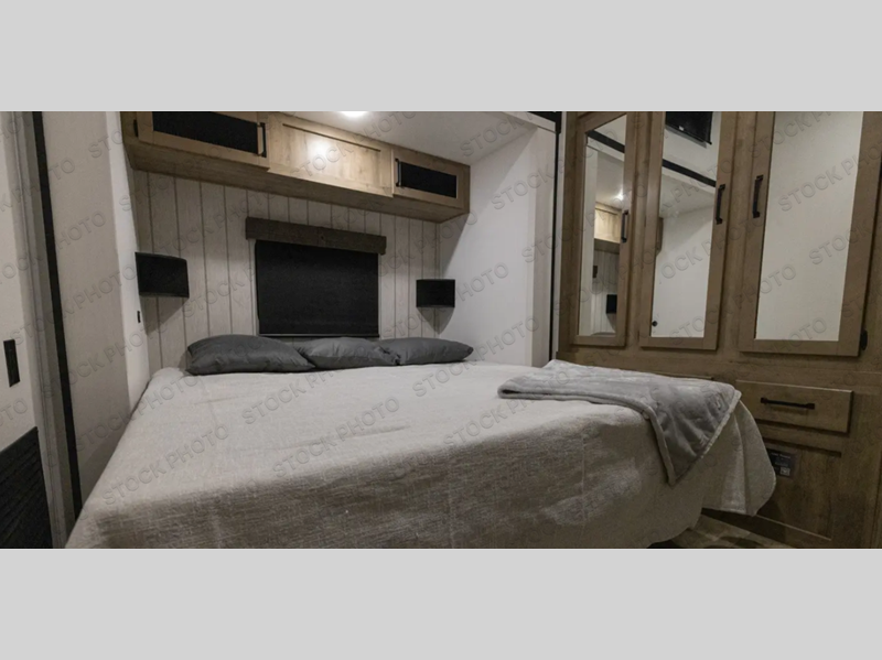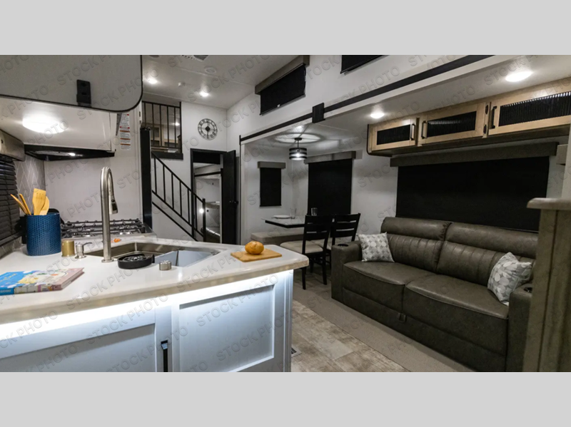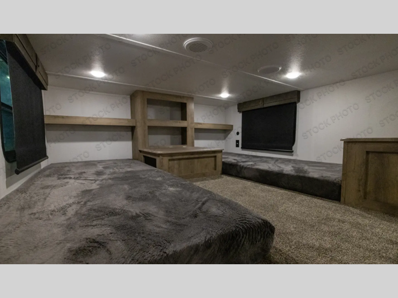 If you're planning to camp with a larger group or your family, this destination trailer will provide everything you're looking for! Your guests can take the rear bunkhouse suite that includes a slide out with a jiffy sofa and bunk bed, an entertainment center, and a full bath. You'll also find one of the dual entry doors here for added convenience. There are steps just outside the bunkhouse that lead to the loft with two bunk mats and storage space to keep this space tidy! The front private bedroom will be perfect for you with its king bed slide out, wardrobe/closet, and bedroom desk if you're needing to work from home. There is even a closet with the option to add washer and dryer prep. In the morning, everyone can meet in the combined middle living area and kitchen. A large slide out here houses the free-standing table and sofa, and the fireplace is close by to make it feel a little more like home!