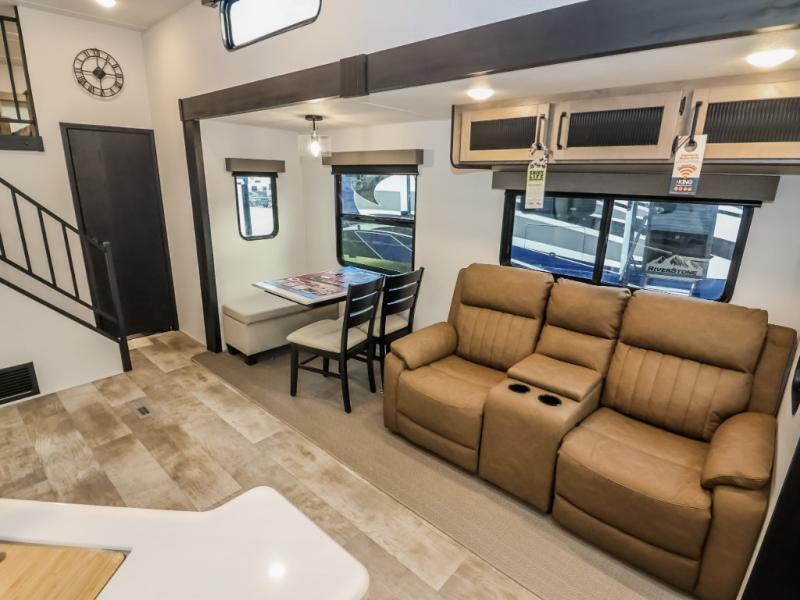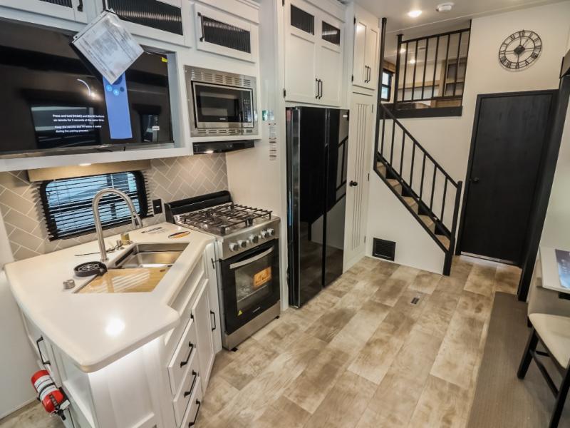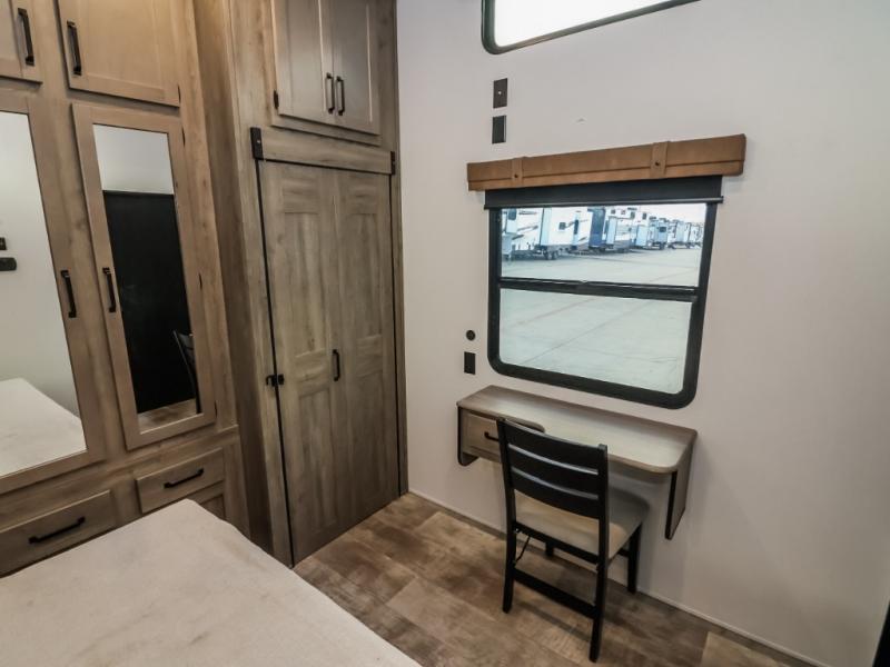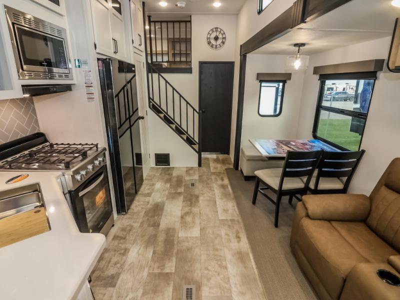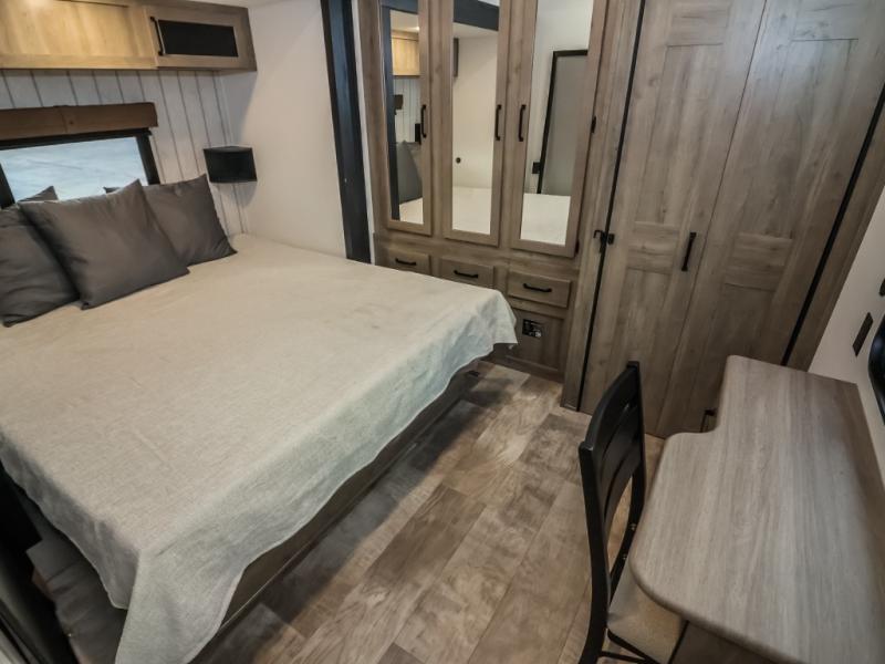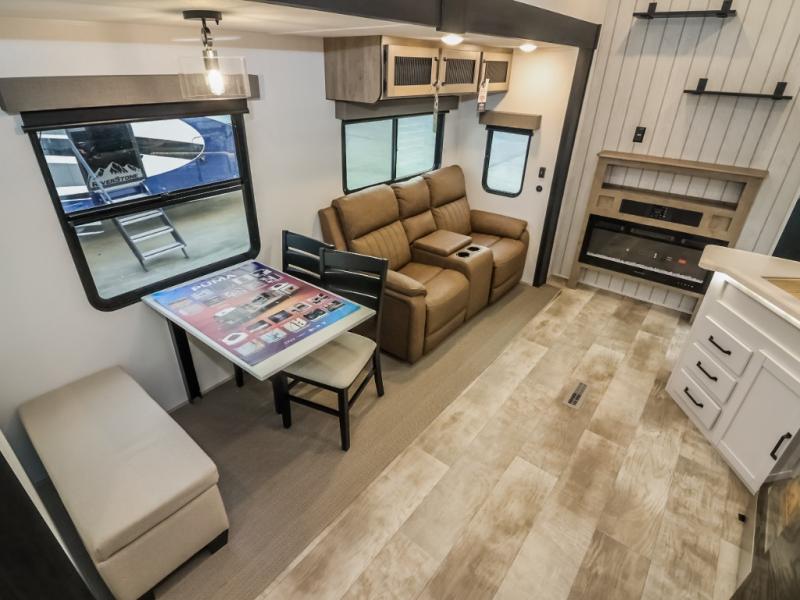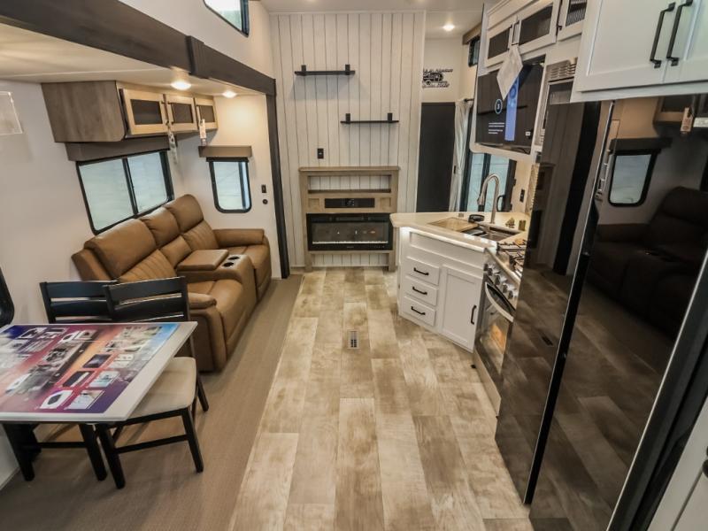 If you're planning to camp with a larger group or your family, this destination trailer will provide everything you're looking for! Your guests can take the rear bunkhouse suite that includes a slide out with a jiffy sofa and bunk bed, an entertainment center, and a full bath. You'll also find one of the dual entry doors here for added convenience. There are steps just outside the bunkhouse that lead to the loft with two bunk mats and storage space to keep this space tidy! The front private bedroom will be perfect for you with its king bed slide out, wardrobe/closet, and bedroom desk if you're needing to work from home. There is even a closet with the option to add washer and dryer prep. In the morning, everyone can meet in the combined middle living area and kitchen. A large slide out here houses the free-standing table and sofa, and the fireplace is close by to make it feel a little more like home!