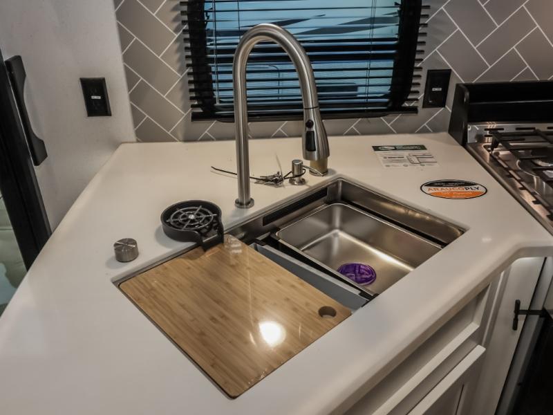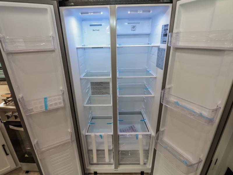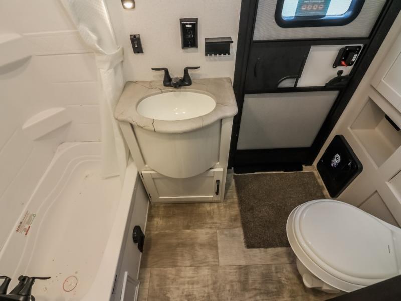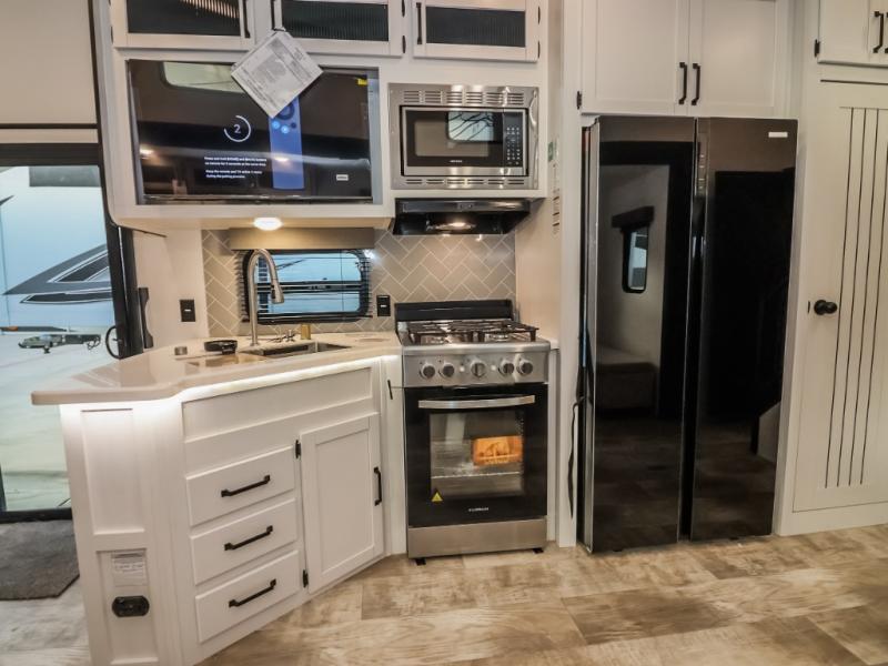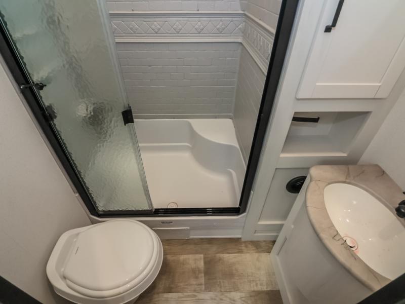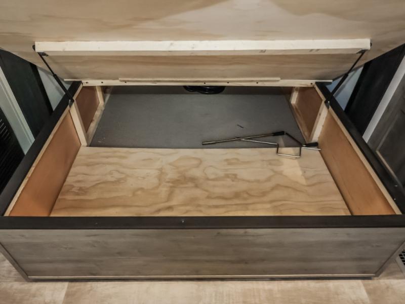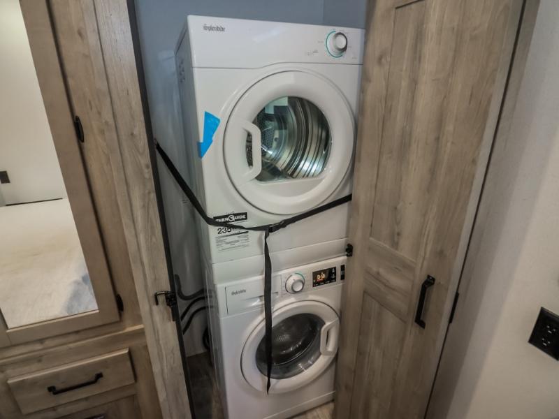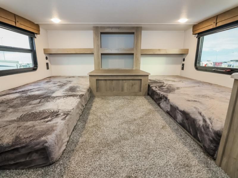 If you're planning to camp with a larger group or your family, this destination trailer will provide everything you're looking for! Your guests can take the rear bunkhouse suite that includes a slide out with a jiffy sofa and bunk bed, an entertainment center, and a full bath. You'll also find one of the dual entry doors here for added convenience. There are steps just outside the bunkhouse that lead to the loft with two bunk mats and storage space to keep this space tidy! The front private bedroom will be perfect for you with its king bed slide out, wardrobe/closet, and bedroom desk if you're needing to work from home. There is even a closet with the option to add washer and dryer prep. In the morning, everyone can meet in the combined middle living area and kitchen. A large slide out here houses the free-standing table and sofa, and the fireplace is close by to make it feel a little more like home!