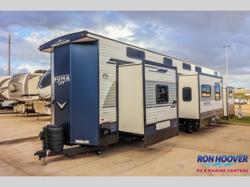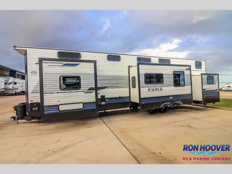 Each Puma Destination trailer by Palomino is designed to give you unforgettable getaways to the destination of your choice! The required Value Shopper Loft Package includes Congoleum designer linoleum, night roller shades, LED lighting, and a 24" stainless steel oven with a four burner stove so you can make meals just like you would at home. The tankless water heater is another feature you won't want to camp without, and there is WiFi prep, solar prep, plus optional washer and dryer prep for the option to further customize your trailer. An outside shower is included with the required Loft Package, along with two exterior speakers, solid surface countertops, four stabilizer jacks, and more!