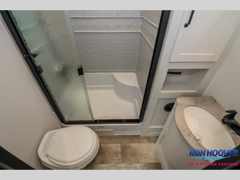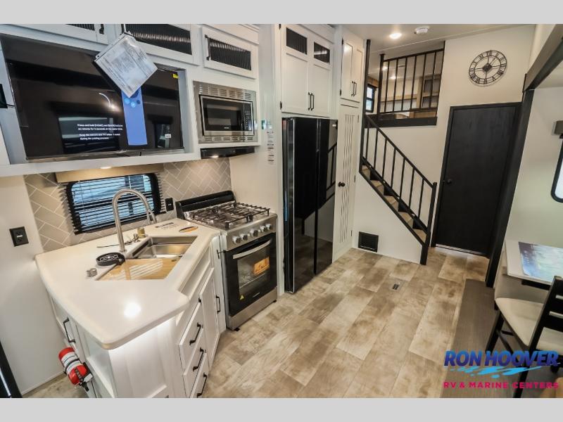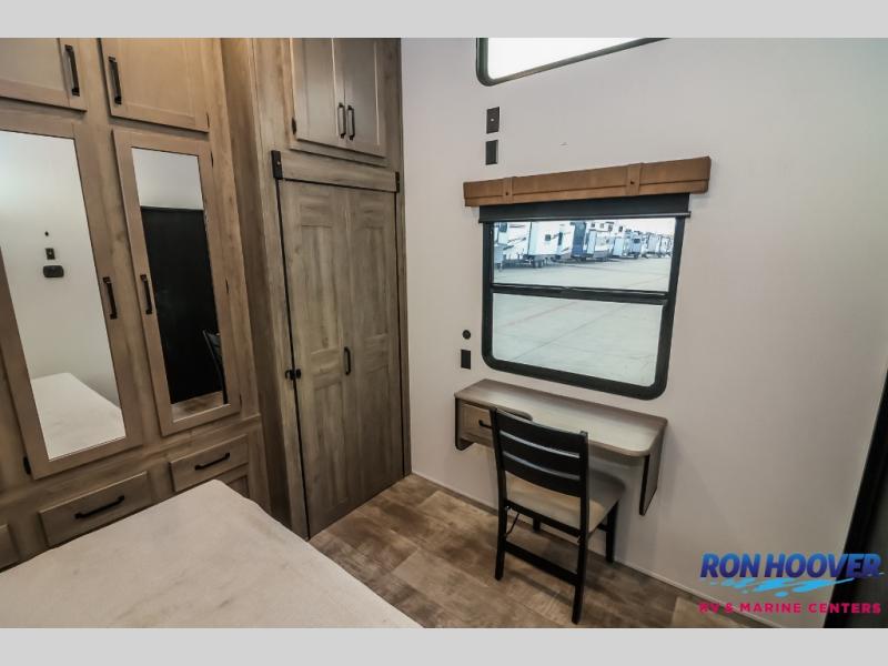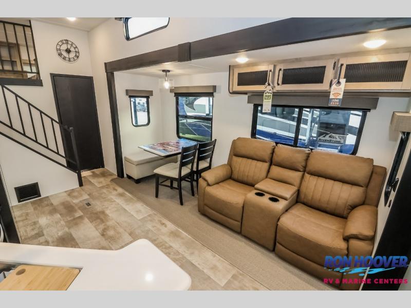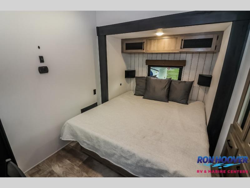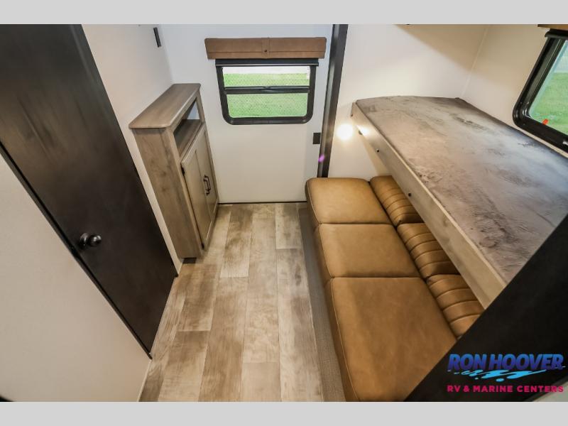 If you're planning to camp with a larger group or your family, this destination trailer will provide everything you're looking for! Your guests can take the rear bunkhouse suite that includes a slide out with a jiffy sofa and bunk bed, an entertainment center, and a full bath. You'll also find one of the dual entry doors here for added convenience. There are steps just outside the bunkhouse that lead to the loft with two bunk mats and storage space to keep this space tidy! The front private bedroom will be perfect for you with its king bed slide out, wardrobe/closet, and bedroom desk if you're needing to work from home. There is even a closet with the option to add washer and dryer prep. In the morning, everyone can meet in the combined middle living area and kitchen. A large slide out here houses the free-standing table and sofa, and the fireplace is close by to make it feel a little more like home!