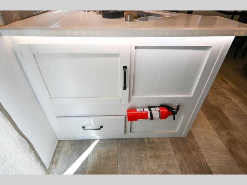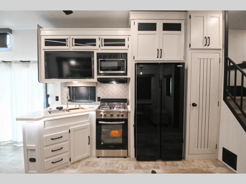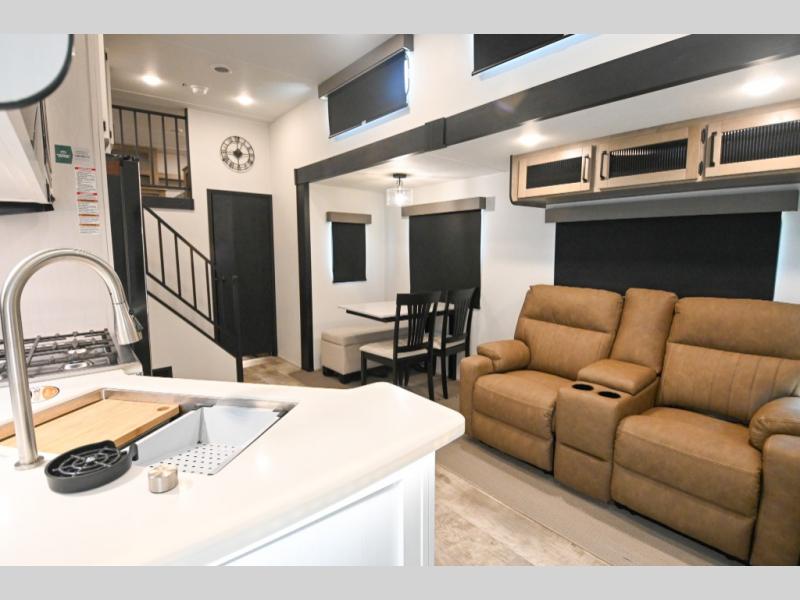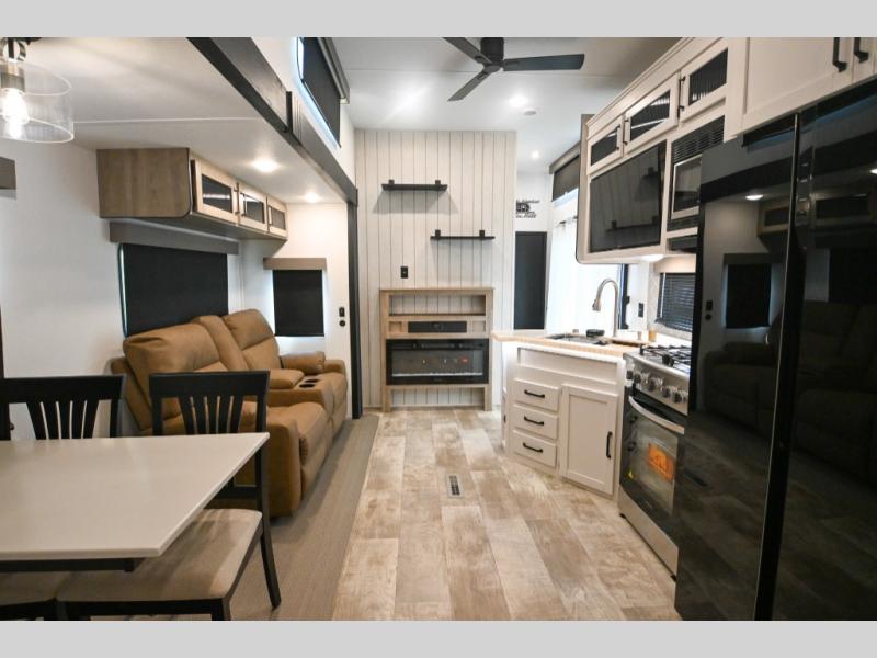 If you're planning to camp with a larger group or your family, this destination trailer will provide everything you're looking for! Your guests can take the rear bunkhouse suite that includes a slide out with a jiffy sofa and bunk bed, an entertainment center, and a full bath. You'll also find one of the dual entry doors here for added convenience. There are steps just outside the bunkhouse that lead to the loft with two bunk mats and storage space to keep this space tidy! The front private bedroom will be perfect for you with its king bed slide out, wardrobe/closet, and bedroom desk if you're needing to work from home. There is even a closet with the option to add washer and dryer prep. In the morning, everyone can meet in the combined middle living area and kitchen. A large slide out here houses the free-standing table and sofa, and the fireplace is close by to make it feel a little more like home!
