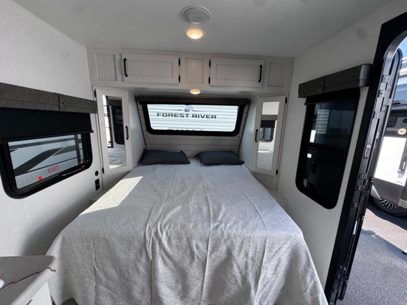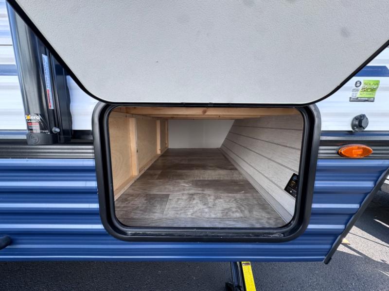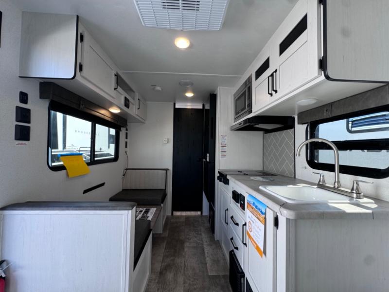 You are going to love this trailer with its rear full bathroom and front walk-around RV queen bed. This is the perfect couple's trailer or smaller family get-away! You will find storage on each side of the bed for your clothing and overhead storage for blankets and such. The booth dinette for two also offers overhead storage for your dry goods, plates and games. The kitchen provides a stainless steel microwave, two-burner cooktop and a 12V refrigerator. And the reason you might have purchased this trailer is the rear full bathroom that offers everything you need and a spacious room to change in.
