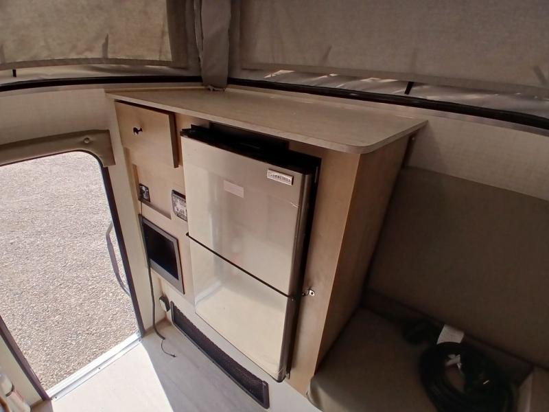 Designed for compact trucks, this soft side truck camper is your ticket to freedom and adventure. The electric roof lift with a remote will provide hassle-free set up, and the one-piece door will allow you to easily enter your camper. You can start lunch on the two burner cooktop once you arrive at your destination, grab a cold drink from the three-way refrigerator, and dine around the U-shaped dinette. The best thing about not sleeping in a tent is having your own 66" x 75" bed and you'll enjoy just that in this truck camper!