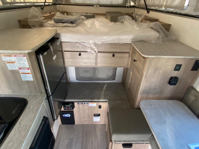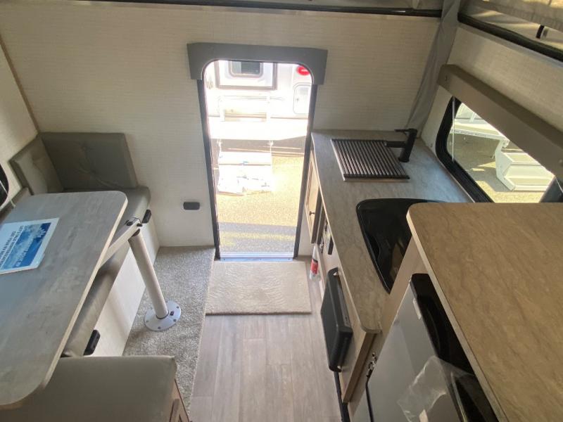 Grab your honey and head to your favorite camping spot in this cozy truck camper. If you have a 1/2 ton truck with a 5' 6" bed up to an 8' bed, it'll be perfect for you. The two burner cooktop allows you to cook your own meals each day, and the three-way refrigerator can store your perishables. There is a U-shaped dinette for two to three people and a wardrobe to store your clothes. This model also includes two foot lockers on either side of the queen bed for your book, phone, or valuables!