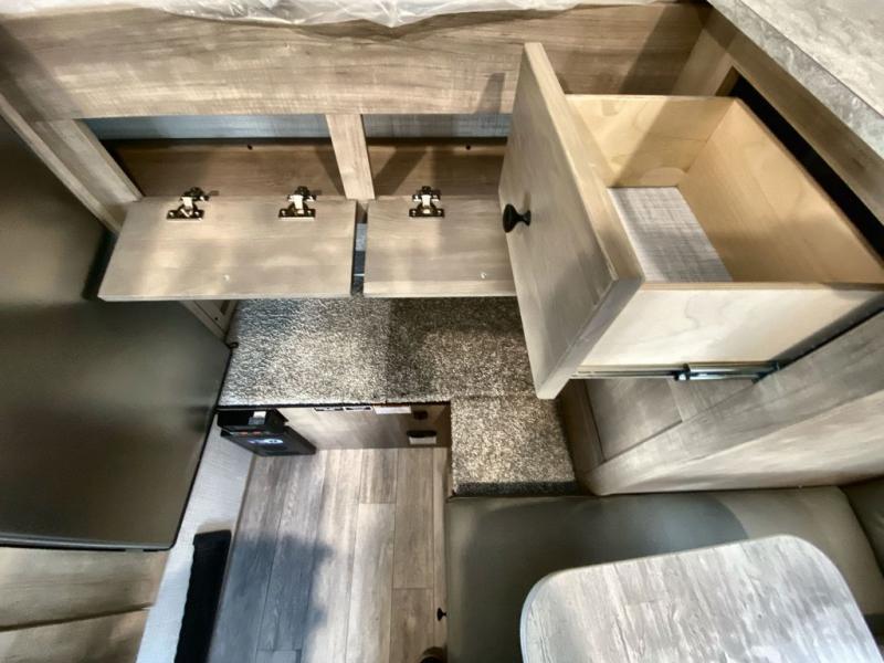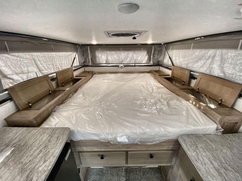Grab your honey and head to your favorite camping spot in this cozy truck camper. If you have a 1/2 ton truck with a 5' 6" bed up to an 8' bed, it'll be perfect for you. The two burner cooktop allows you to cook your own meals each day, and the three-way refrigerator can store your perishables. There is a U-shaped dinette for two to three people and a wardrobe to store your clothes. This model also includes two foot lockers on either side of the queen bed for your book, phone, or valuables!