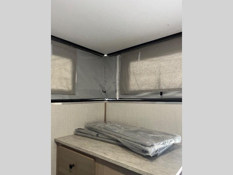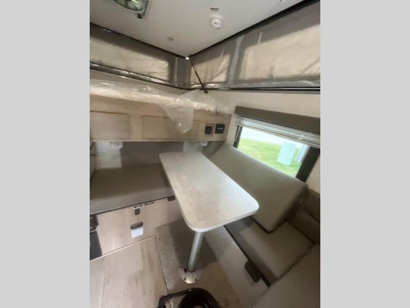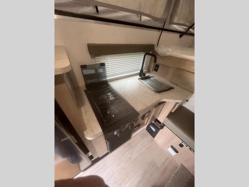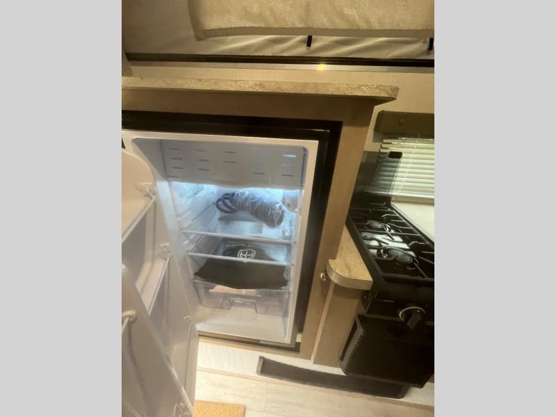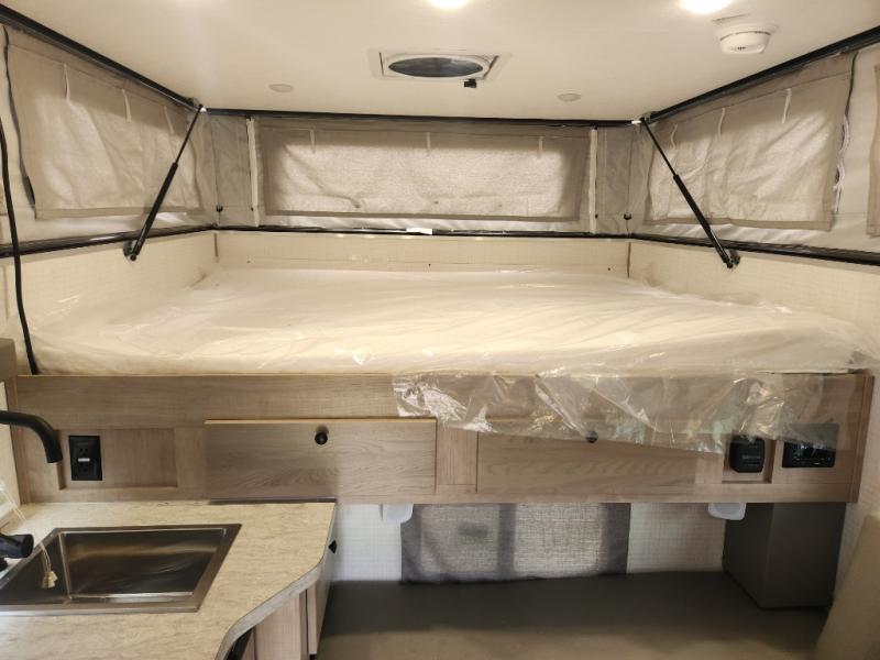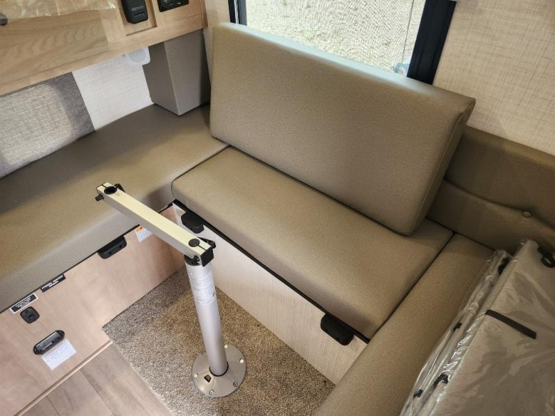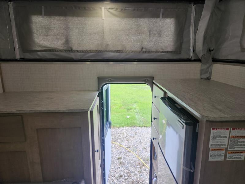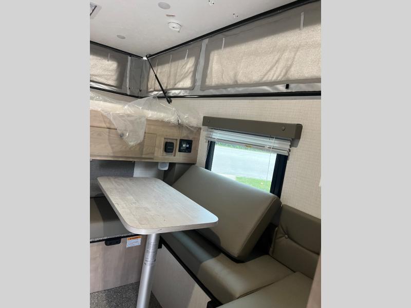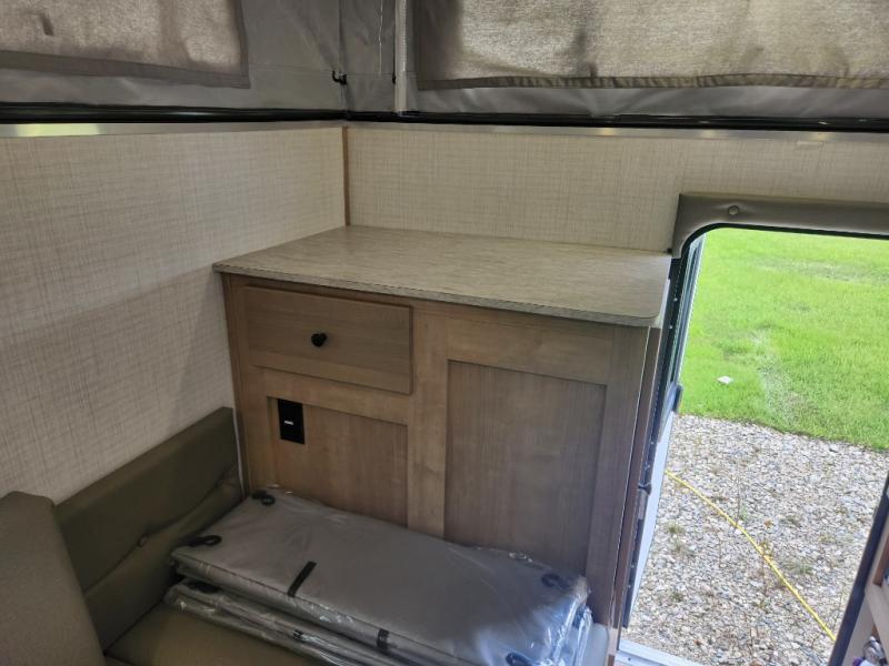 Enjoy your camping trips in comfort with this soft side truck camper. Your 1/2 ton truck with a 6' 6" bed up to an 8' bed will be perfect, and you'll find many at-home comforts inside. Since there is a two burner cooktop, you won't have to cook over an open flame, and the three-way refrigerator will get rid of the need for a large cooler. Sit around the U-shaped dinette that includes seating with storage, plus there is a closet with storage for jackets or shoes.