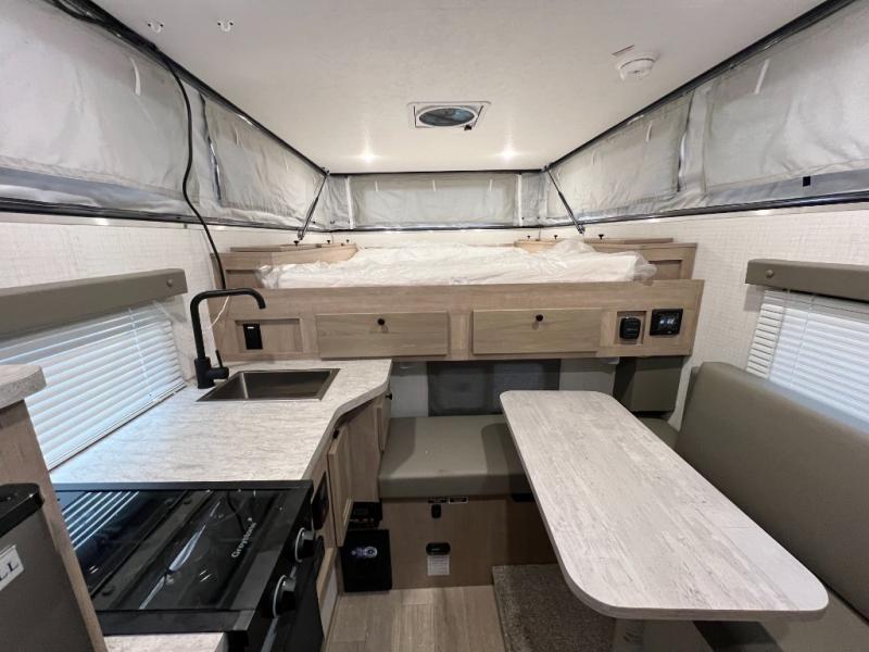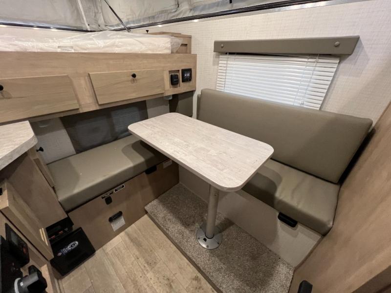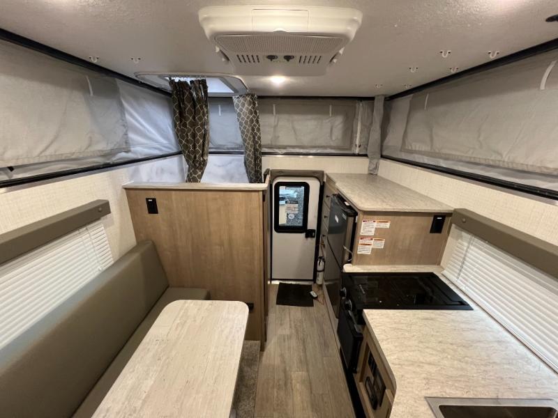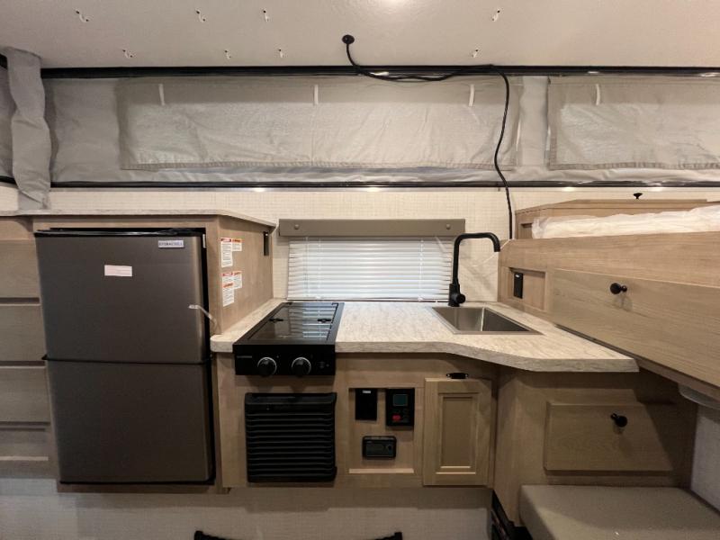 This soft side truck camper is ideal for your 1/2 ton truck with a 6' 6" bed with an overhang. The queen bed up front will allow you to take a rest after driving all day, and you can even freshen up in the wet bath before heading outdoors for some fresh air. Prepare your meals on the two burner cooktop, dine at the L-shaped dinette, then clean up using the full sink. This model also includes a three-way refrigerator, plus storage space for food or valuables.