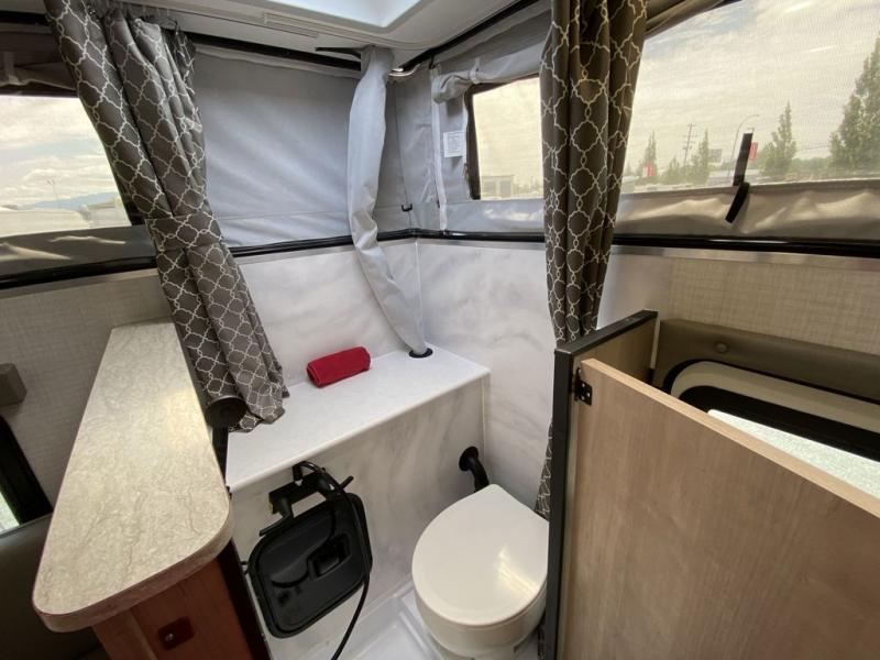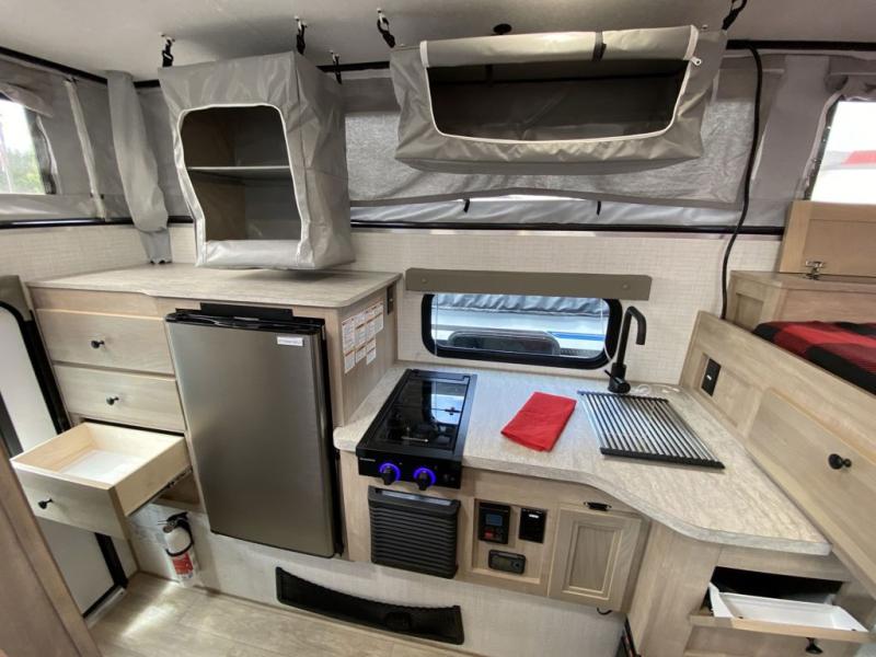 This soft side truck camper is ideal for your 1/2 ton truck with a 6' 6" bed with an overhang. The queen bed up front will allow you to take a rest after driving all day, and you can even freshen up in the wet bath before heading outdoors for some fresh air. Prepare your meals on the two burner cooktop, dine at the L-shaped dinette, then clean up using the full sink. This model also includes a three-way refrigerator, plus storage space for food or valuables.
