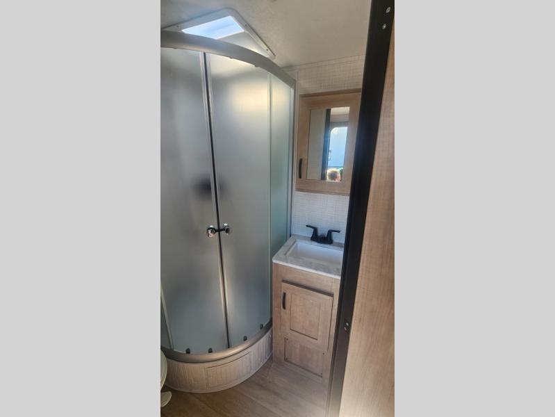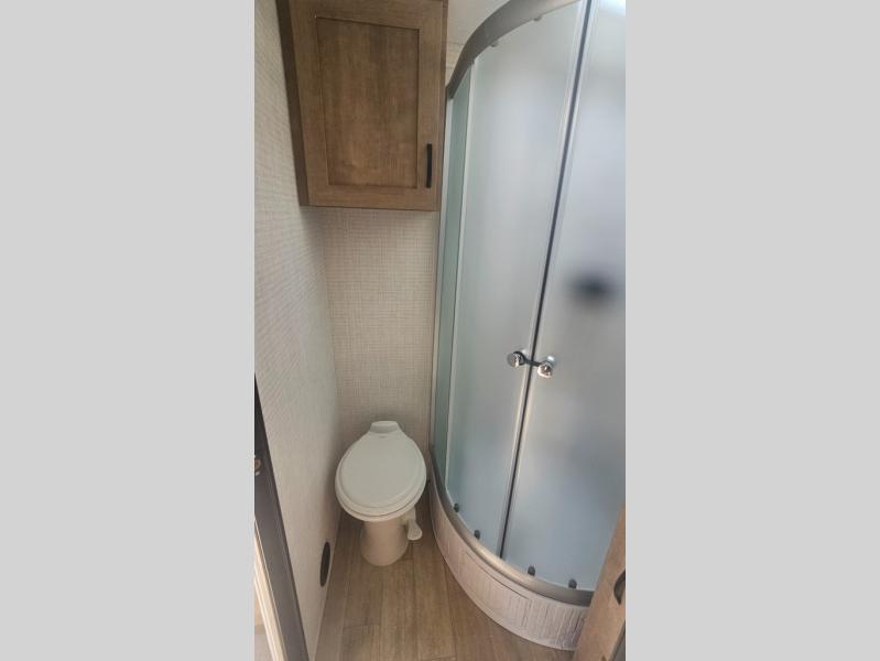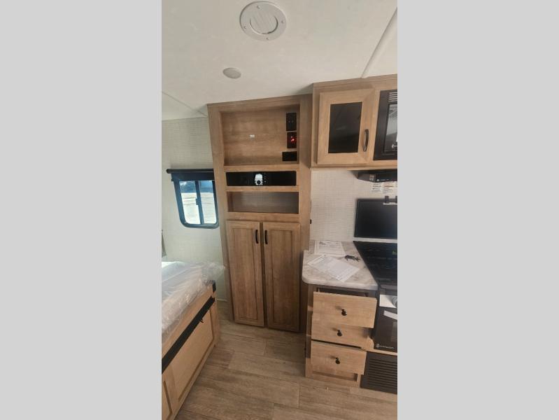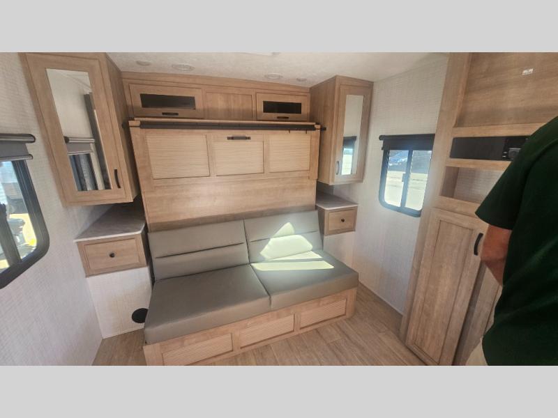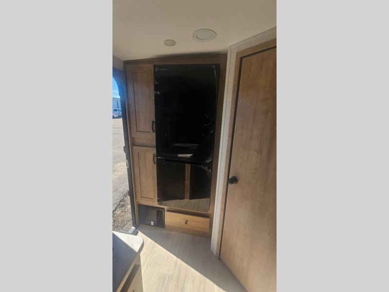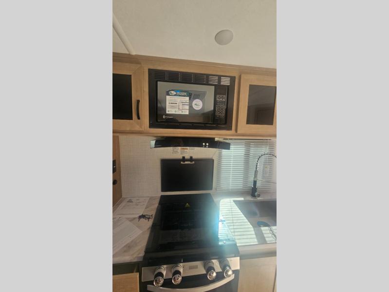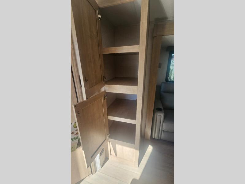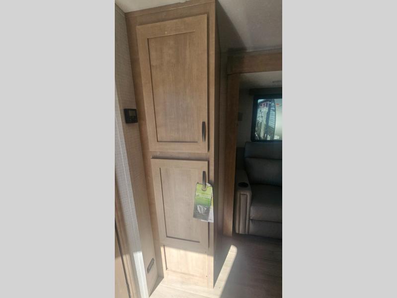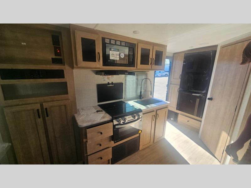 This trailer allows you to camp in comfort at your favorite RV sites thanks to the slide out sofa sleeper with a table to dine at, and the front queen bed to sleep on with dual wardrobes to store your clothing! The galley kitchen includes amenities such as a microwave, a glass top flush mount range, plus an 11 cu. ft. refrigerator. And there is a pantry for your goodies. The corner full bathroom offers a space-savings radius shower and linen storage, and there is an entry closet to keep the main area tidy.