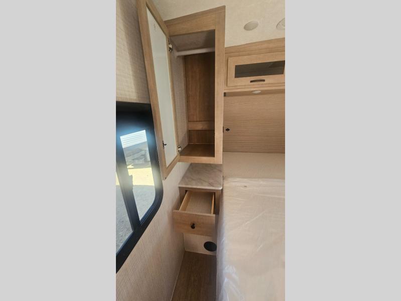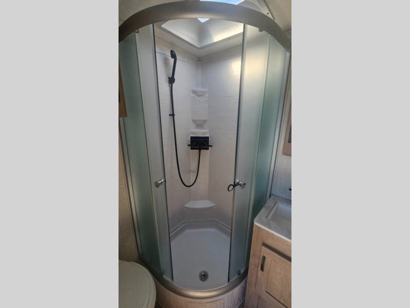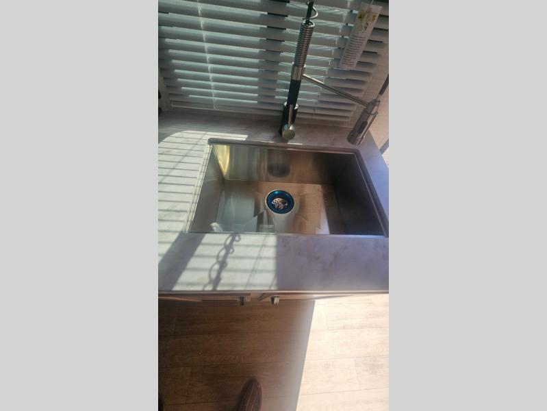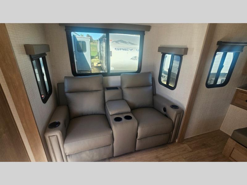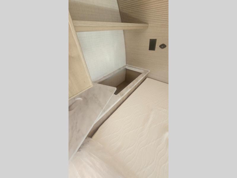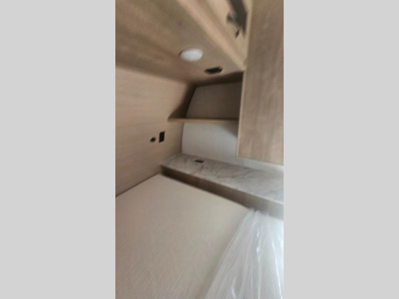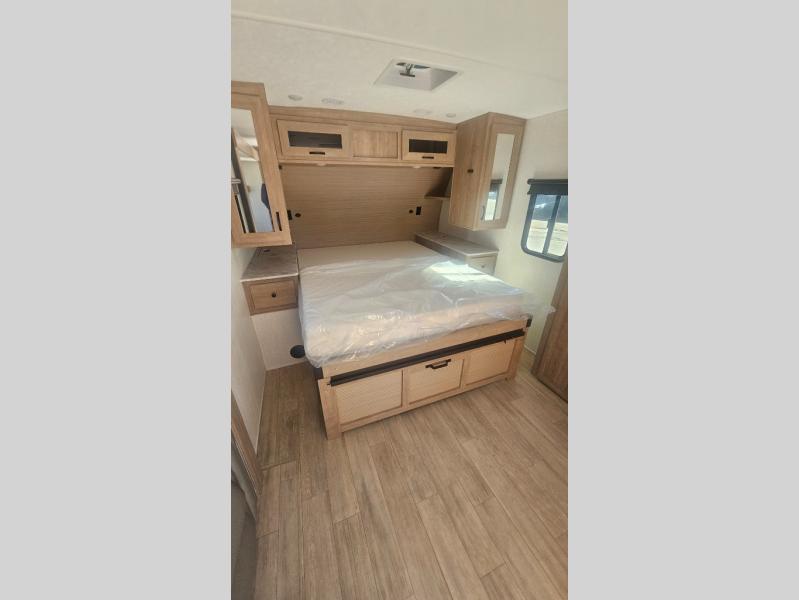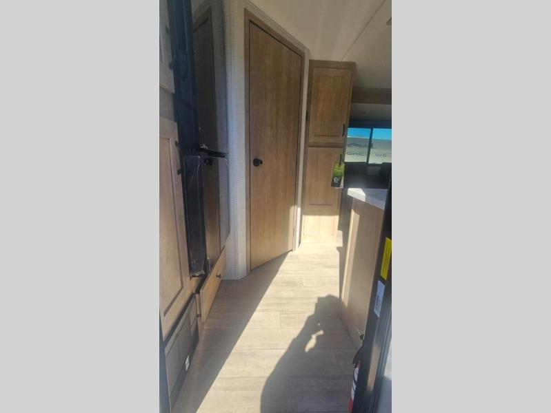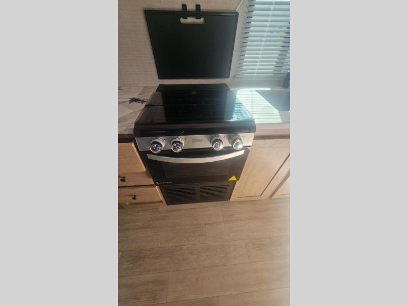 This trailer allows you to camp in comfort at your favorite RV sites thanks to the slide out sofa sleeper with a table to dine at, and the front queen bed to sleep on with dual wardrobes to store your clothing! The galley kitchen includes amenities such as a microwave, a glass top flush mount range, plus an 11 cu. ft. refrigerator. And there is a pantry for your goodies. The corner full bathroom offers a space-savings radius shower and linen storage, and there is an entry closet to keep the main area tidy.