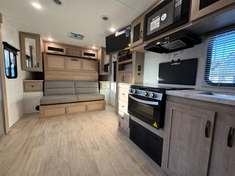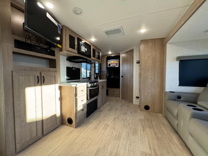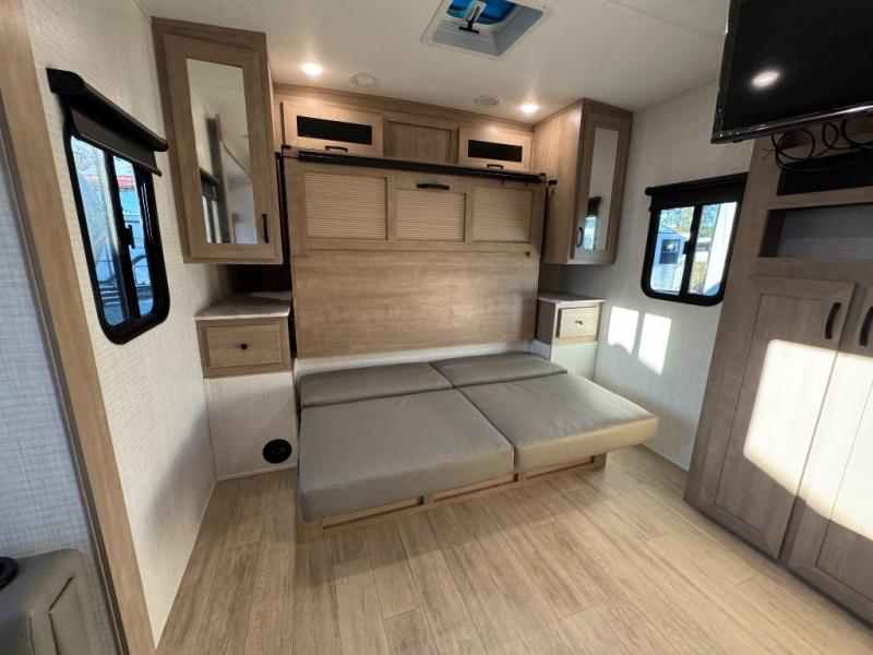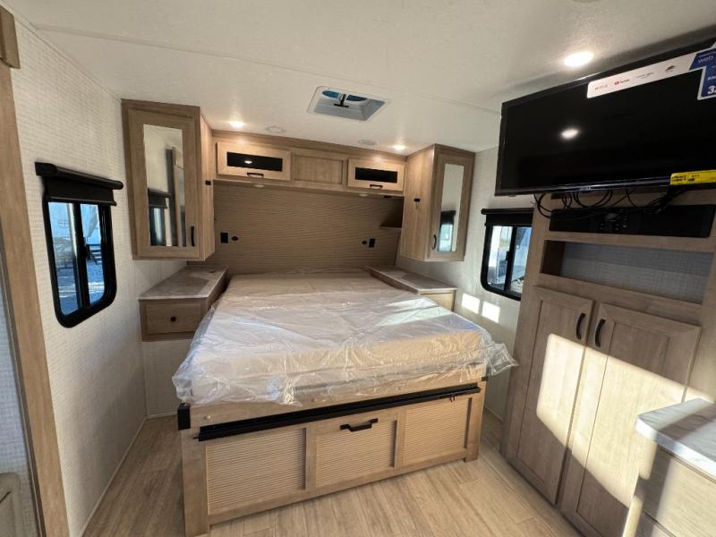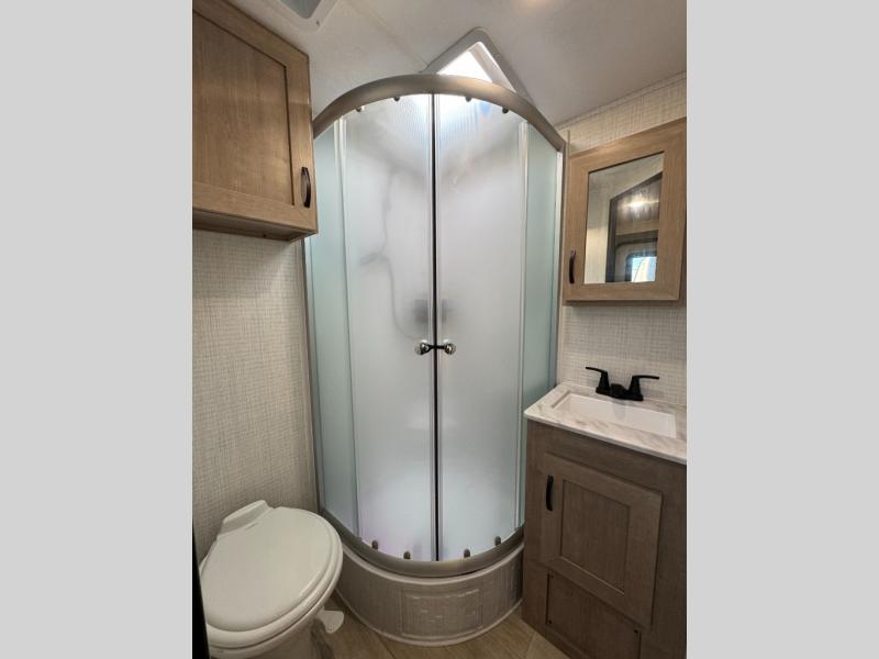 - Power Awning With Led Lights, Aluminum Wheels, Bluetooth Am/Fm Stereo W/Speakers, Power Tongue Jack, 15K BTU Ducted AC, 200W Solar Panel, Tub Surround W/Skylight, Power Vent (Bathroom), Fiberglass Cap, Ball Bearing Drawer Guides, Microwave, Slam Latch Baggage Doors W/Magnets, Black Tank Flush, Stainless Steel Kitchen Sink, Led Interior And Exterior Lights, White Gel Coat Exterior, USB Ports, Roller Shades, 11 Cu Ft Elec Refer, Built W/Azdel Composite, Ladder Bracket, 50 Amp Service, Broad Maple Cabinets