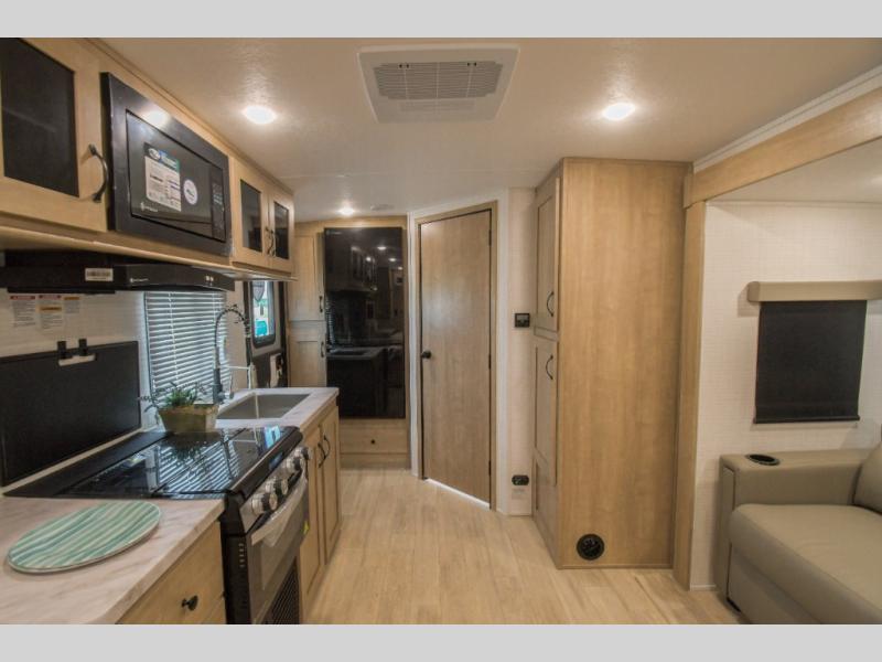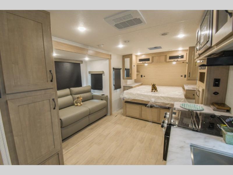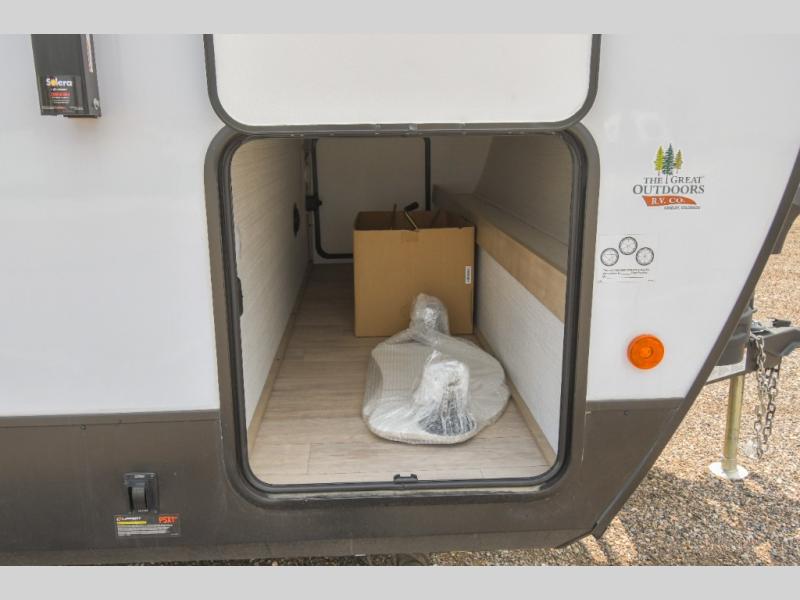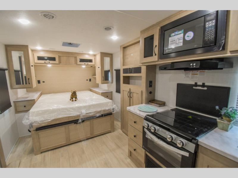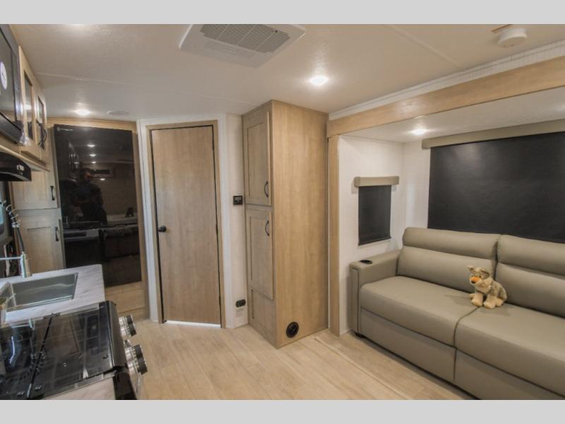 This trailer allows you to camp in comfort at your favorite RV sites thanks to the slide out sofa, and the front queen Murphy bed to sleep on with dual wardrobes to store your clothing! When the bed is put away, you can relax on the jack-knife sofa with storage below for extra blankets or board games. The galley kitchen includes amenities such as a microwave and cooktop to cook meals, plus an 11 cu. ft. electric refrigerator and pantry for food storage. The rear corner full bath offers a space-savings radius shower and linen storage, and there is an entry closet to keep the main area tidy.