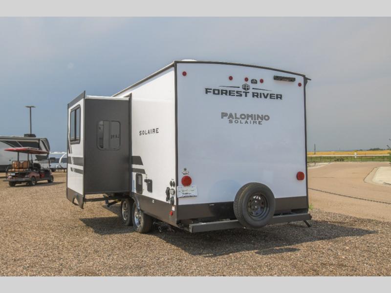 Each SolAire travel trailer by Palomino features a white gel coat exterior and an aluminum superstructure frame for lightweight towing. You will love having a power tongue jack for easy set up, plus slam latch baggage doors with magnets to make unloading easier than ever. There is also a power awning with LED lights and aluminum wheels included on the exterior. Each SolAire is constructed to last with Azdel composite, a fully laminated rear wall and roof, plus a fully enclosed and heated underbelly. The interior includes roller shades and kitchen backsplash, USB ports to keep your electronics charged, a Bluetooth stereo with speakers, and many more stand-out features!