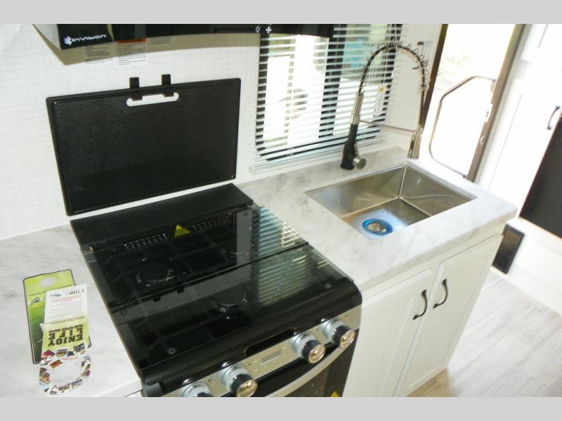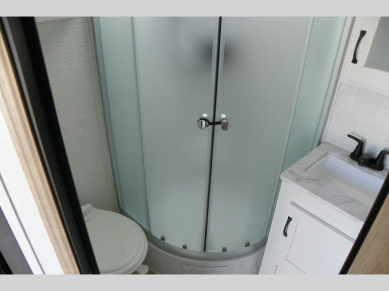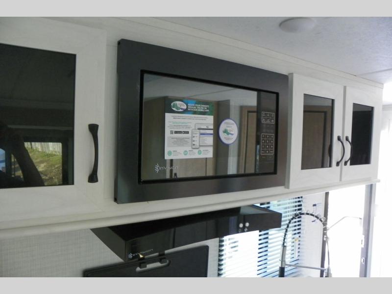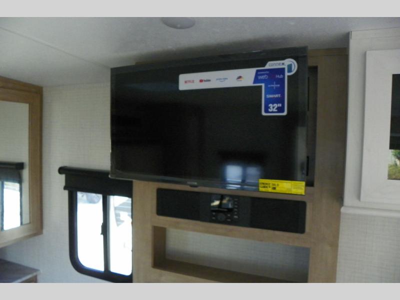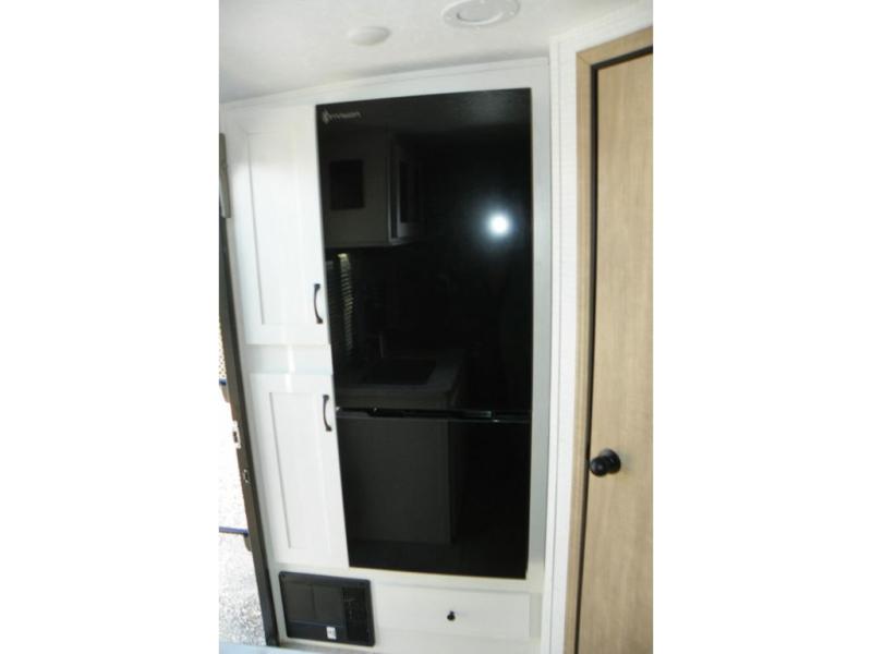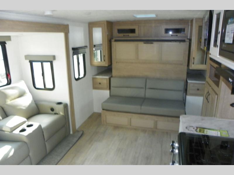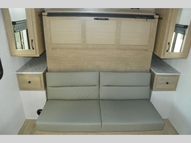 This trailer allows you to camp in comfort at your favorite RV sites thanks to the slide out sofa, and the front queen Murphy bed to sleep on with dual wardrobes to store your clothing! When the bed is put away, you can relax on the jack-knife sofa with storage below for extra blankets or board games. The galley kitchen includes amenities such as a microwave and cooktop to cook meals, plus an 11 cu. ft. electric refrigerator and pantry for food storage. The rear corner full bath offers a space-savings radius shower and linen storage, and there is an entry closet to keep the main area tidy.