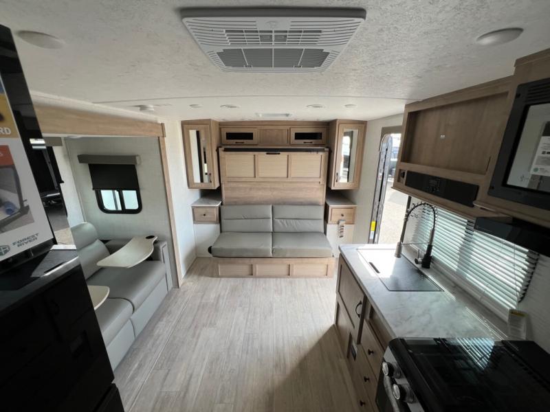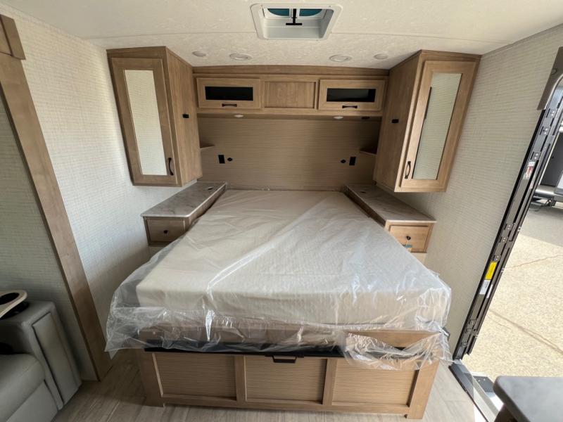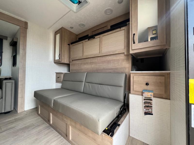 This trailer allows you to camp in comfort at your favorite RV sites thanks to the slide out dinette, convertible bunks, and front queen Murphy bed! When the bed is put away, you can relax on the jack-knife sofa with storage below for extra blankets or board games. If you're needing even more sleeping space, just choose the optional tri-fold sofa in place of the dinette! The galley kitchen includes amenities such as a microwave and cooktop to cook meals, plus an 11 cu. ft. electric refrigerator and pantry for food storage. The rear corner full bath includes a 24" x 36" shower and a linen closet to store clean towels, and the bunk beds are right next to the bath for easy nighttime use!