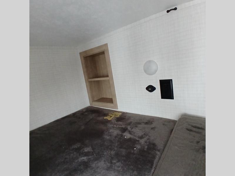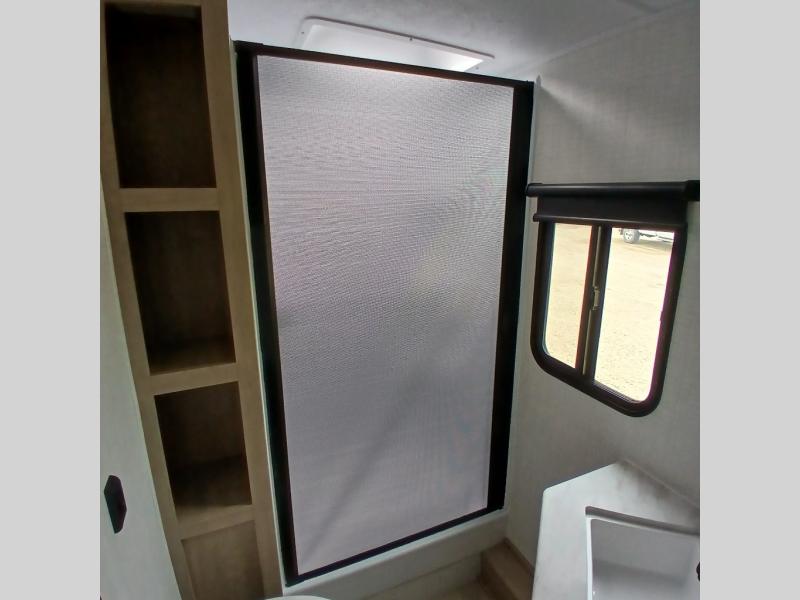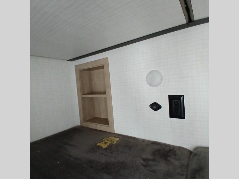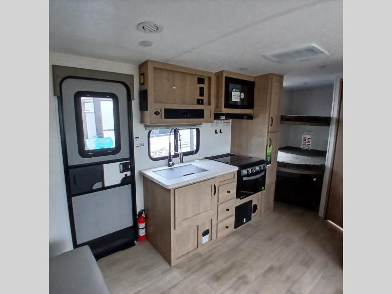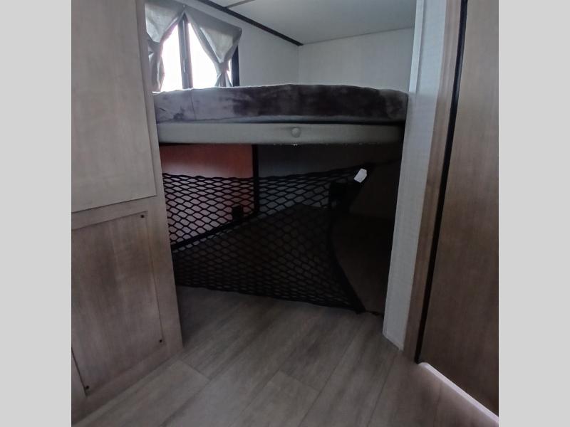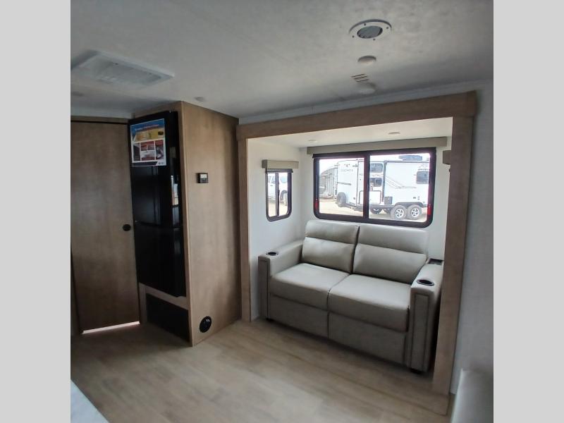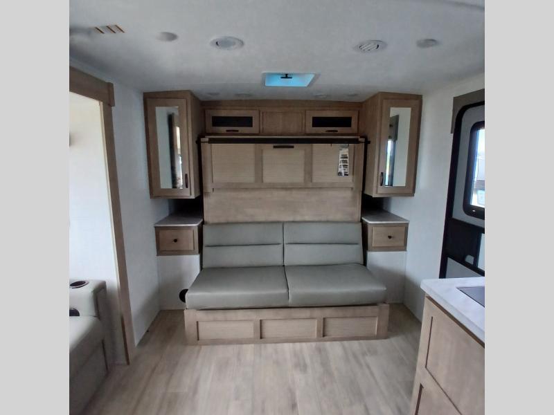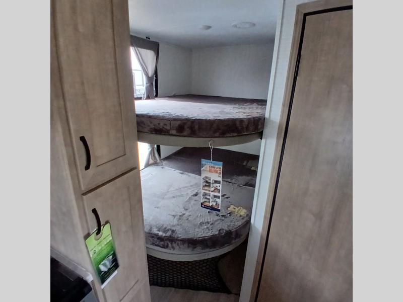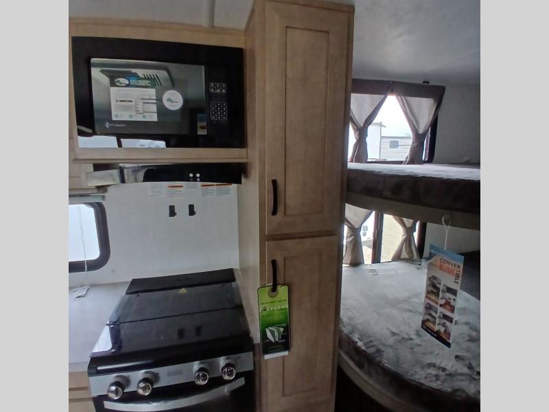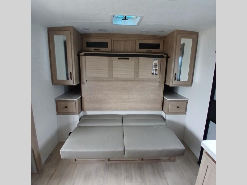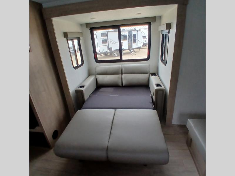 This trailer allows you to camp in comfort at your favorite RV sites thanks to the slide out dinette, convertible bunks, and front queen Murphy bed! When the bed is put away, you can relax on the jack-knife sofa with storage below for extra blankets or board games. If you're needing even more sleeping space, just choose the optional tri-fold sofa in place of the dinette! The galley kitchen includes amenities such as a microwave and cooktop to cook meals, plus an 11 cu. ft. electric refrigerator and pantry for food storage. The rear corner full bath includes a 24" x 36" shower and a linen closet to store clean towels, and the bunk beds are right next to the bath for easy nighttime use!