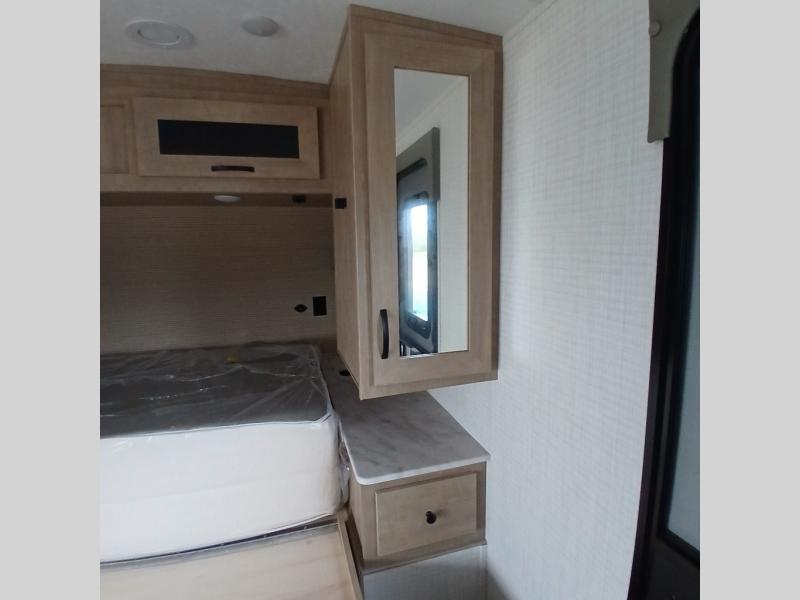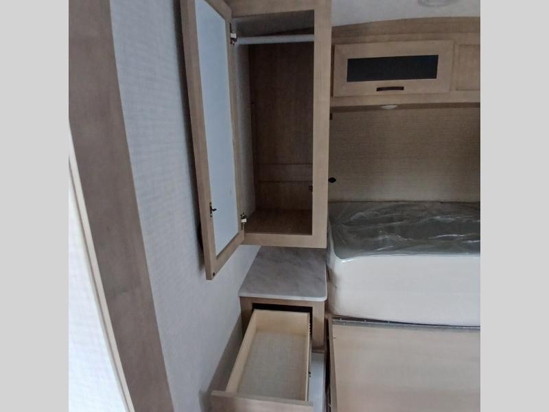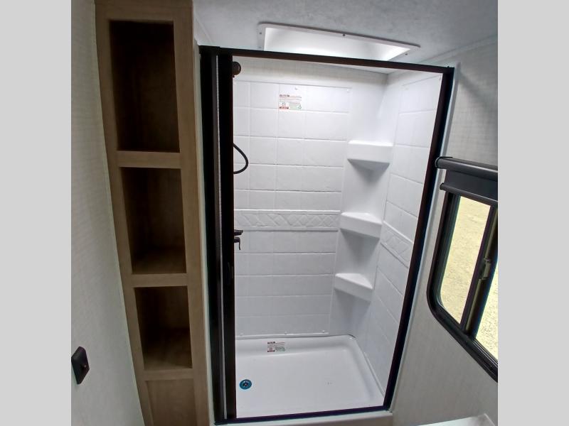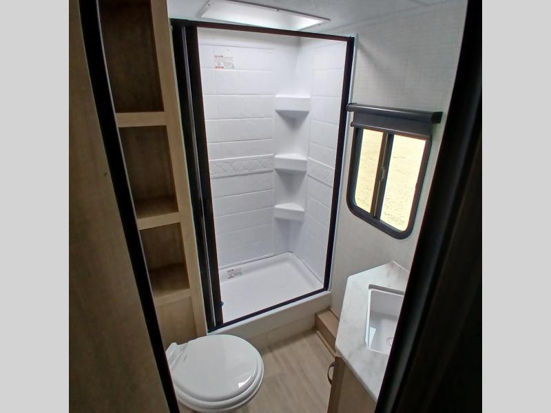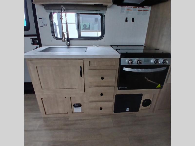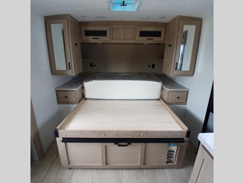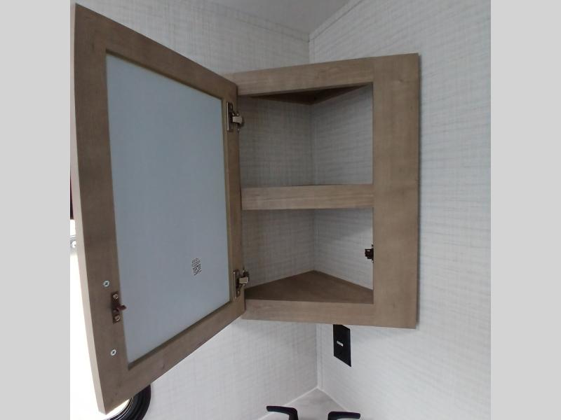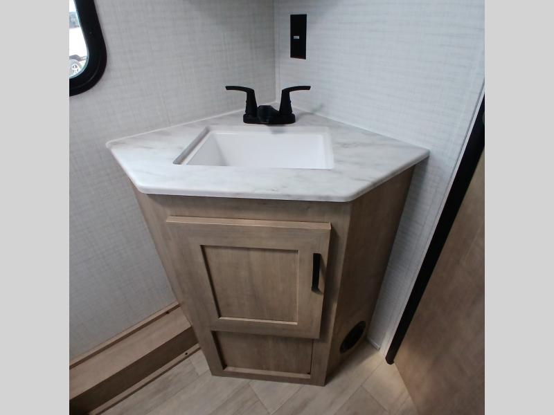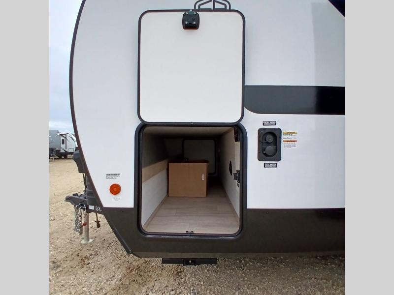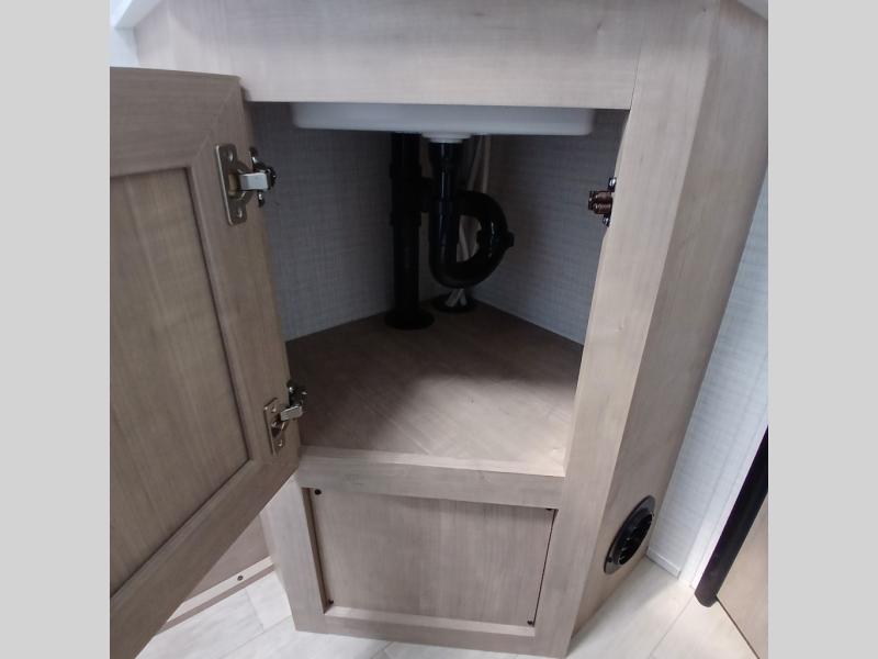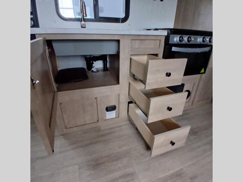 This trailer allows you to camp in comfort at your favorite RV sites thanks to the slide out dinette, convertible bunks, and front queen Murphy bed! When the bed is put away, you can relax on the jack-knife sofa with storage below for extra blankets or board games. If you're needing even more sleeping space, just choose the optional tri-fold sofa in place of the dinette! The galley kitchen includes amenities such as a microwave and cooktop to cook meals, plus an 11 cu. ft. electric refrigerator and pantry for food storage. The rear corner full bath includes a 24" x 36" shower and a linen closet to store clean towels, and the bunk beds are right next to the bath for easy nighttime use!