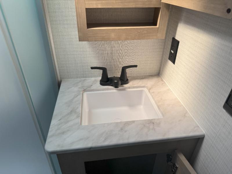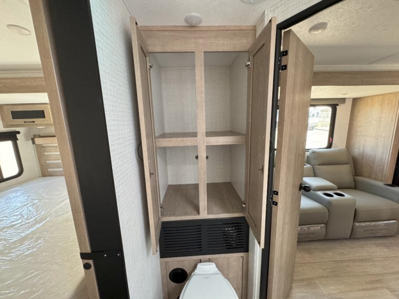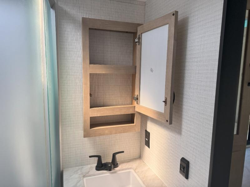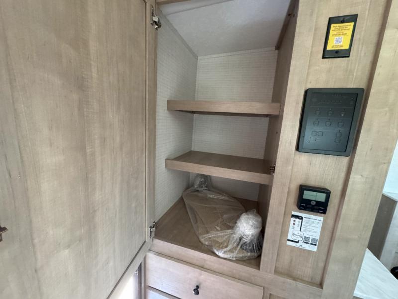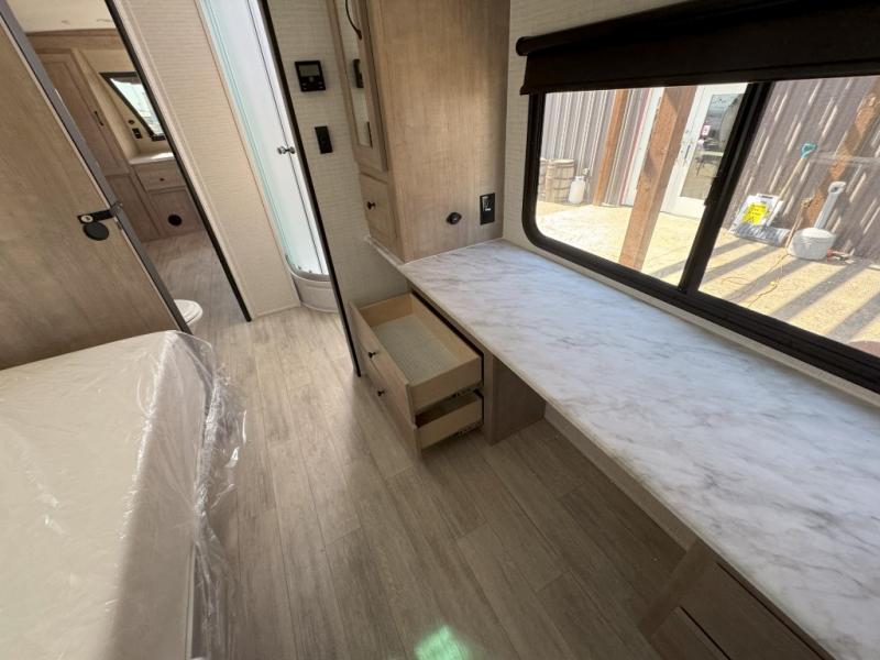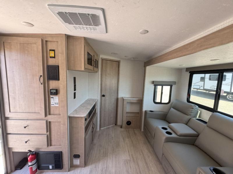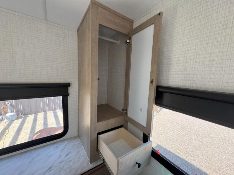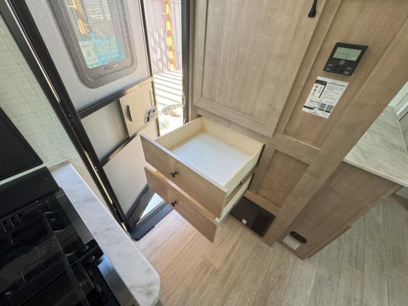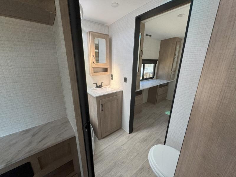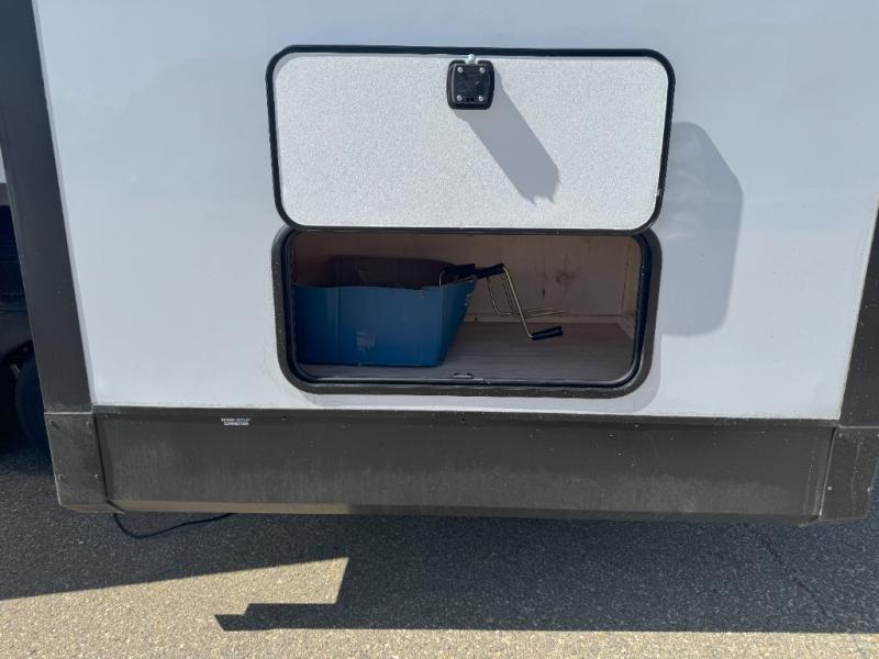 This dual slide out travel trailer will provide at-home comforts while you're at the campground. You will love the rear master bedroom with a king bed slide out and a dual wardrobes for your clothes, plus a desk with drawers to get work done. And the walk-thru bath will be easily accessible. The main living area is spacious with its theater seat slide, plus a front kitchen with ample counter space. There is also a pantry, entryway closet, plus outside storage for your camping gear and belongings.