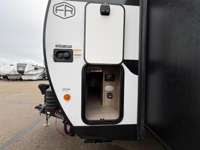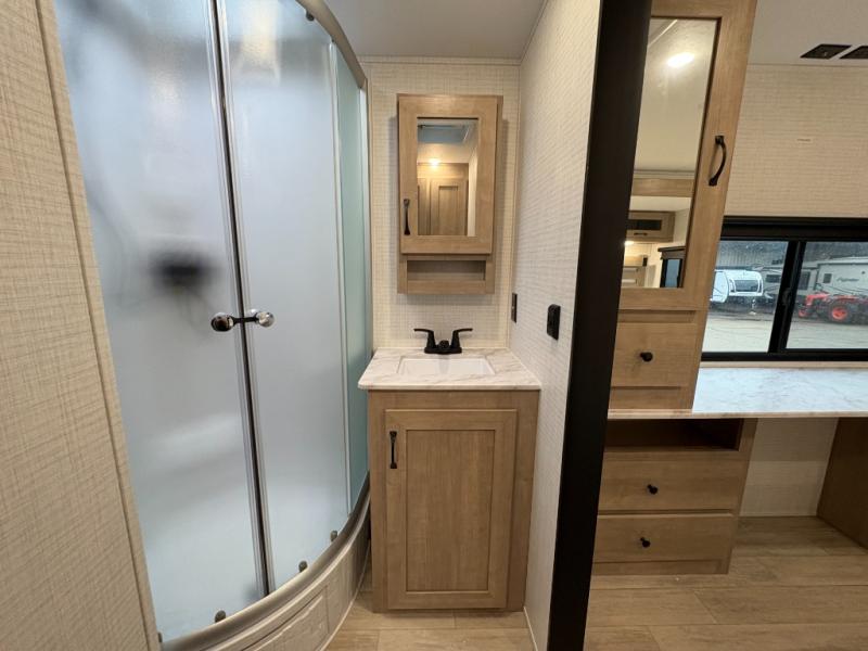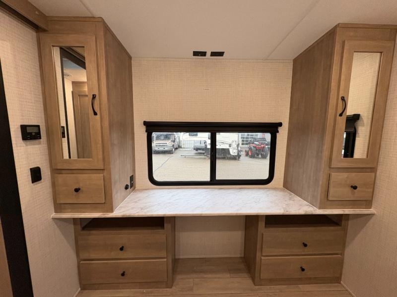 This dual slide out travel trailer will provide at-home comforts while you're at the campground. You will love the rear master bedroom with a king bed slide out and a dual wardrobes for your clothes, plus a desk with drawers to get work done. And the walk-thru bath will be easily accessible. The main living area is spacious with its theater seat slide, plus a front kitchen with ample counter space. There is also a pantry, entryway closet, plus outside storage for your camping gear and belongings.