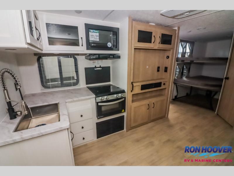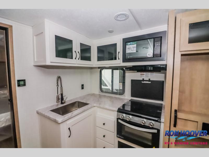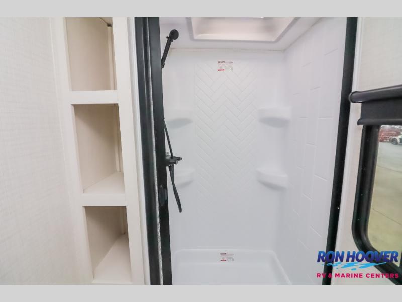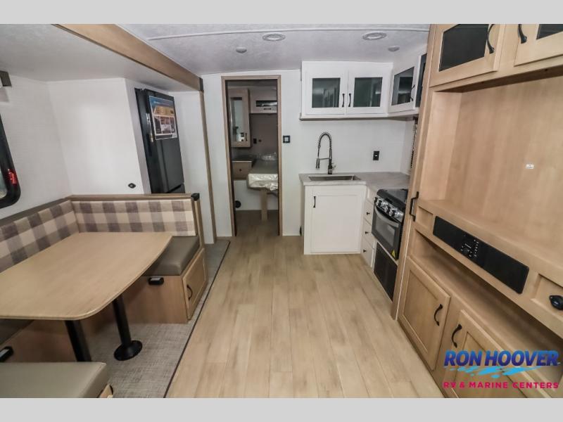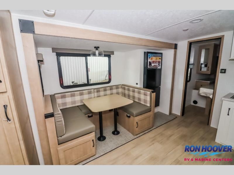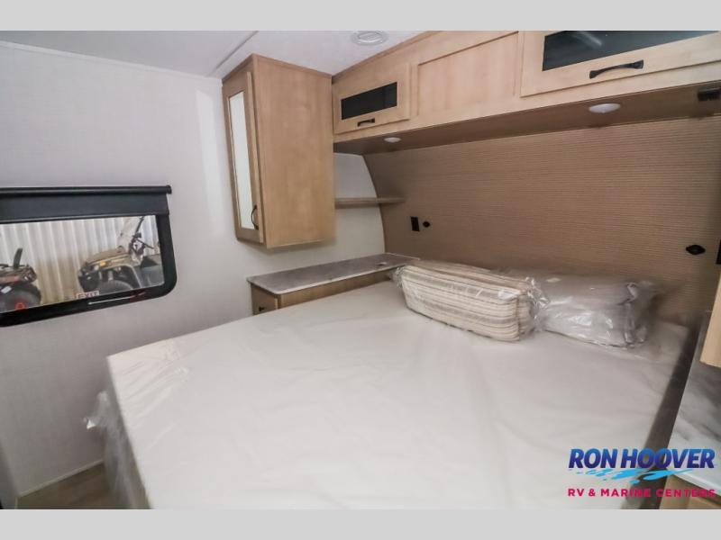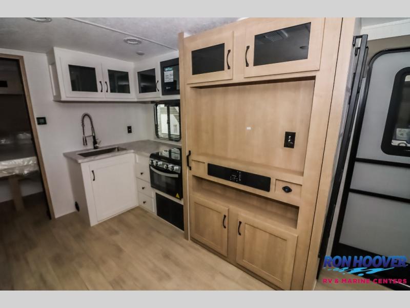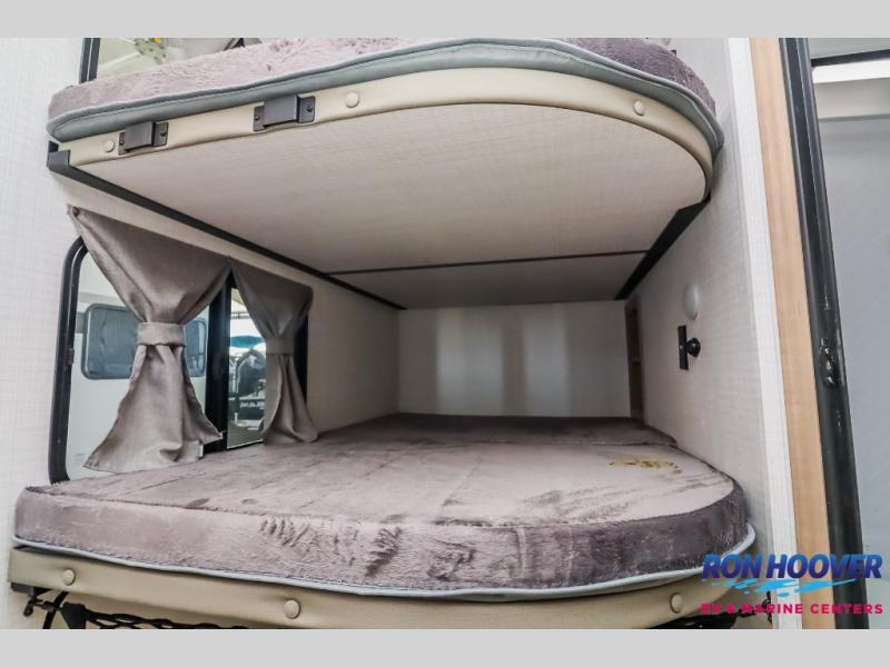 Your friends and family will love camping with you in this trailer that offers sleeping space for eight with the queen bed, the double-size bunks and the U-shaped dinette once it is easily set up for sleeping space. The cook will love the full kitchen with its cooktop, microwave, electric refrigerator plus hidden pantry behind the entertainment center. A full bath with a 30" x 36" shower will let you freshen up each day, and you'll love having your own space in the front private bedroom!