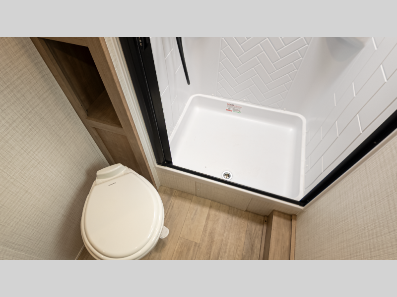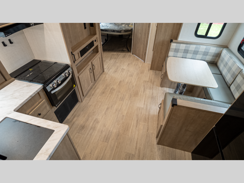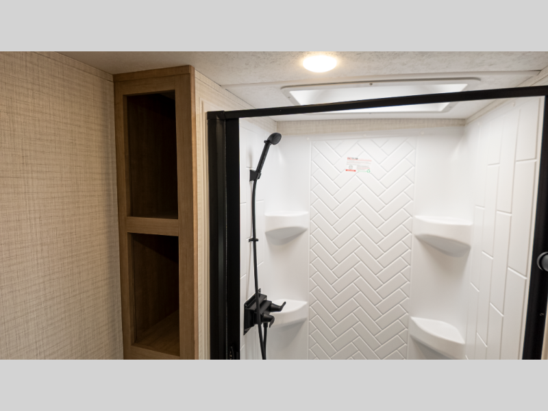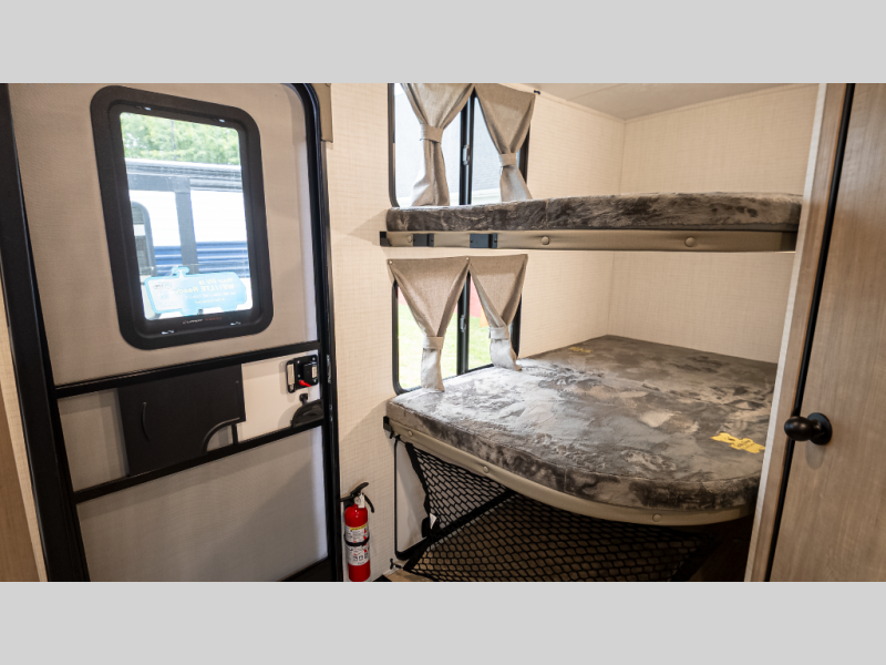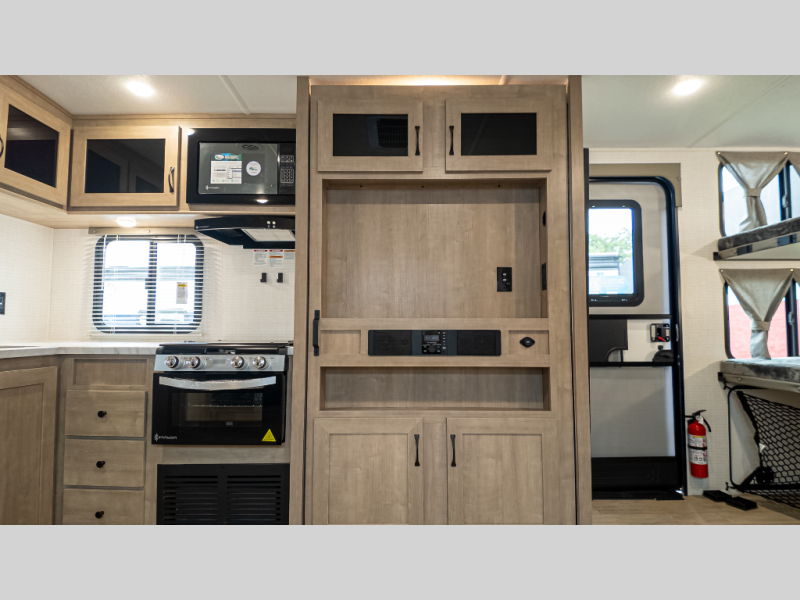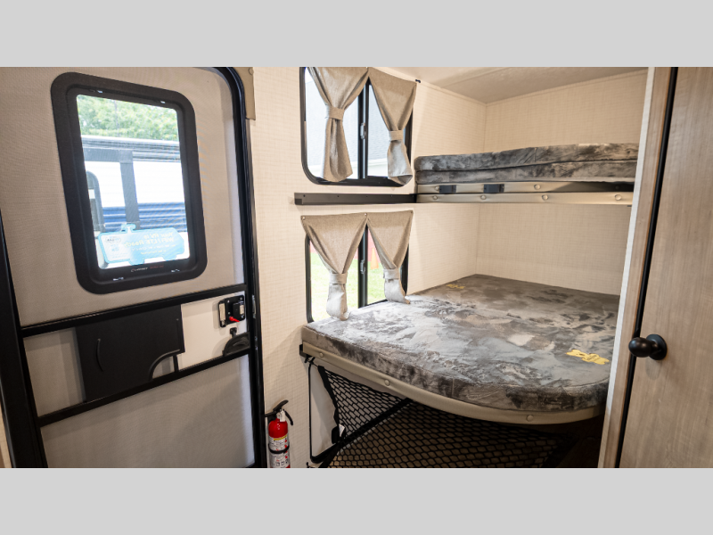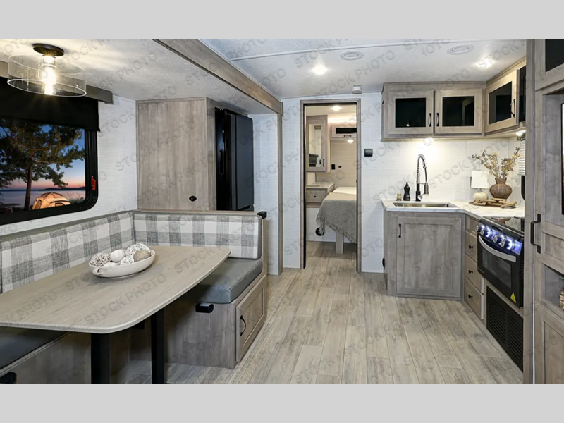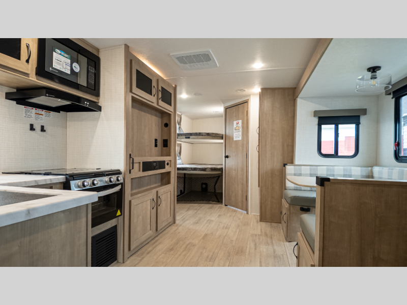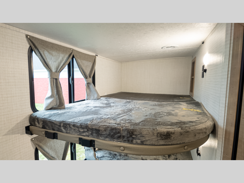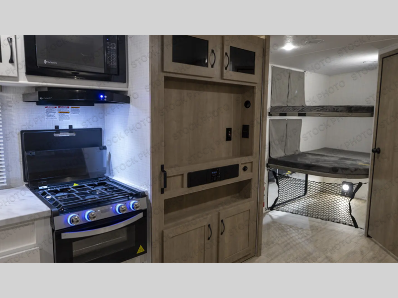 Your friends and family will love camping with you in this trailer that offers sleeping space for eight with the queen bed, the double-size bunks and the U-shaped dinette once it is easily set up for sleeping space. The cook will love the full kitchen with its cooktop, microwave, electric refrigerator plus hidden pantry behind the entertainment center. A full bath with a 30" x 36" shower will let you freshen up each day, and you'll love having your own space in the front private bedroom!