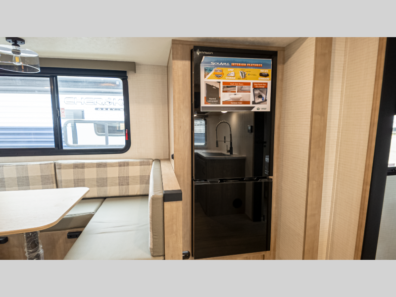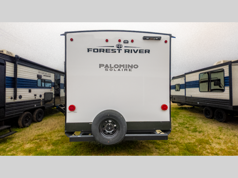 Each SolAire travel trailer by Palomino features a white gel coat exterior and an aluminum superstructure frame for lightweight towing. You will love having a power tongue jack for easy set up, plus slam latch baggage doors with magnets to make unloading easier than ever. There is also a power awning with LED lights and aluminum wheels included on the exterior. Each SolAire is constructed to last with Azdel composite, a fully laminated rear wall and roof, plus a fully enclosed and heated underbelly. The interior includes roller shades and kitchen backsplash, USB ports to keep your electronics charged, a Bluetooth stereo with speakers, and many more stand-out features!