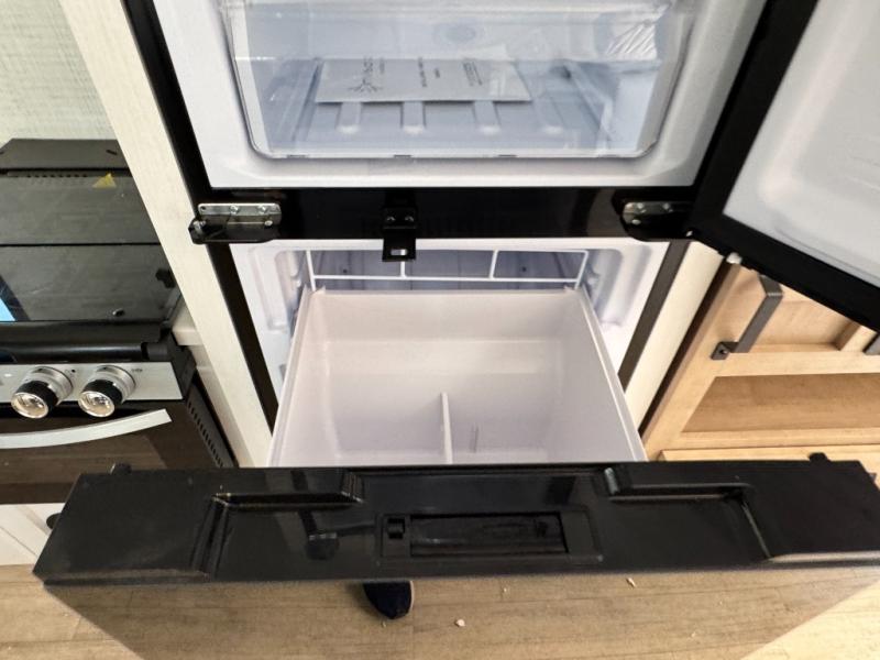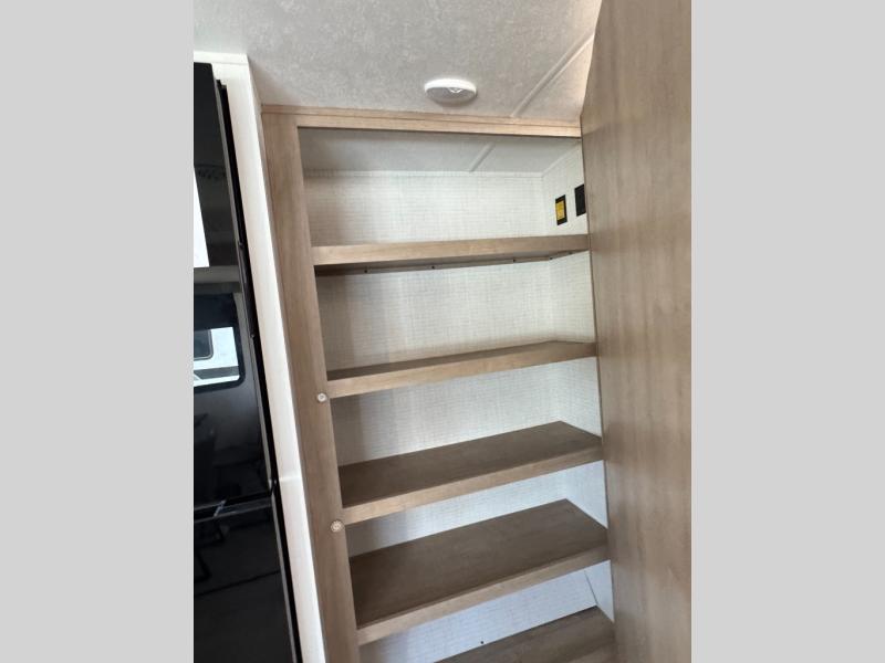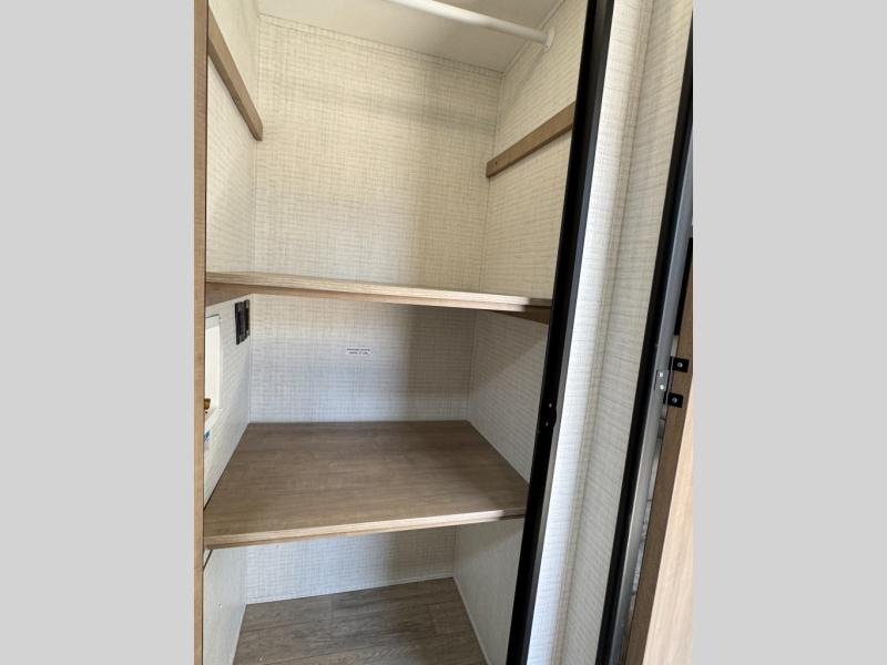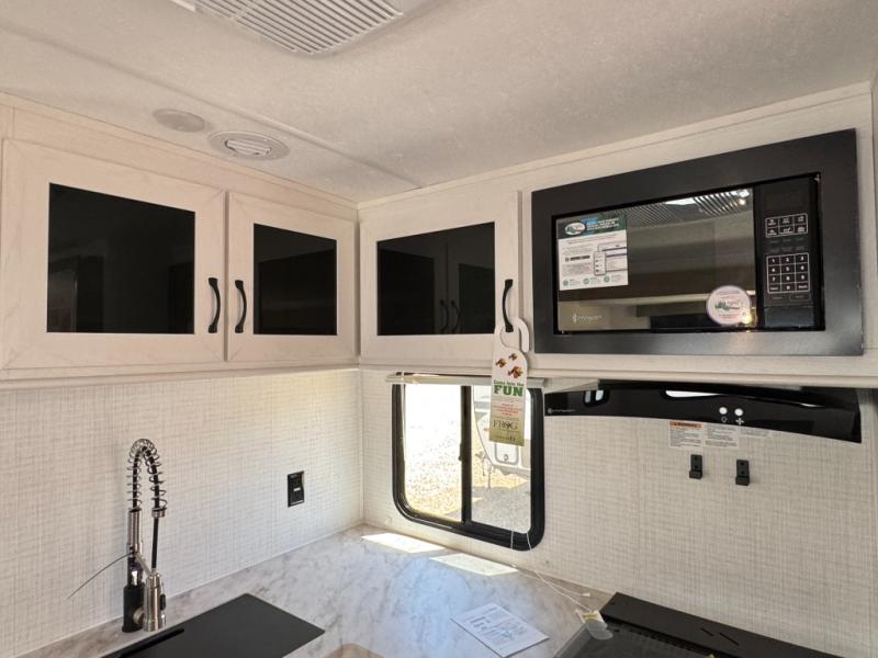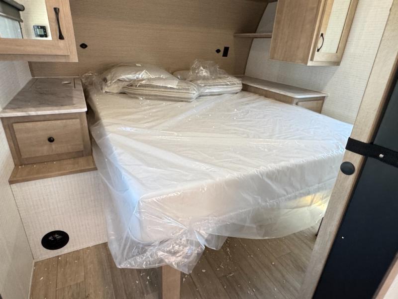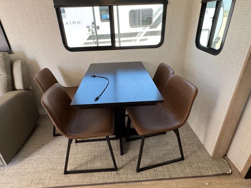 The large slide out in this trailer offers seating and sleeping space on a sofa sleeper and a booth dinette plus adds more floor space to the main living and kitchen area. The rear full bathroom has a 30" x 48" shower with a seat and a linen closet for towels and such, and the front bedroom includes a queen bed and clothing storage plus windows for views of your campsite. The cook will have the choice of making meals inside with full amenities including an 11 cu. ft. refrigerator and an L-shaped counter or outdoors on the outside kitchen. The 21' power awning provides an outdoor living area protected from the elements, and the exterior offers a drop frame pass-thru for ample storage space!